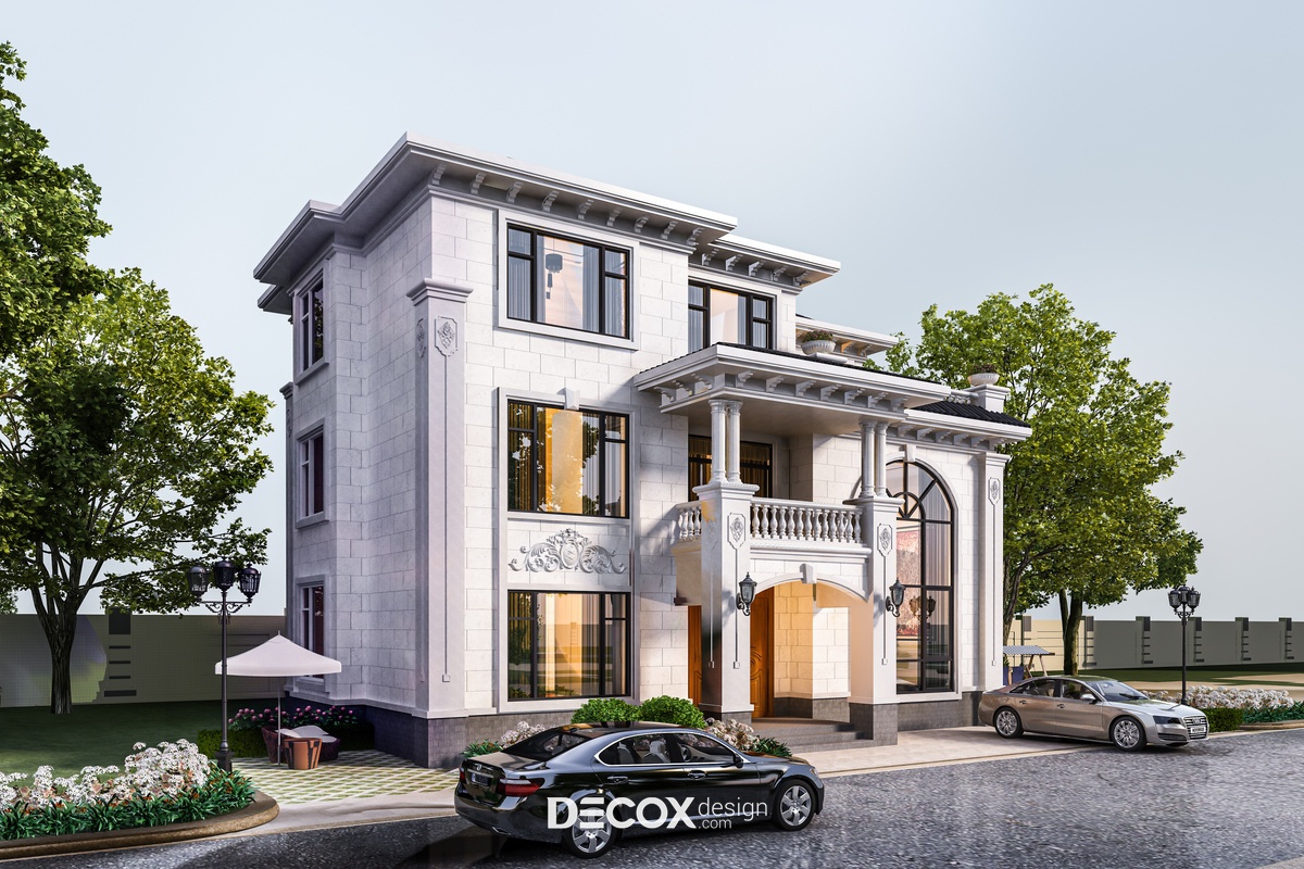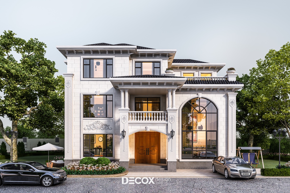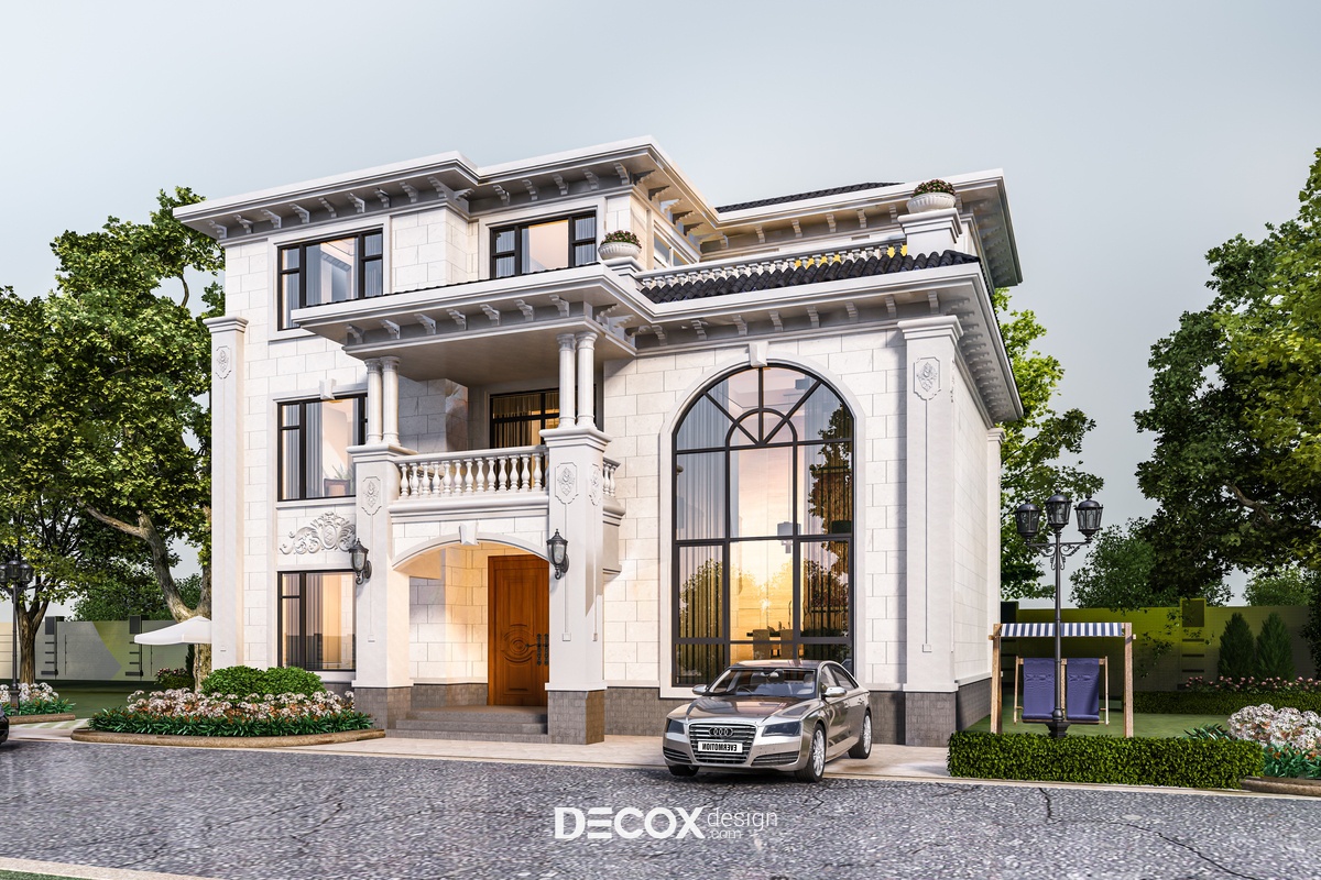 Thiết kế biệt thự 2 tầng chủ yếu sử dụng tone trắng cho màu tường kết hợp cùng chất liệu cửa kính mang đến cảm giác tinh tế, hiện đại. Để tô điểm phần "cổ điển" trong phong cách, KTS đã lồng ghép thêm những đường nét hoa văn nhẹ nhàng, mềm mại chạm khắc trên tường và thức cột. Bên cạnh đó, khu vực cửa chính được làm từ chất liệu gỗ tự nhiên vô cùng nổi bật so với các phần còn lại cũng là điểm nhấn đáng chú ý ở phần kiến trúc biệt thự. Ngoài ra, KTS Decox Design còn chọn lựa mái thái có tone đen, việc chọn lựa màu sắc có sắc thái tương phản với màu chủ đạo như thế này càng giúp cho tổng thể bắt mắt và thu hút hơn.
