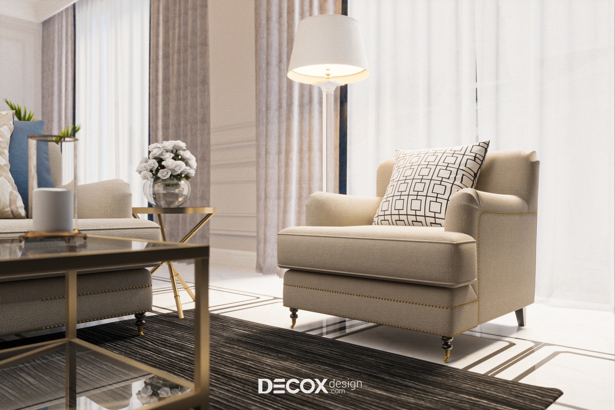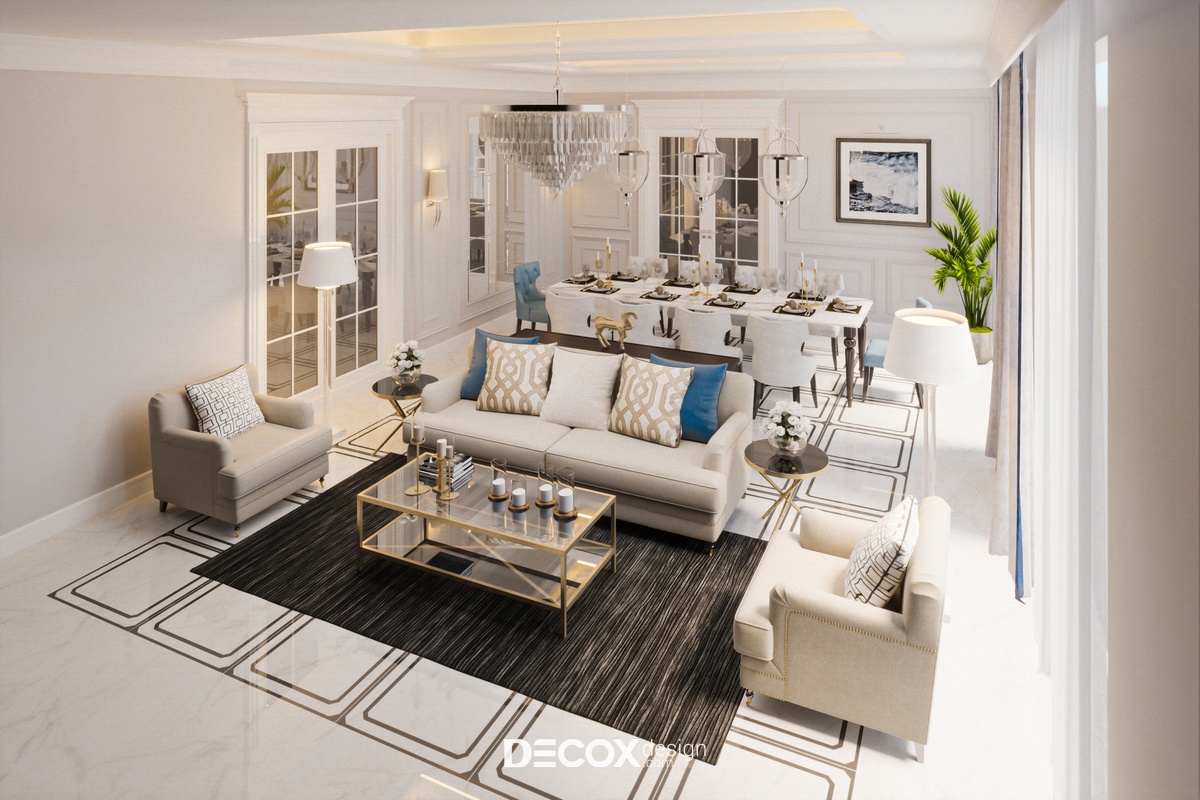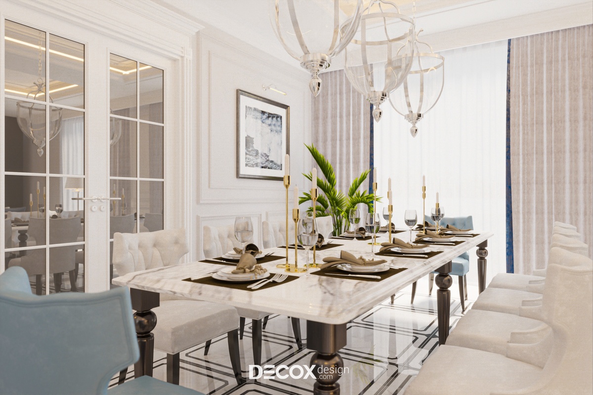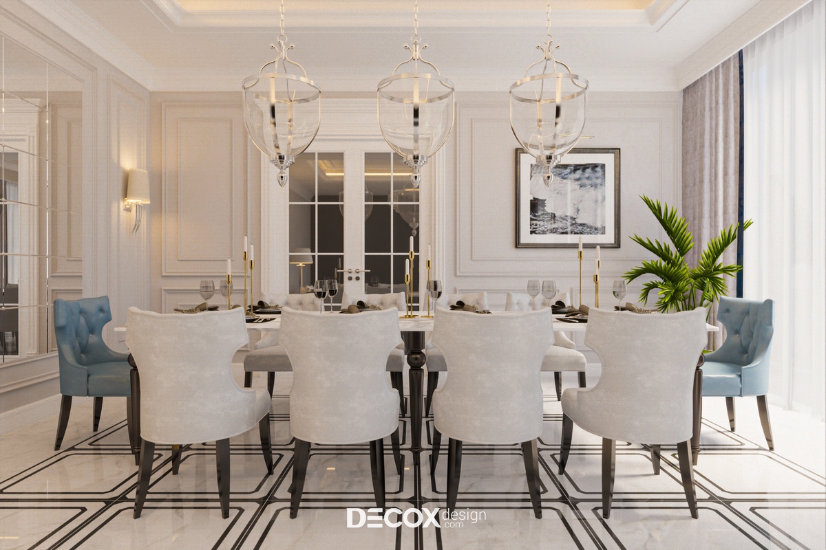 Thông qua cách bố trí nội thất đơn giản, tinh gọn có thể thấy thiết kế nội thất mang thiên hướng công năng nhiều hơn tuy nhiên không vì thế mà ảnh hưởng đến sự thẩm mỹ của biệt thự. Với các chi tiết kẻ phào bo góc uốn lượn mềm mại trên trần và tường kết hợp nội thất cao cấp cùng cách phối màu hiệu quả đã giúp không gian thăng hạng thẩm mỹ. Ngoài ra, đèn chùm sang trọng được bố trí nhấn điểm ở các khu vực chính như phòng khách, phòng ăn, phòng ngủ cũng là một chi tiết ấn tượng, thu hút sự chú ý của người nhìn khi đến với thiết kế nội thất biệt thự này.