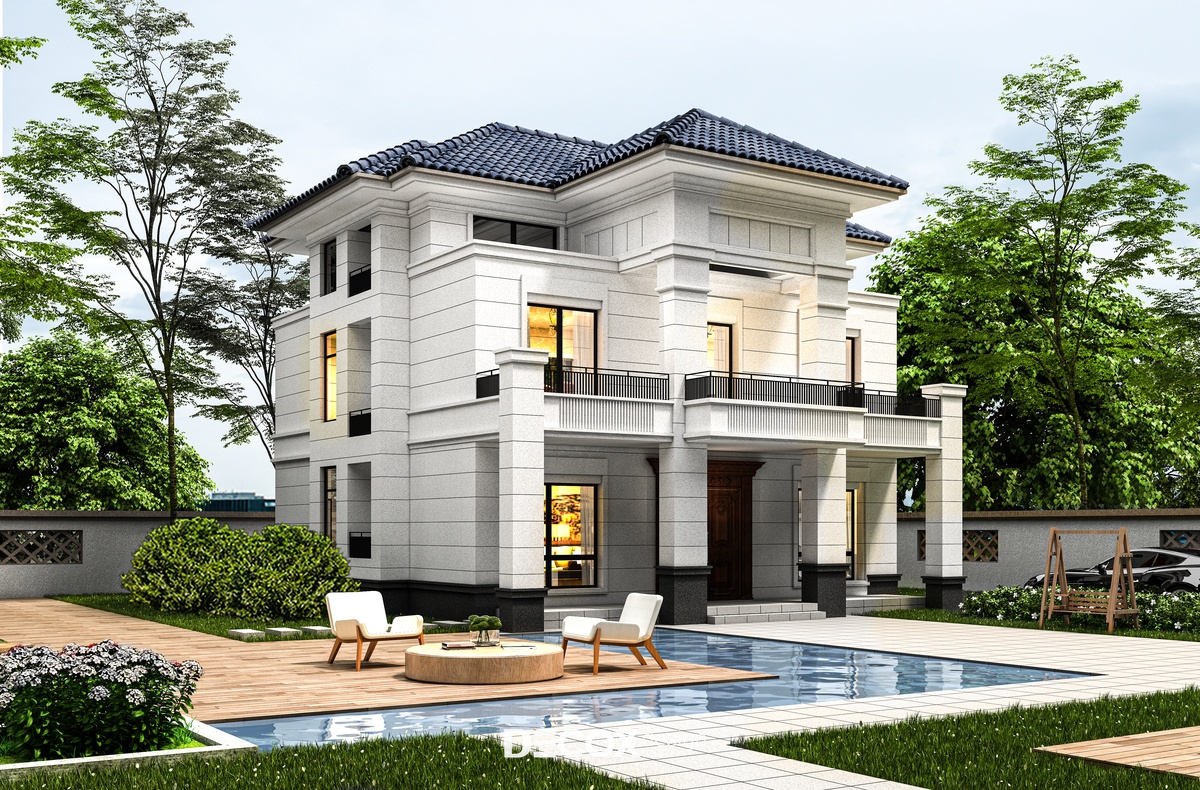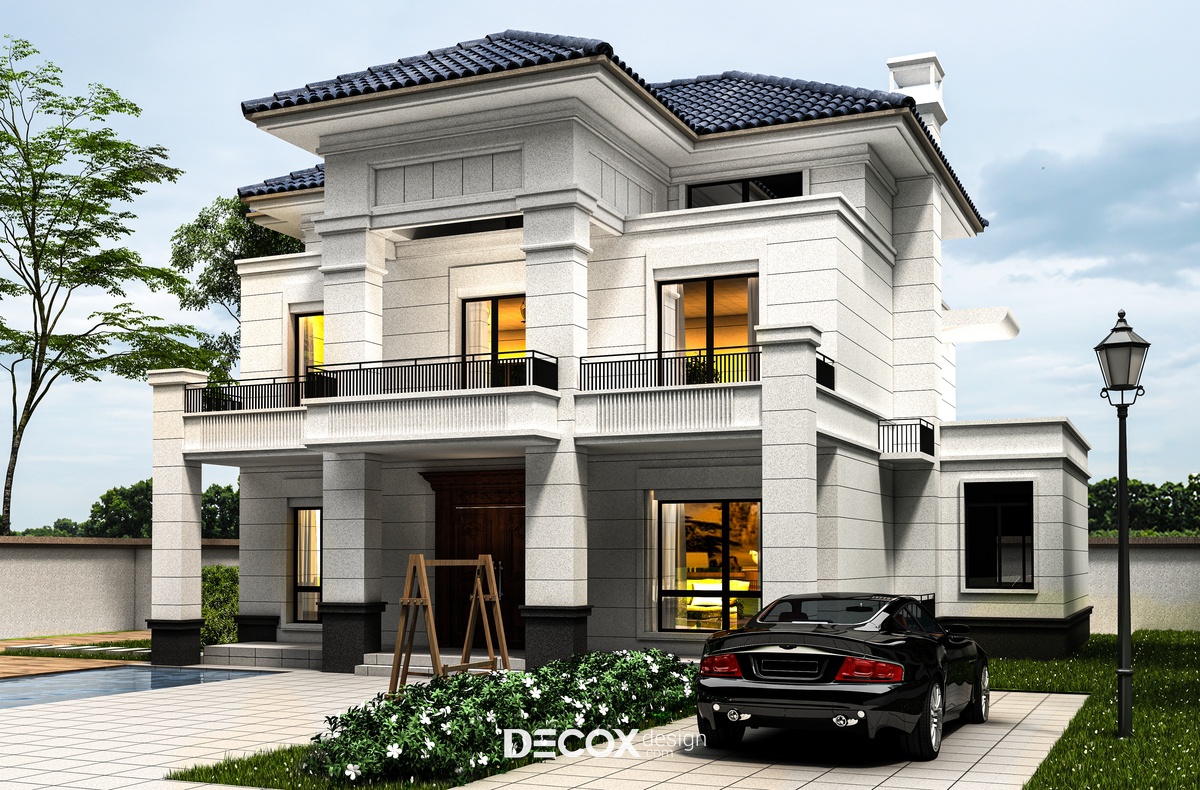 Mẫu biệt thự vườn do đội ngũ KTS Decox Design thiết kế và thi công có diện tích lý tưởng lên đến 1200m2. Nhìn từ xa chúng ta có thể thấy được kiến trúc biệt thự nguy nga được thiết kế theo phong cách bán cổ điển với tone màu trung tính chủ đạo. Hệ mái thái lợp ngói màu xanh càng thêm phần nổi bật trên nền tường xám. Nhằm phục vụ tốt nhất cho việc nghỉ ngơi và thư giãn của gia đình ngoài thiết kế kiến trúc biệt thự 2 tầng chúng tôi còn dành nhiều không gian cho phần ngoại cảnh sân vườn.