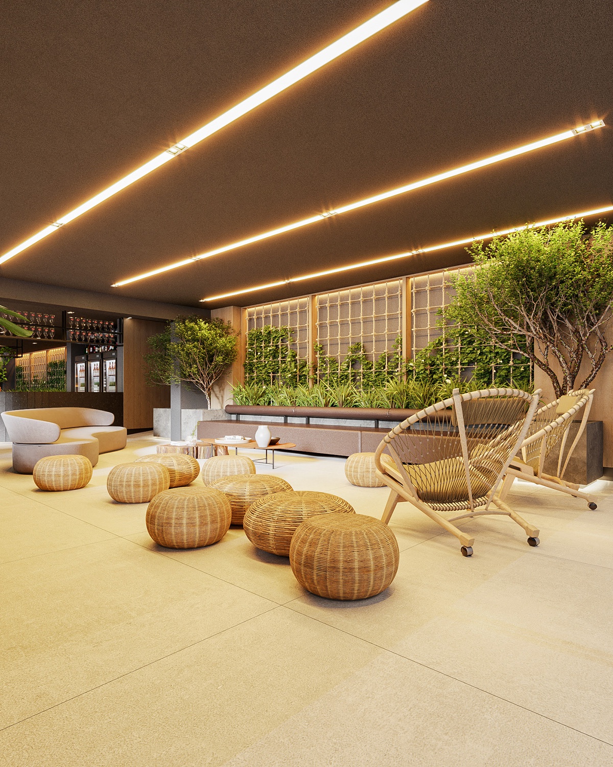 Chất liệu, nội thất gỗ và cây xanh trang trí xuất hiện xuyên suốt trong toàn bộ tổng thể