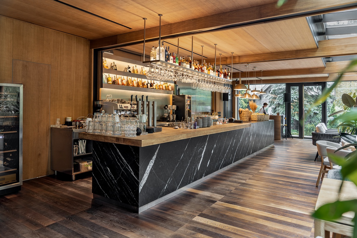 Khu vực quầy bar được thiết kế bên trong không gian nhà hàng
