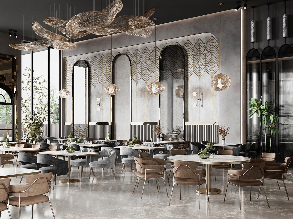 Sang trọng, cao cấp nhưng không quá nặng nề bởi nhiều chi tiết như phong cách cổ điển, thiết kế nội thất nhà hàng tân cổ điển là sự lựa chọn thích hợp để thể hiện độ xa xỉ của nhà hàng nhưng vẫn giữ được nét nhẹ nhàng, tinh tế, hợp xu hướng thời đại. Ngoài những đường phào chỉ, hoa văn uốn lượn bắt mắt, chất liệu sử dụng trong nhà hàng tân cổ điển cũng xuất phát từ những chất liệu đắt đỏ như da, nhung, pha lê, các chi tiết mạ vàng sang trọng…Và để thể hiện hoàn mỹ vẻ đẹp tân cổ điển thiết kế nhà hàng cần có không gian rộng rãi, giàu chiều sâu.