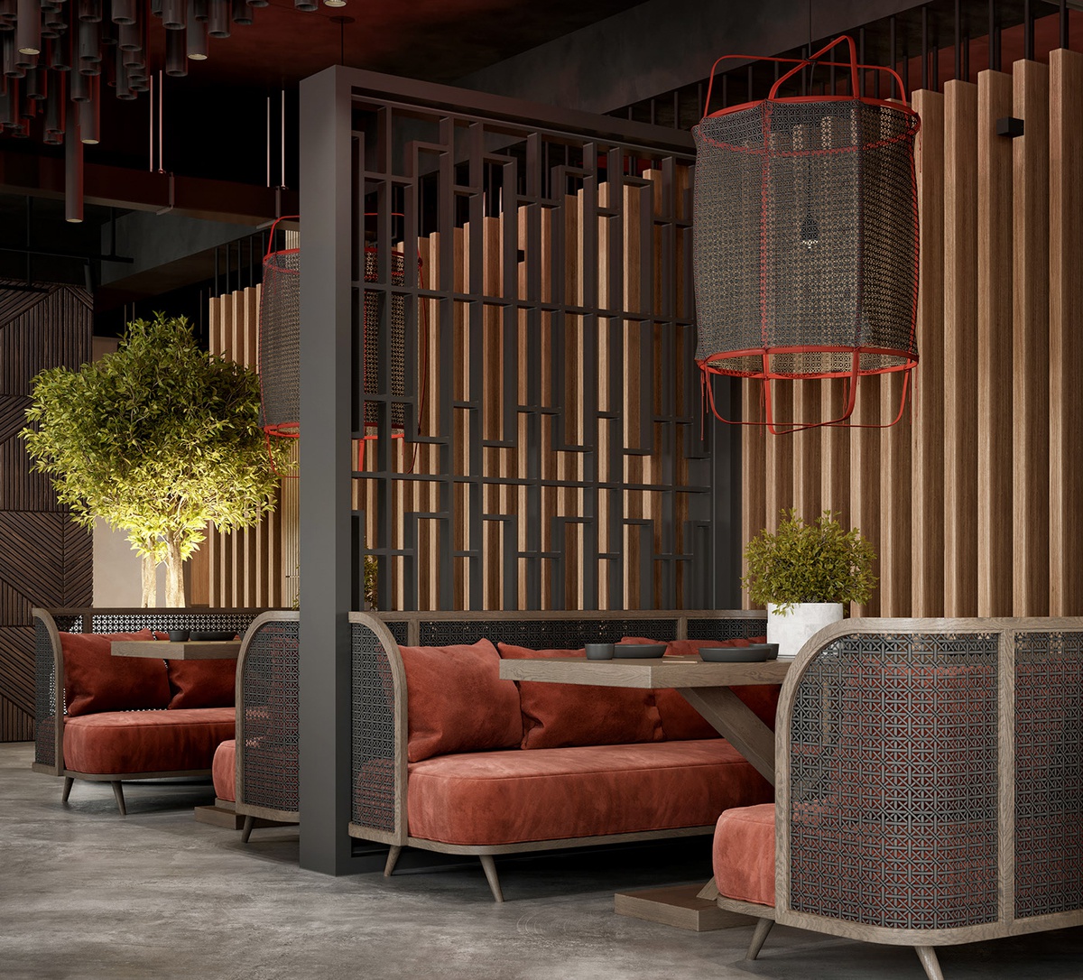 Sắc đỏ mang ý nghĩa may mắn thường được sử dụng làm điểm nhấn trong nhà hàng kiểu Hoa