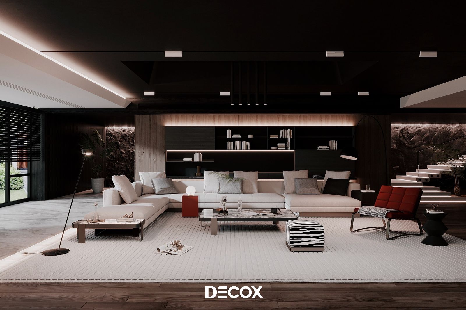 Nếu kiến trúc là chiếc áo đẹp thì nội thất lại là vẻ đẹp đến từ sâu trong tâm hồn, làm nên giá trị, khẳng định “cốt cách” của thiết kế. Vậy nên, một công trình chỉ thật sự “đẹp” khi có sự giao hòa, đồng điệu và kết nối giữa nội - ngoại thất. Bởi lẽ đó, bảng màu chủ đạo trong không gian nội thất chính là những gam màu trung tính quen thuộc đã xuất hiện ở phần kiến trúc: đen, trắng và xám. Thiết kế nội thất còn ghi điểm ấn tưởng bởi cách phối ngẫu giữa các loại chất liệu, màu sắc tưởng chừng như “lộn xộn” nhưng lại có chủ đích. Ví như tone đỏ “nóng bỏng” mang sắc thái đối lập đầy nổi bật trên nền màu tối chủ đạo hay sự cứng rắn, lạnh lẽo của bề mặt đá, kim loại đã được cân bằng thông qua sự bổ sung chất liệu gỗ, vải vào không gian.
