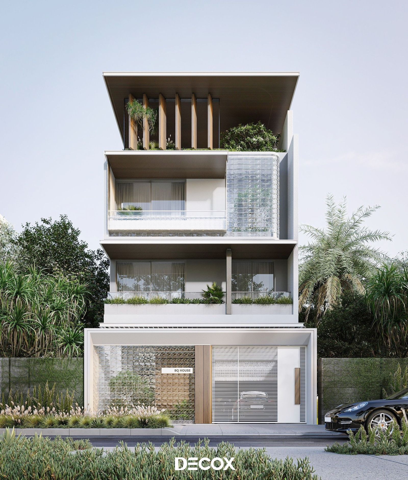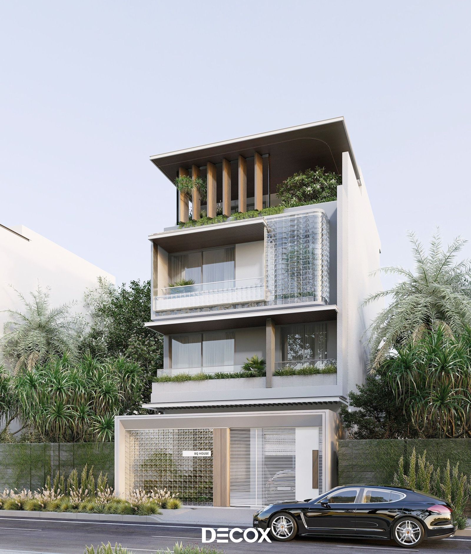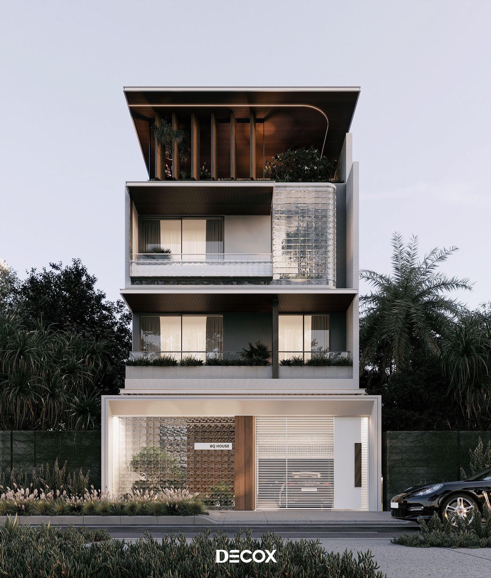 Dự án thiết kế và thi công lần này mà Decox Design đảm nhận là một căn nhà phố có kết cấu 4 tầng nhỏ xinh mang tên BQ House. Với bộ tiêu chí đơn giản, sang trọng đồng thời hàm chứa nét đẹp thuần Việt, KTS của Decox đã lựa chọn thiết kế kiến trúc theo phong cách hiện đại, thời thượng. Tổng thể ngôi nhà là sự pha trộn giữa sắc trắng cùng một chút nâu mộc mạc như một ly cà phê sữa đầy chất vị, có đắng có ngọt hòa quyện đầy tinh tế. Không chỉ bứt phá trong việc sử dụng bảng màu “tuy quen mà lạ”, điểm nhấn đặc biệt của dự án còn nằm ở việc lồng ghép yếu tố gạch kính vào công trình. Thiết kế gạch kính không chỉ gợi cảm giác quen thuộc, mang hương vị của một Việt Nam thuở xưa cũ nhưng cũng đã được biến tấu phá cách để thích hợp với xu hướng thời đại, mang đến điểm nhấn đặc sắc cho nhà mà đây còn là giải pháp lấy sáng hiệu quả cho căn nhà luôn tràn ngập năng lượng và sinh khí.