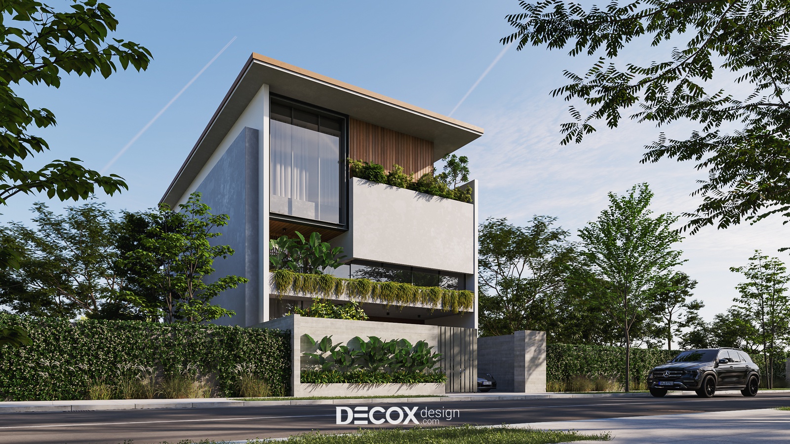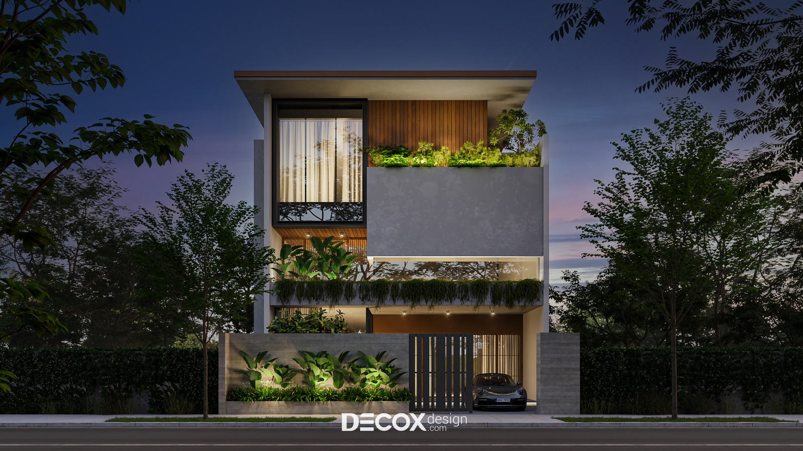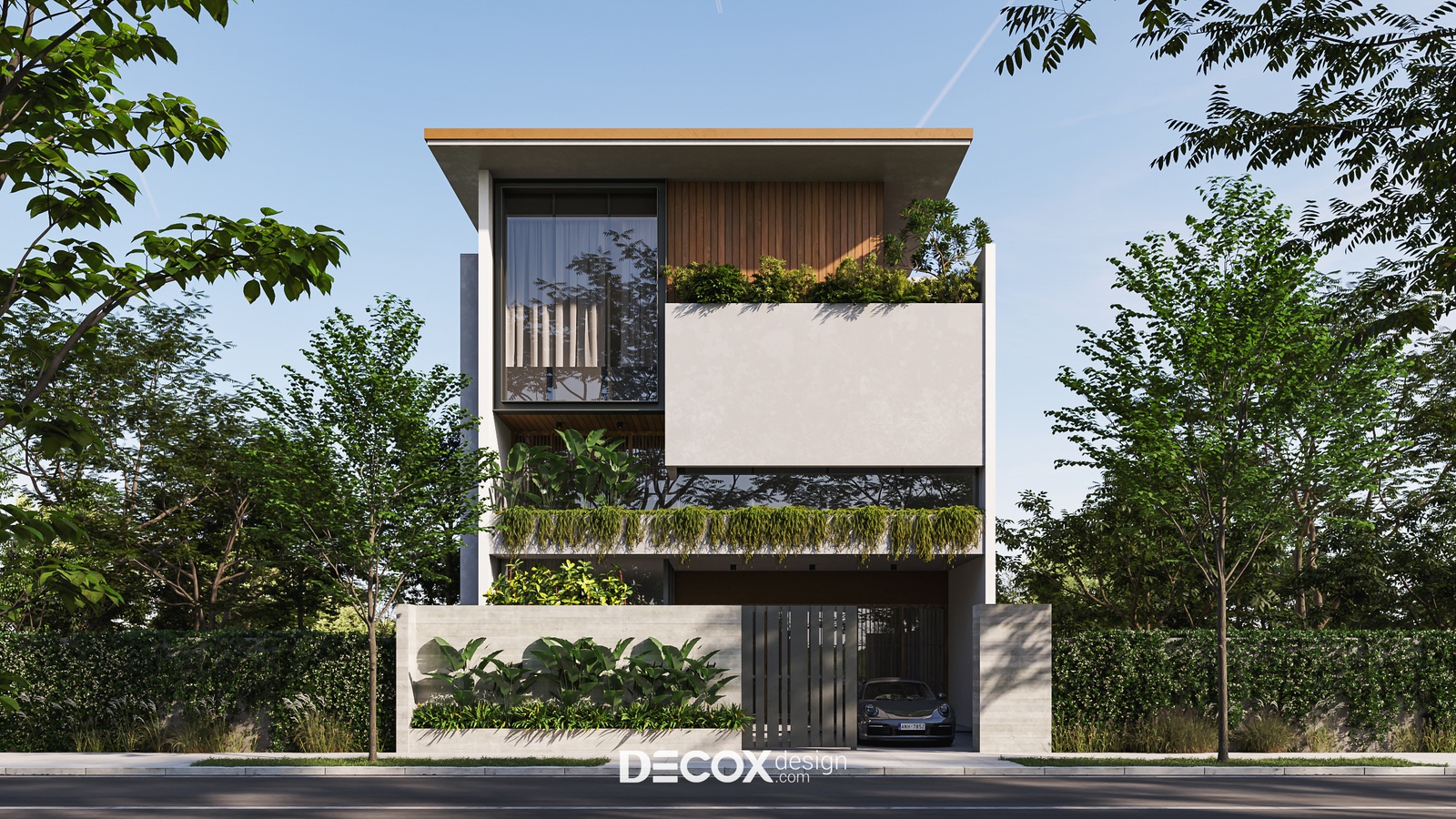 Thiết kế ấn tượng với phá cách trong bố cục hình khối, chất liệu sử dụng, đồng thời mang đến một không gian sống mộc mạc, kết nối thiên nhiên thông qua chi tiết lam gỗ và trồng cây xanh dọc theo hành lang các tầng. Bên cạnh đó, sự đan xen giữa các chất liệu bê tông, kính và gỗ theo nguyên tắc bất đối xứng cũng đem đến một điểm nhấn nhá đầy thú vị cho công trình này. Sau đây, Decox Design mời bạn cùng “khám phá” không gian ngoại thất của căn nhà phố hiện đại này nhé.