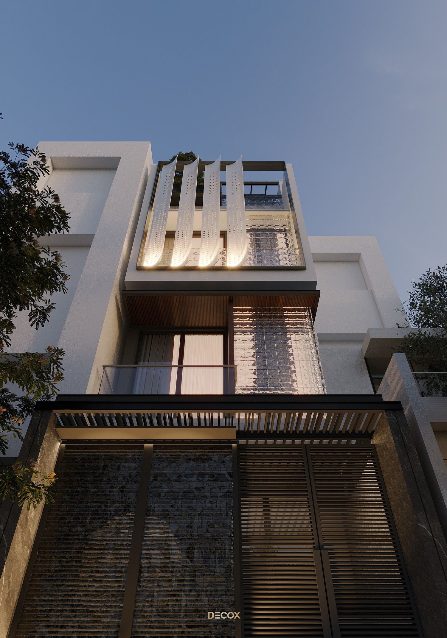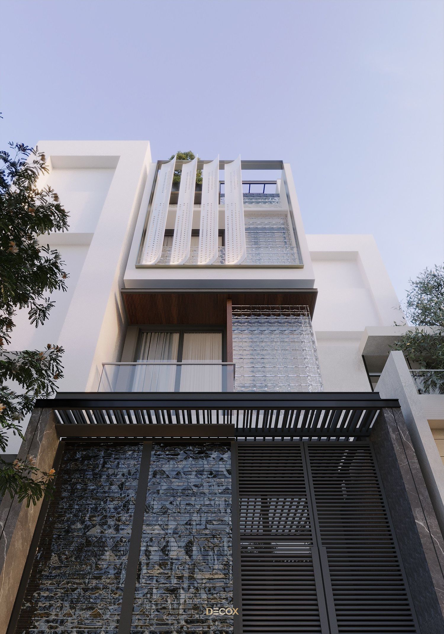 Thiết kế sử dụng bảng màu tối giản, nhẹ nhàng tạo cảm giác yên bình và hiện đại. Bên cạnh đó, vật liệu cũng là một điểm thú vị trong công trình này. Bằng việc sử dụng lam sắt với thiết kế cách điệu ở không gian tầng 3 và tầng 4 của căn nhà, thiết kế không chỉ đem đến điểm nhấn ấn tượng mà đây còn là giải pháp chắn nắng hiệu quả. Và sự xuất hiện của gạch kính xuyên sáng đã đánh dấu sự trở lại dòng gạch đã từng “lỗi thời”, vừa mang tác dụng trang trí vừa giúp không gian sống luôn tràn ngập năng lượng tích cực.