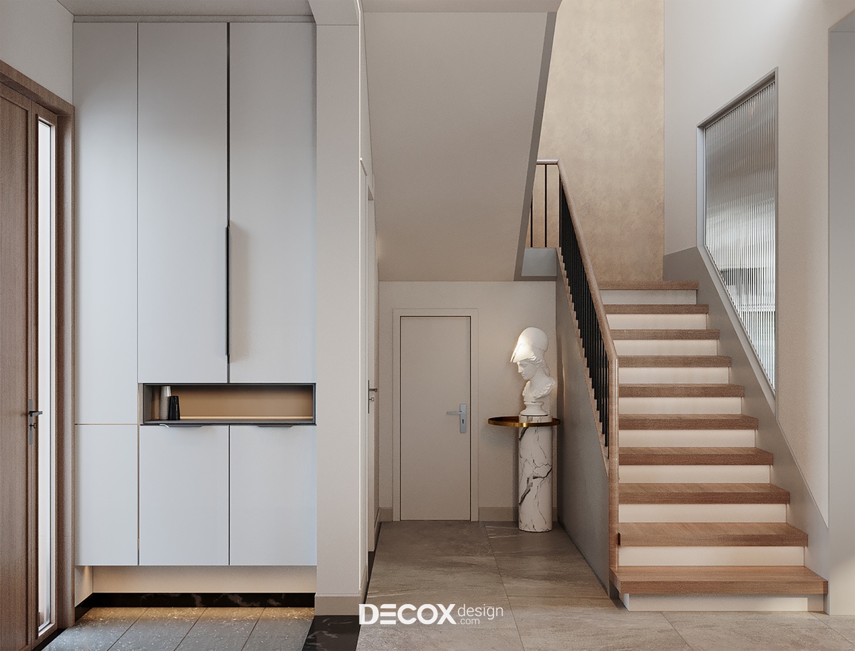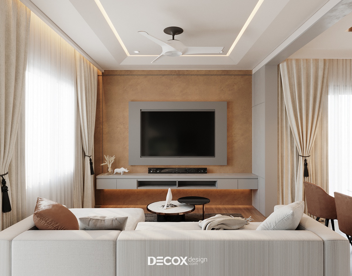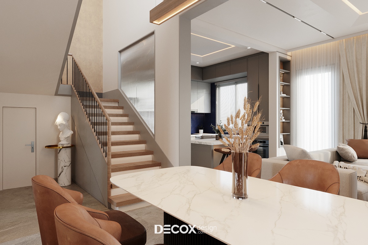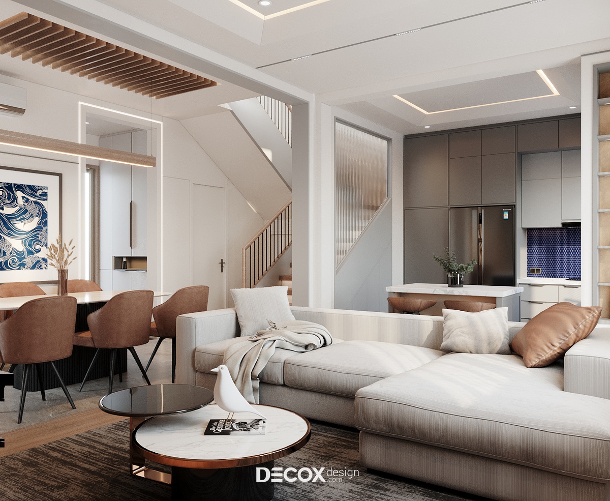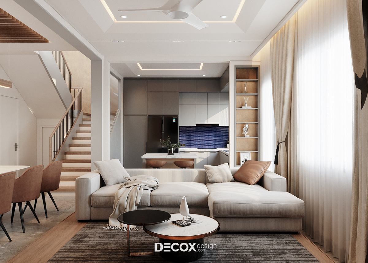 Với kết cấu 1 trệt 1 lầu cộng hưởng cùng hệ mái ngói hơi hướng Á Đông, kiến trúc biệt thự mang đến nét đẹp hiện đại, thanh lịch nhưng cũng không kém phần bình dị, mộc mạc theo đúng tinh thần của một tổ ấm nghỉ dưỡng. Do ngoại thất đã được chủ đầu tư định hình từ trước, nên việc thiết kế nội thất sao cho dung hòa giữa sở thích, ý muốn gia chủ và kiến trúc biệt thự là bài toán được đặt ra cho các KTS của Decox Design. Để giải bài toán này, Decox đã chọn lựa ứng dụng phong cách nội thất hiện đại kết hợp cùng cách phối trộn màu sắc sáng tạo để mang đến một không gian sống cao cấp, ấm cúng và tiện nghi được đúc kết từ những gì đơn giản nhất.