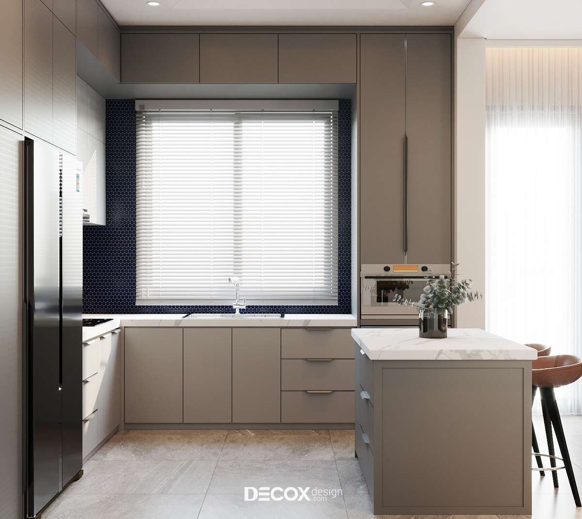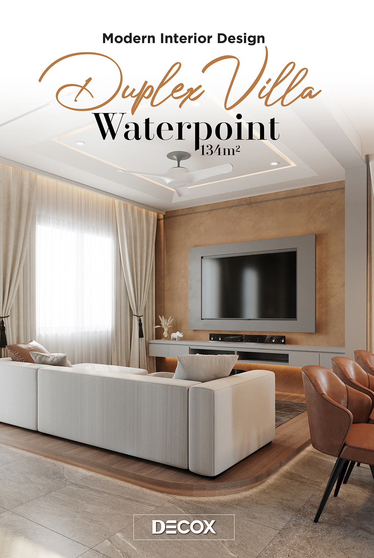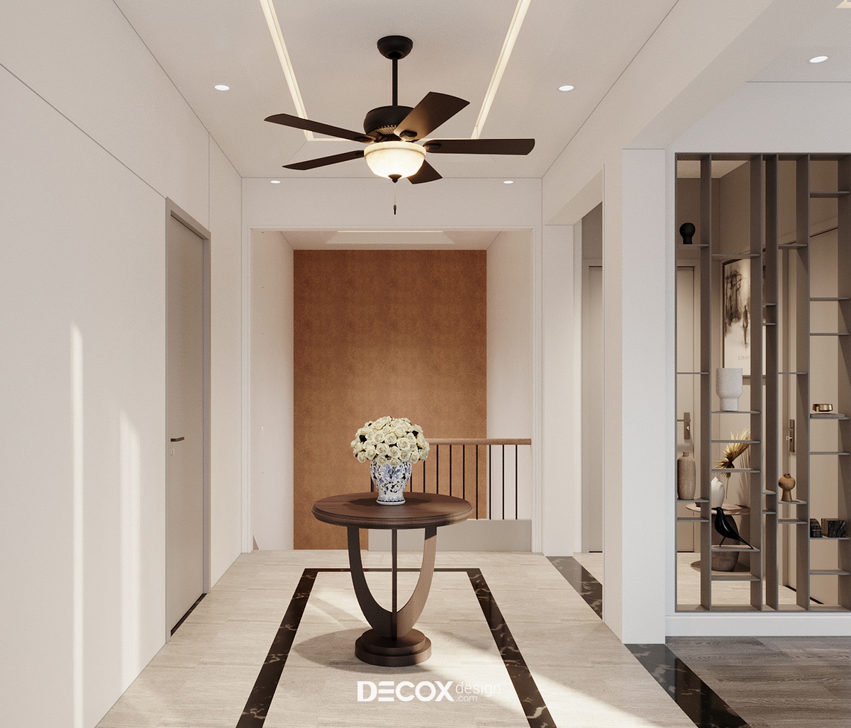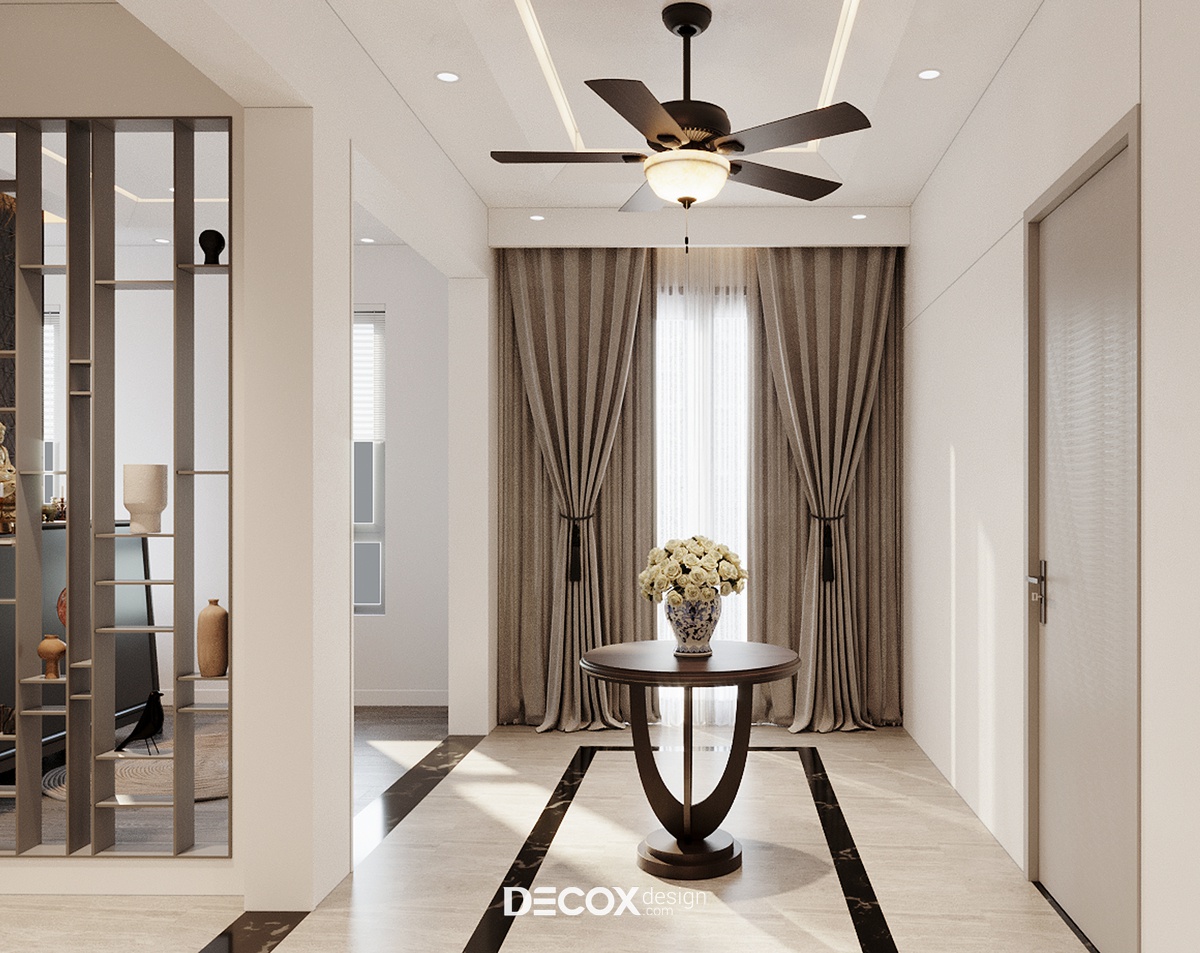 Với kết cấu 1 trệt 1 lầu cộng hưởng cùng hệ mái ngói hơi hướng Á Đông, kiến trúc biệt thự mang đến nét đẹp hiện đại, thanh lịch nhưng cũng không kém phần bình dị, mộc mạc theo đúng tinh thần của một tổ ấm nghỉ dưỡng. Do ngoại thất đã được chủ đầu tư định hình từ trước, nên việc thiết kế nội thất sao cho dung hòa giữa sở thích, ý muốn gia chủ và kiến trúc biệt thự là bài toán được đặt ra cho các KTS của Decox Design. Để giải bài toán này, Decox đã chọn lựa ứng dụng phong cách nội thất hiện đại kết hợp cùng cách phối trộn màu sắc sáng tạo để mang đến một không gian sống cao cấp, ấm cúng và tiện nghi được đúc kết từ những gì đơn giản nhất.