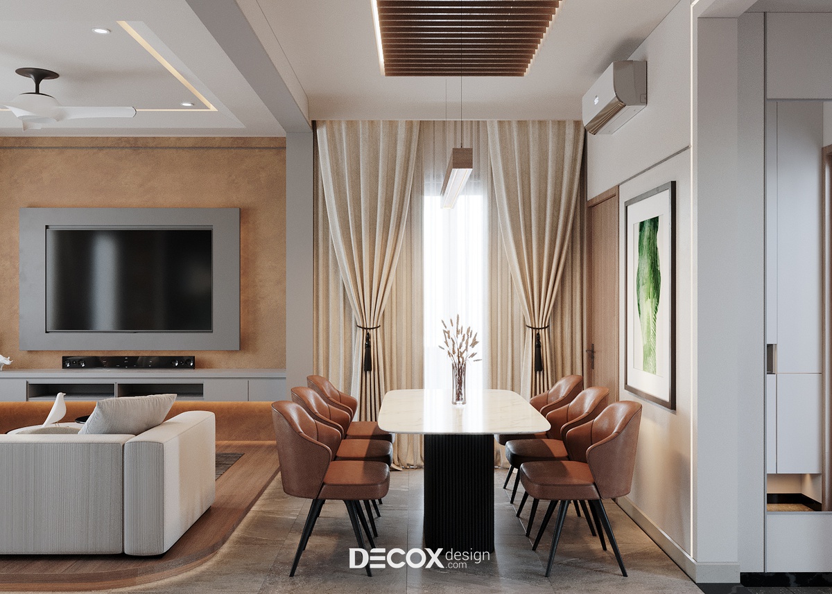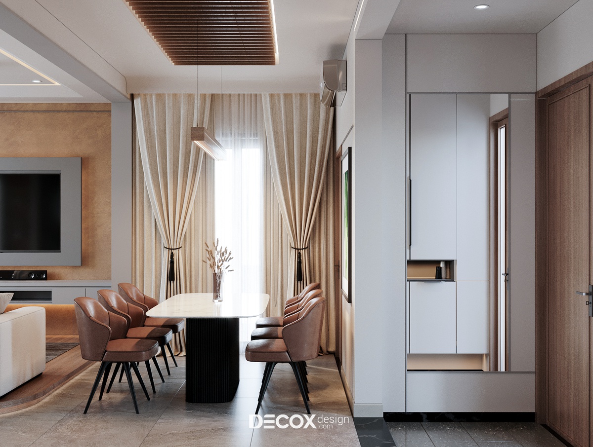 Hiện đại, Lịch thiệp và Ấm cúng là 3 tính từ mô tả chính xác “cá tính” của dự án này. Ngoài tuân theo những nguyên tắc “bất di bất dịch” của phong cách hiện đại, qua cách thể hiện những chi tiết đơn giản mà sắc sảo, tân tiến mà gần gũi thì ý tưởng dùng gam màu nâu (gam màu thường dùng trong các phong cách đề cao tinh thần mộc mạc) để làm màu chủ đạo càng khiến không gian sống vốn trẻ trung lại thêm mới mẻ với bầu không khí nhẹ nhàng, ấm cúng, giàu sức sống.