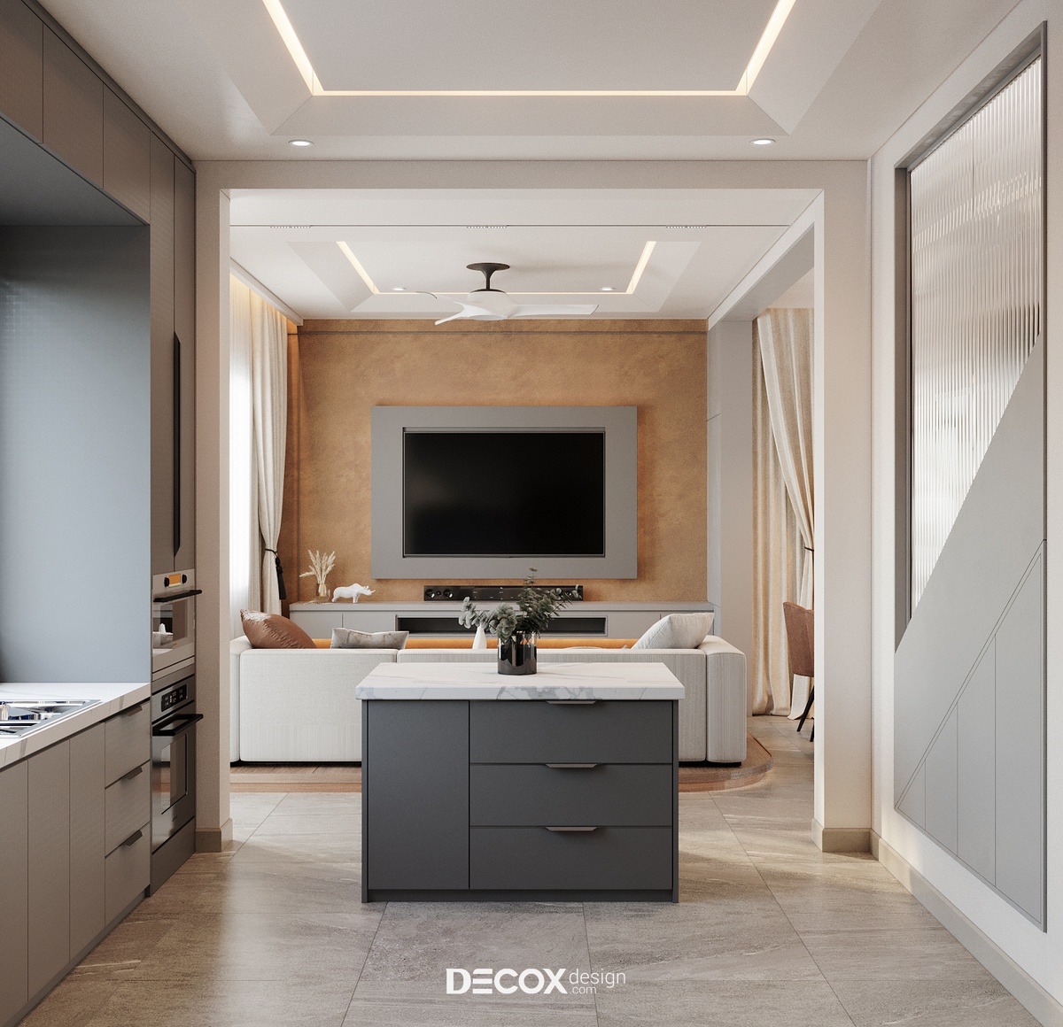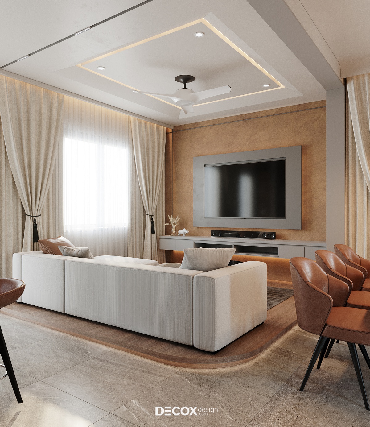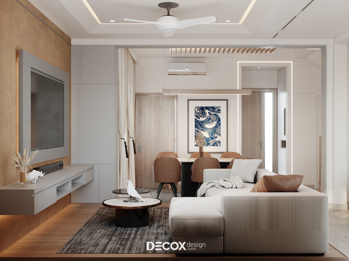 Phòng khách sử dụng lối bố trí nội thất đề cao tinh thần tối giản nhưng vẫn giữ được nét duyên dáng với cách sắp đặt quen thuộc: TV đối diện sofa. Không gian sinh hoạt chung này chính là một “góc nhỏ” đầy thân mật để mọi người quây quần, sum họp bên nhau. Thế nên, cách chọn màu và ứng dụng họa tiết ở đây cũng được chọn lọc tỉ mỉ để khiến căn phòng giàu tính tận hưởng và thư giãn hơn. Một điểm sáng tạo trong không gian này chính là phần nền nhà được giật cấp nhẹ và lát gỗ bo cong mềm mại ôm trọn khu vực phòng khách. Cách thiết kế này đem đến một điểm nhấn đầy táo bạo, chi tiết đó giống như ranh giới ước lệ để khu biệt phòng khách và các không gian khác. Mặt khác, giống như lớp layer giúp phòng khách trông khác biệt và nổi bật hơn.