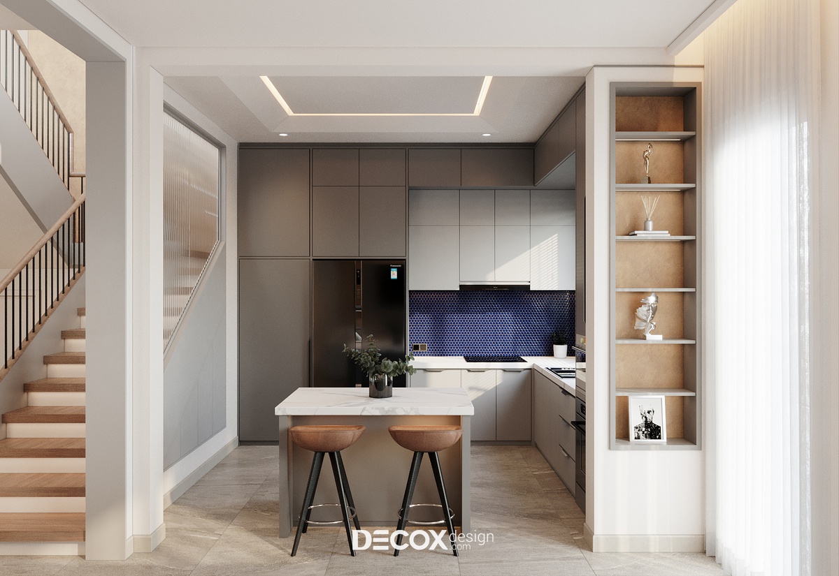 Bếp tuy đơn giản nhưng đậm nét độc đáo riêng, trong đó phải kể đến chiếc bàn đảo kiêm quầy bar mini. Bàn đảo được đặt giữa lối đi một cách đầy ngụ ý với mục đích vừa để phân tách vừa để liên kết không gian. Cách làm này quả thật không mới nhưng đối với lối thiết kế hiện đại lại rất có ưu điểm.