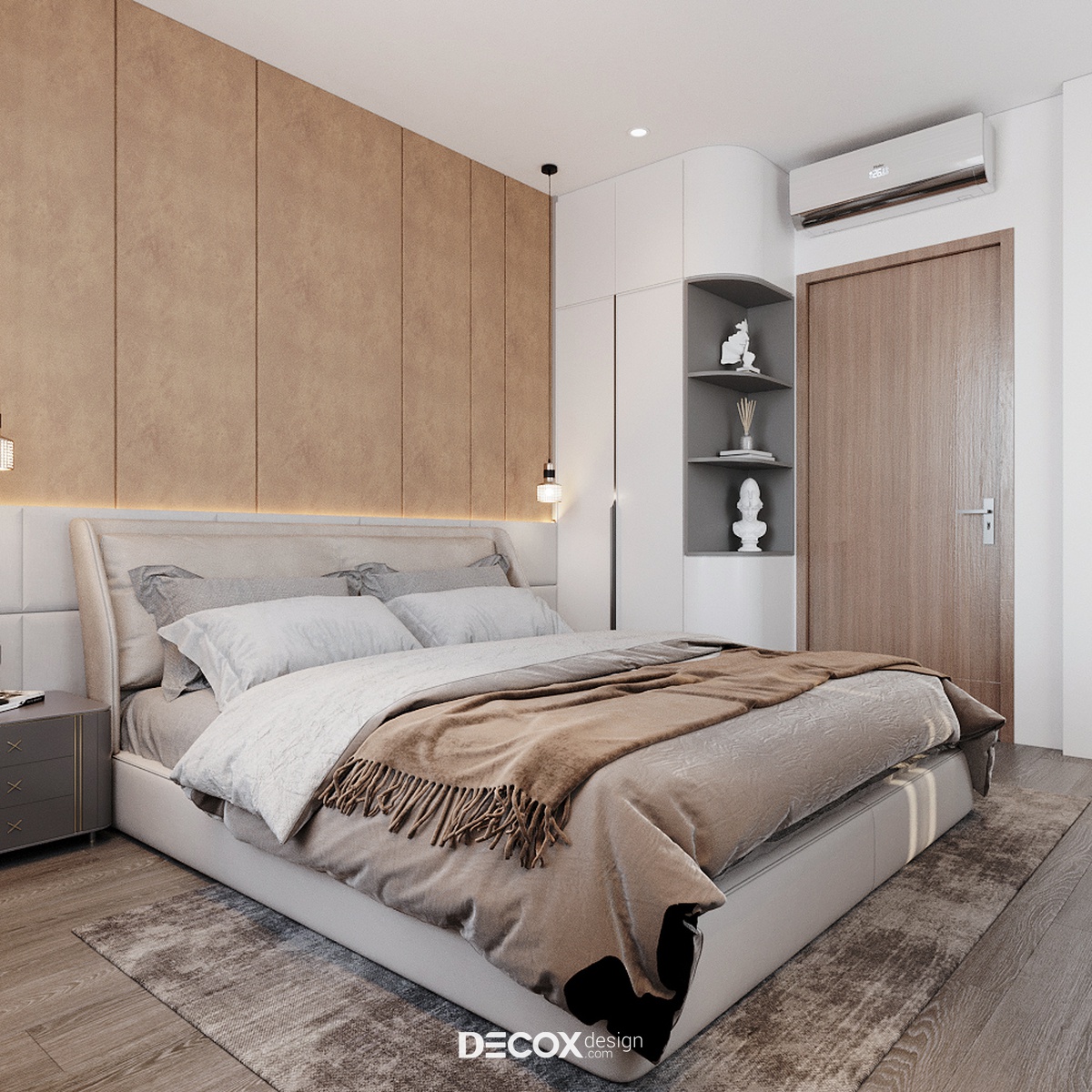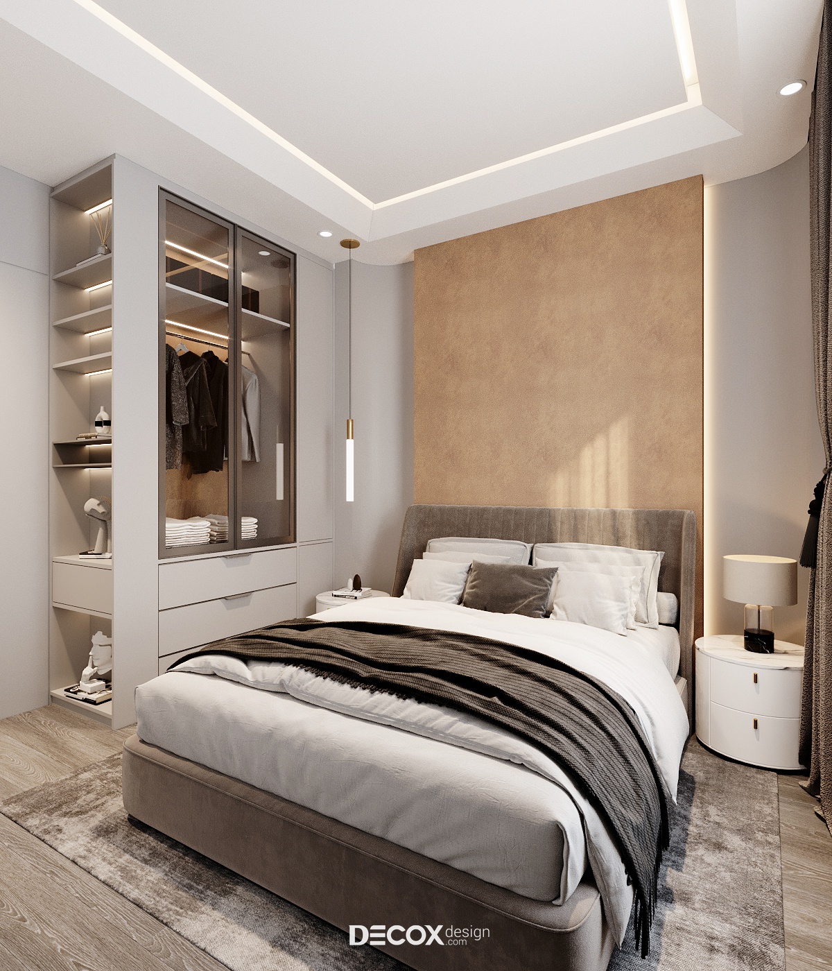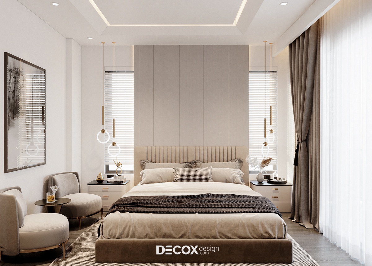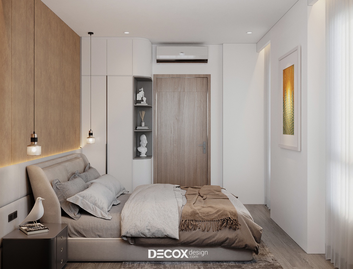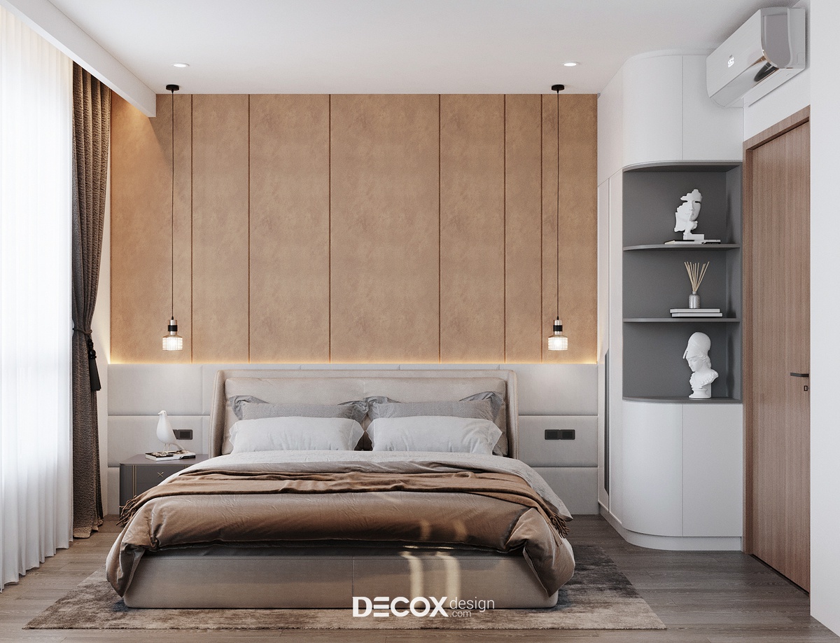 Do diện tích phòng có phần khiêm tốn, vậy nên để kiến tạo nên một không gian thẩm mỹ nhưng vẫn đảm bảo tiện nghi cho người sử dụng KTS đã ứng dụng lối bố trí tối giản với nội thất kiểu dáng đơn giản, nhỏ gọn. Tuy nội thất chỉ gồm giường ngủ, hai tủ đầu giường và tủ quần áo thế nhưng căn phòng vẫn tỏa được sức hút riêng biệt nhờ cách phối trộn màu sắc và ánh sáng đầy khéo léo. Ngoài sắc trung tính đóng vai trò chủ đạo, sắc nâu nhẹ nhàng đồng điệu với các không gian khác cũng được ứng dụng để nhấn điểm khu vực đầu giường. Mặt khác, để căn phòng trông rộng, thoáng hơn so với diện tích thực thì yếu tố ánh sáng đã được tận dụng triệt để, từ ánh sáng tự nhiên thông qua khung cửa sổ lớn, hệ đèn âm trần cùng cấp độ sáng cho phòng cùng đèn thả trần và đèn led hắt điểm có tác dụng trang trí, vỗ về những giấc ngủ ngon.