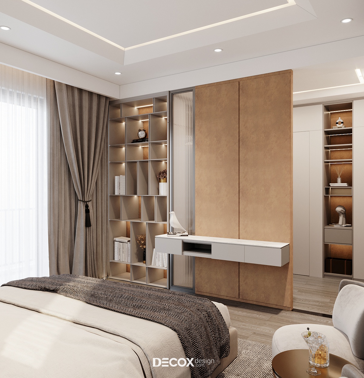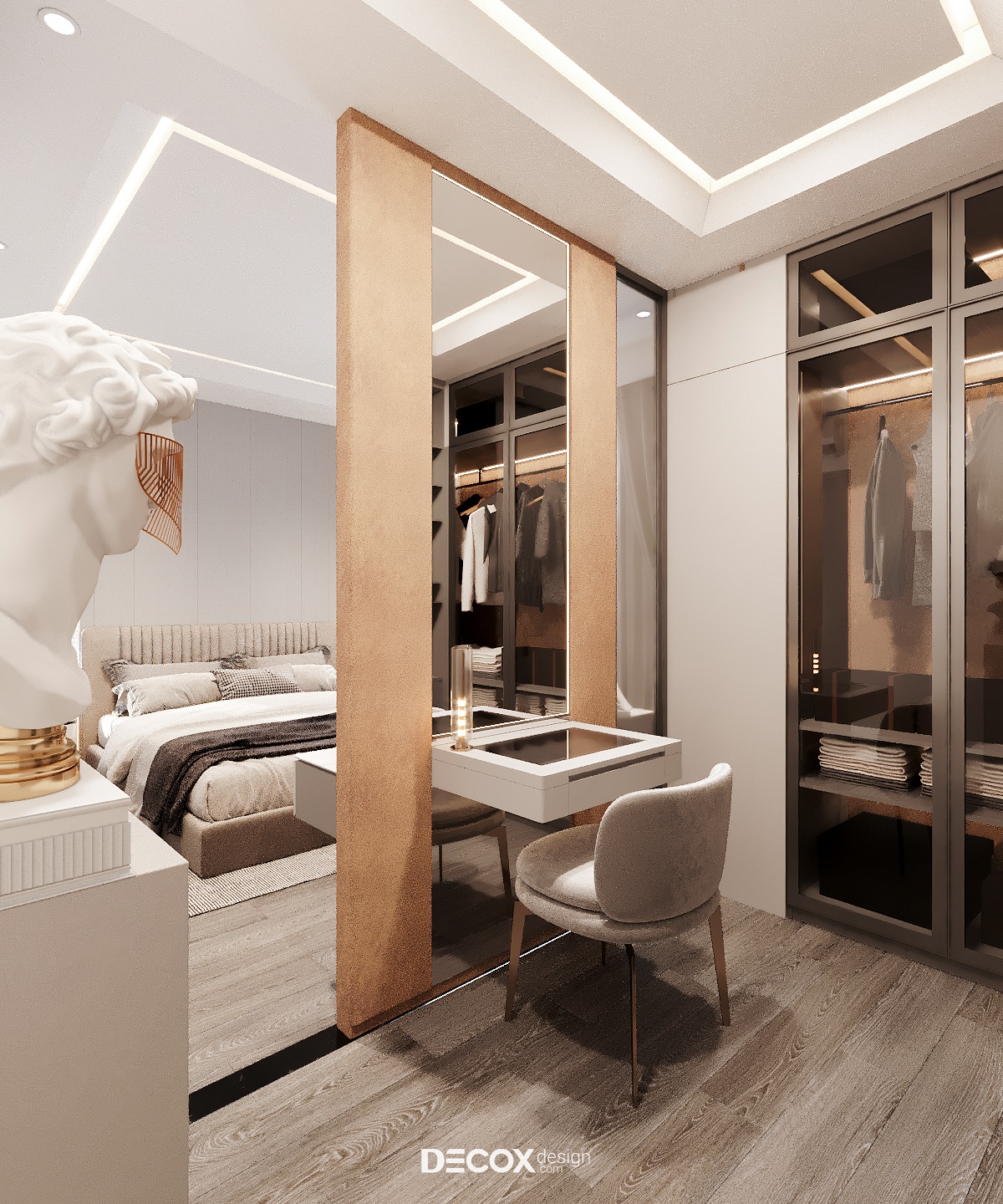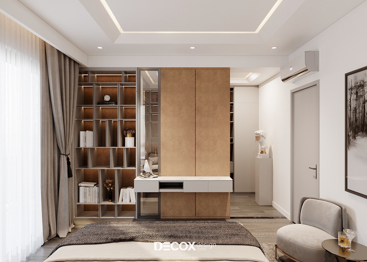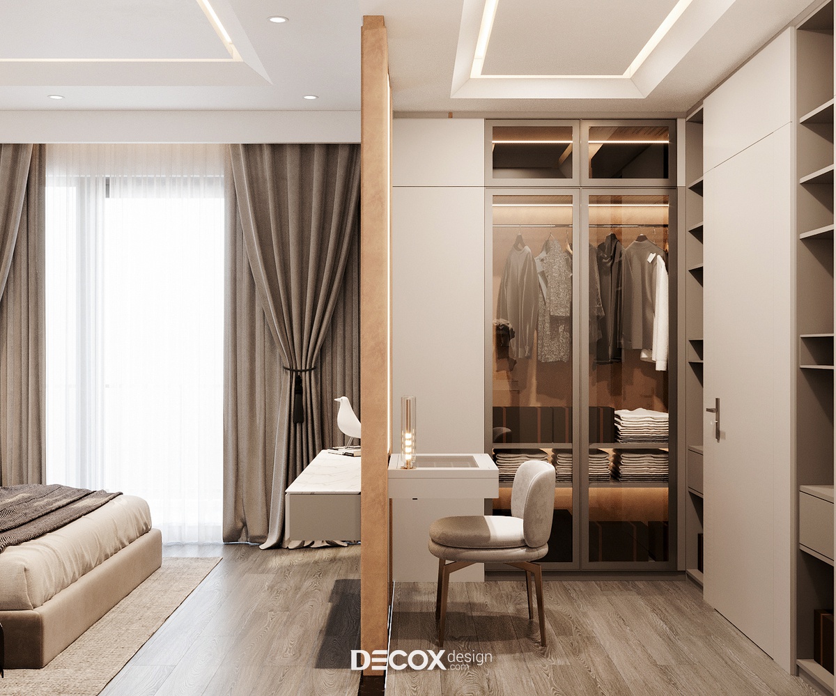 Phòng thay đồ được ngăn cách với khu vực giường ngủ qua ranh giới giả lập được công năng hóa thành kệ chứa đồ và bàn trang điểm. Phòng thay đồ có diện tích nhỏ nên các mảng tường đều được lắp tủ nhiều ngăn full trần để tăng tiết kiệm diện tích và tăng không gian lưu trữ.