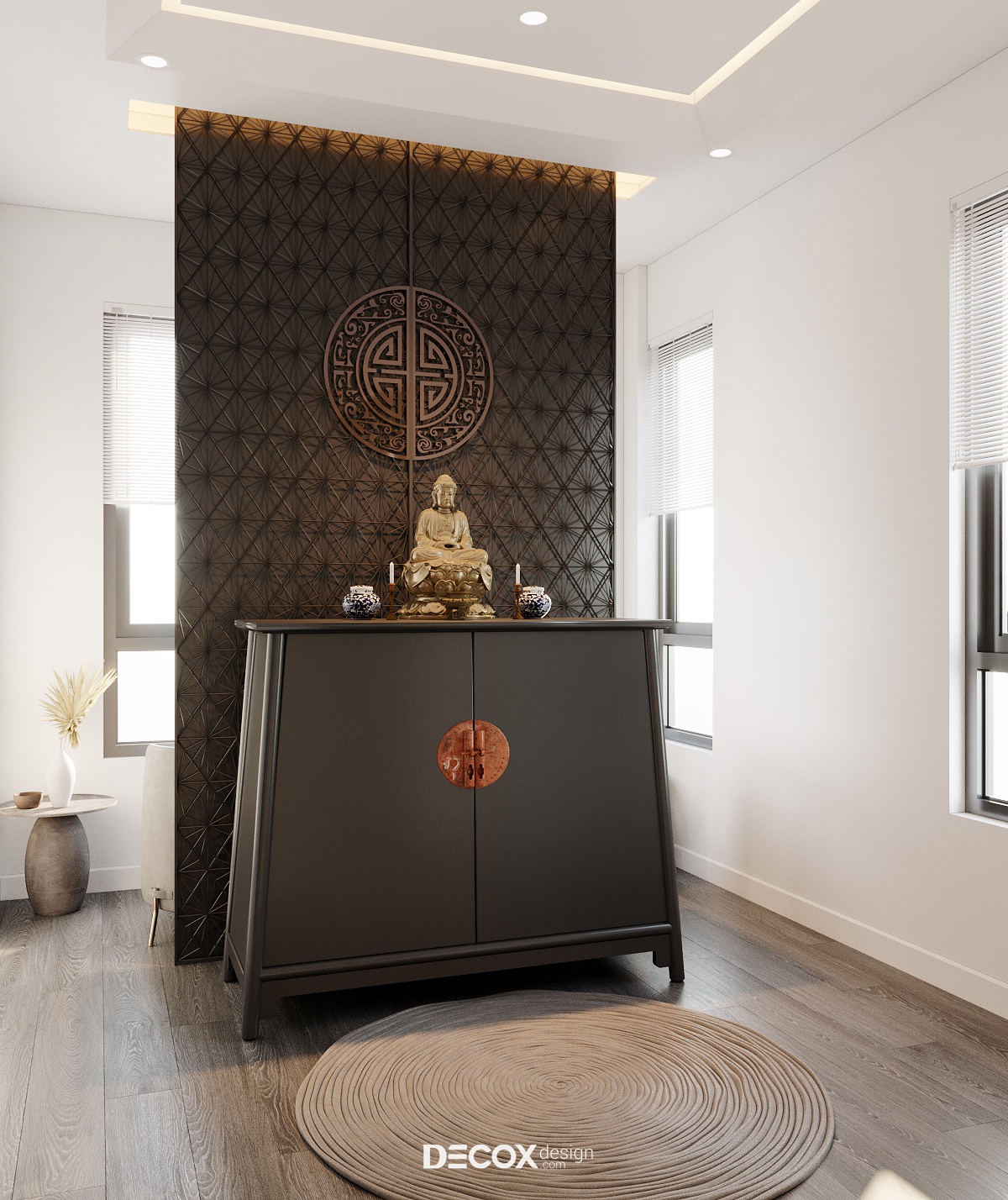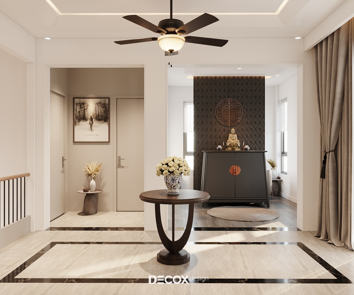 Phòng thờ là không gian mang đậm cá tính truyền thống tưởng chừng sẽ khó hòa hợp với phong cách hiện đại của tổng thể. Thế nhưng qua những thủ pháp thiết kế linh hoạt, không gian thờ phụng của dự án này vẫn hiện lên trang trọng, uy nghiêm và giữ được nét duyên truyền thống. Song song đó thì nhờ tinh thần giản dị trong các chọn lựa nội thất và ứng dụng màu sắc lại khiến vẻ hiện đại quay trở lại không gian này theo một cách tinh tế, ý nhị hơn.