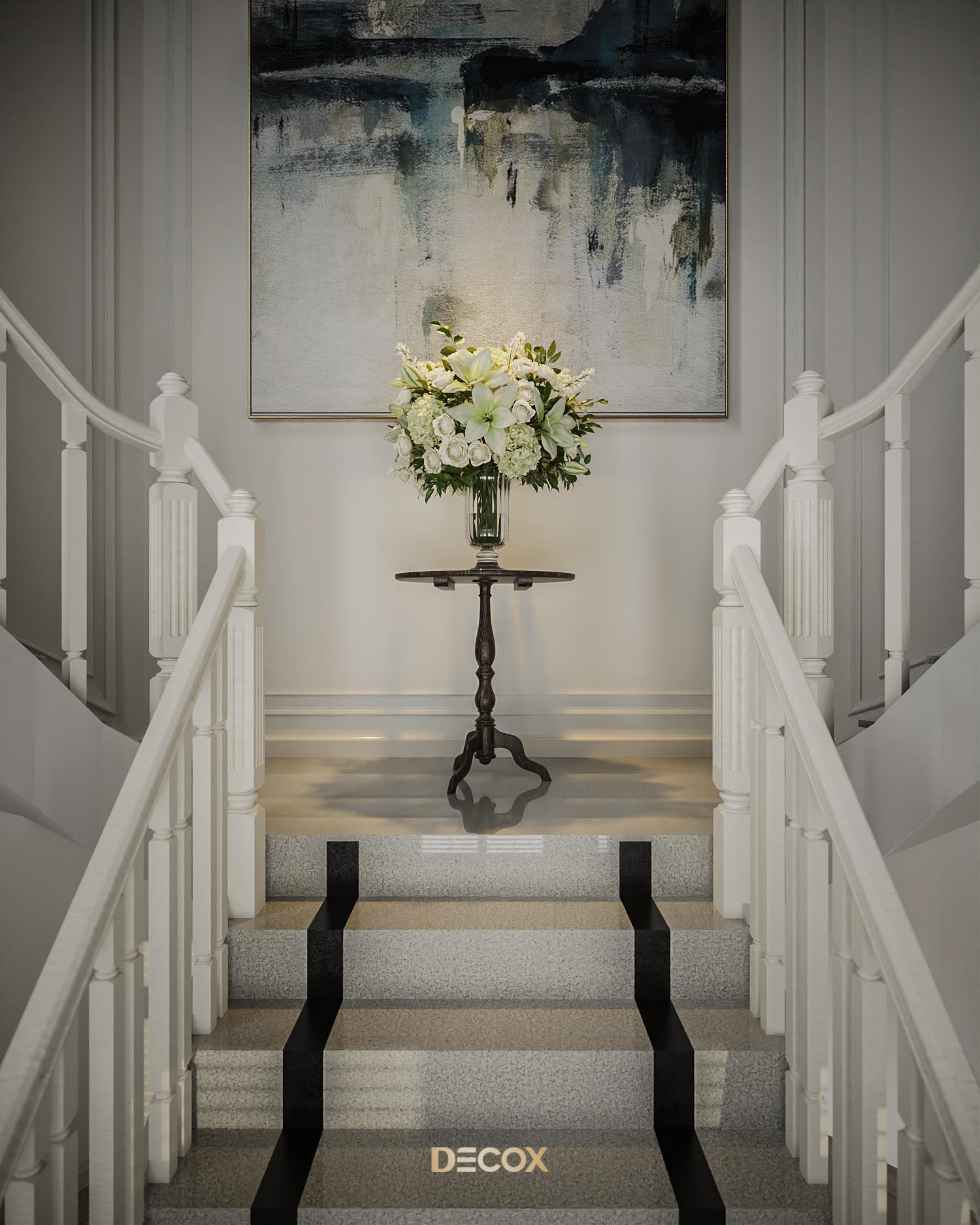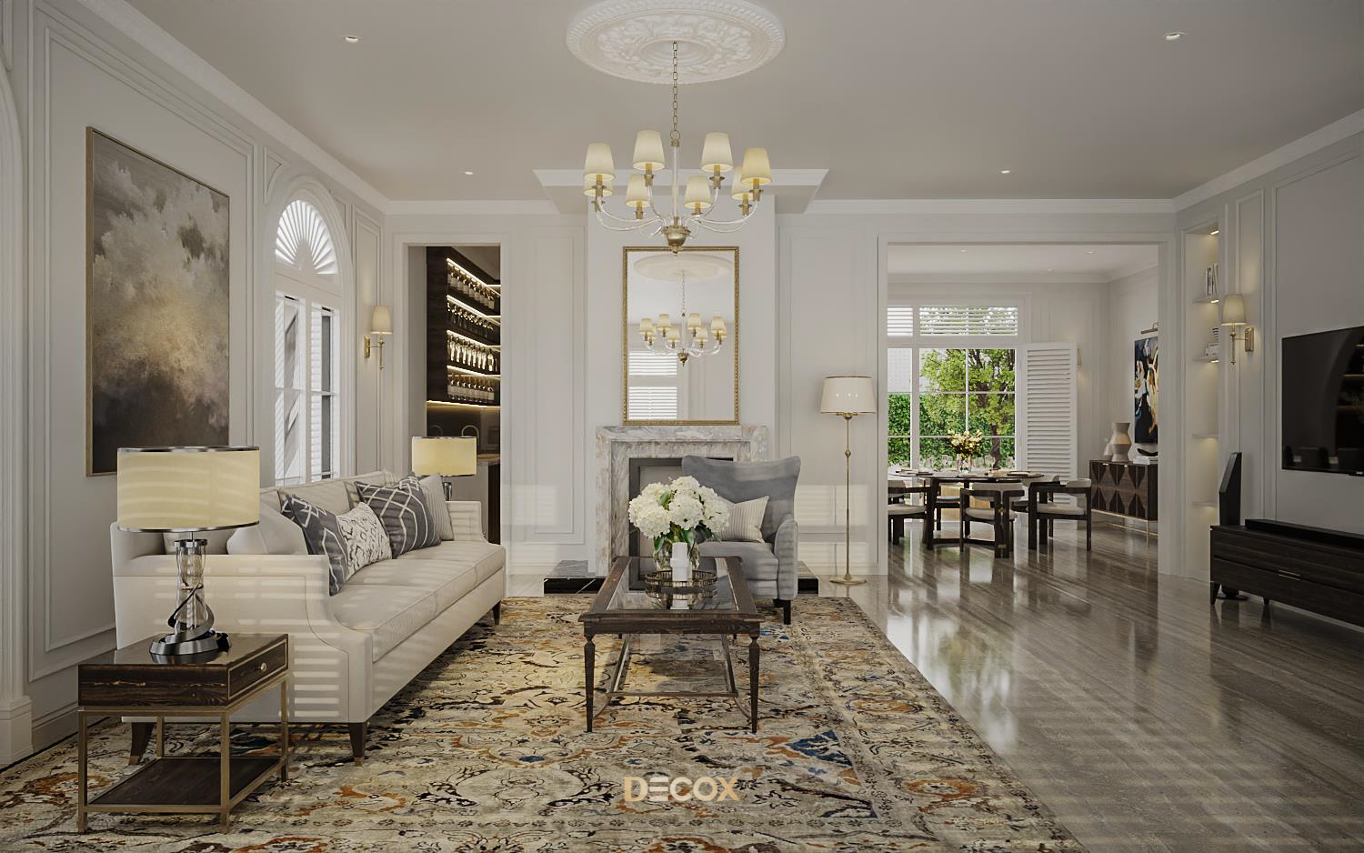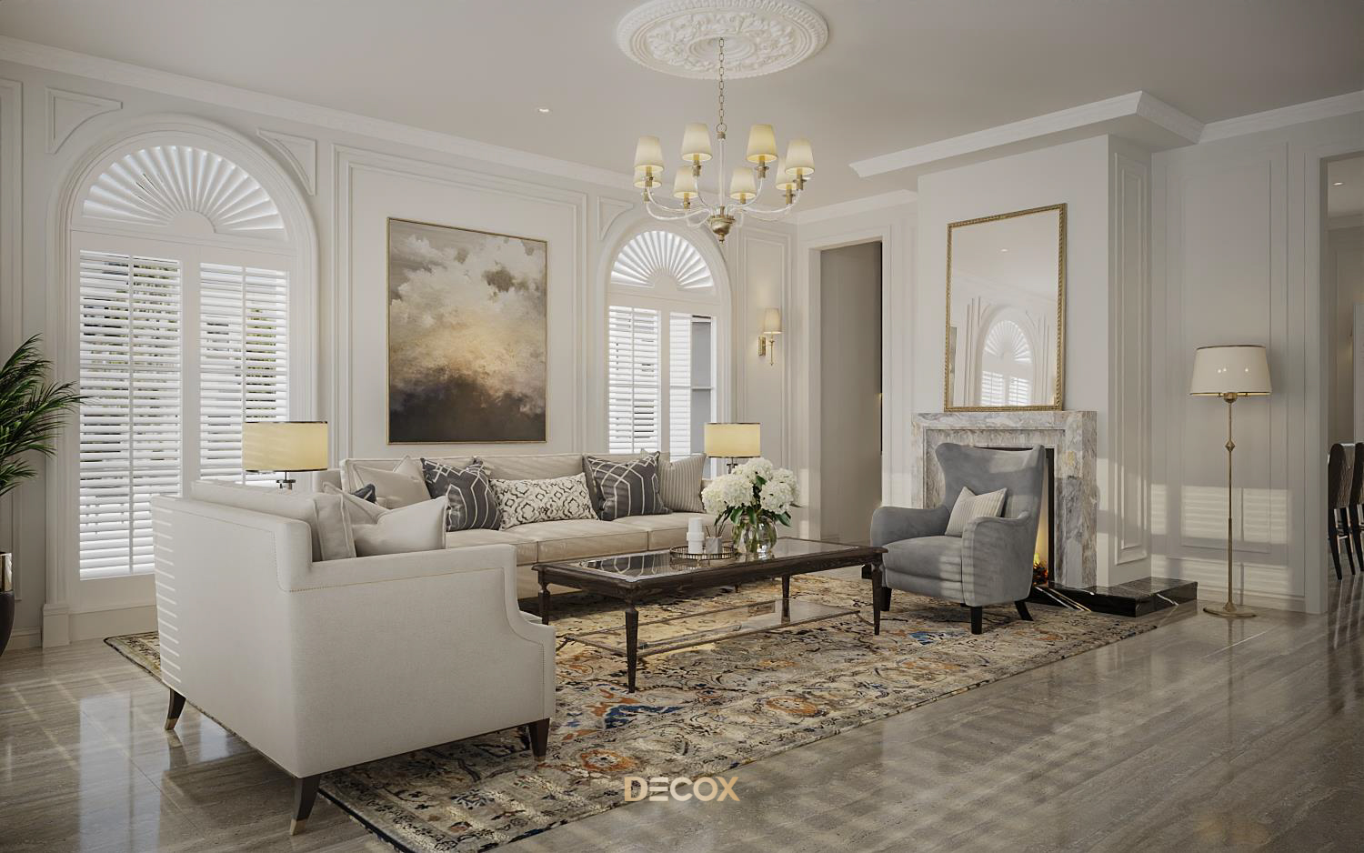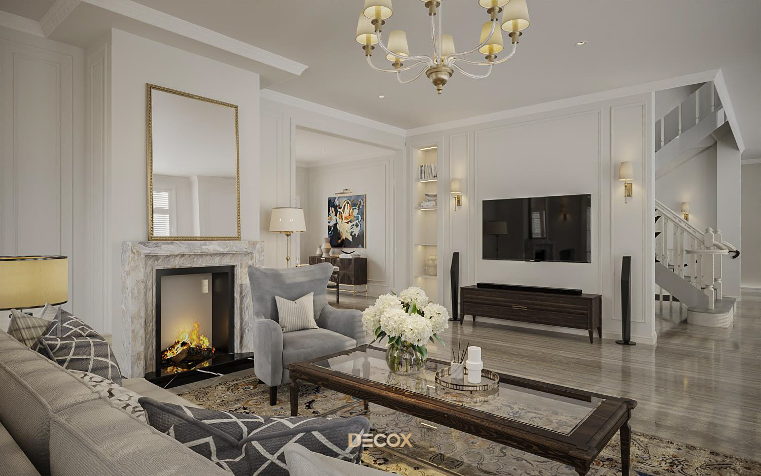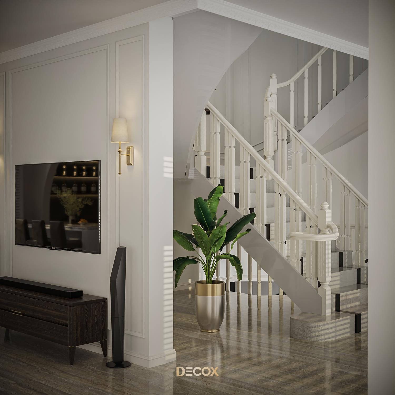 Đề bài của gia chủ là mong muốn một không gian sống sang trọng, tinh tế, hài hòa với khối kiến trúc và có vẻ đẹp vượt thời gian. Thế nên, Decox đã mang đến một thiết kế lấy cảm hứng từ thẩm mỹ Tây phương, nhấn mạnh vào sự tinh tế đặc trưng của phong cách Tân cổ điển. Với sự nhẹ nhàng của tông màu trắng chủ đạo, kết hợp với chất liệu gỗ và ánh sáng vàng dịu nhẹ đã tạo nên không gian thân mật, ấm cúng, nuôi dưỡng cảm xúc từ sâu trong tâm hồn.