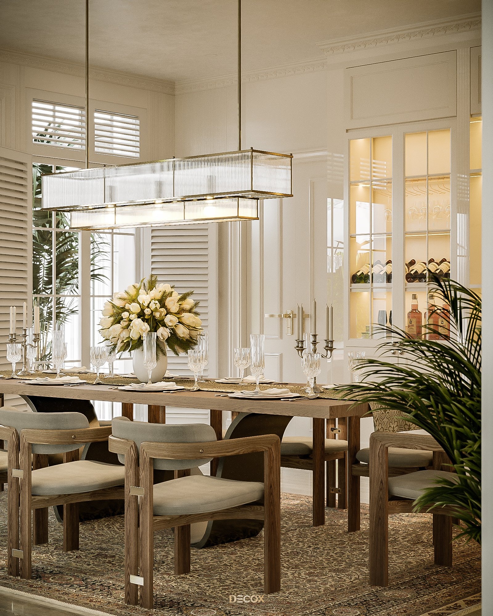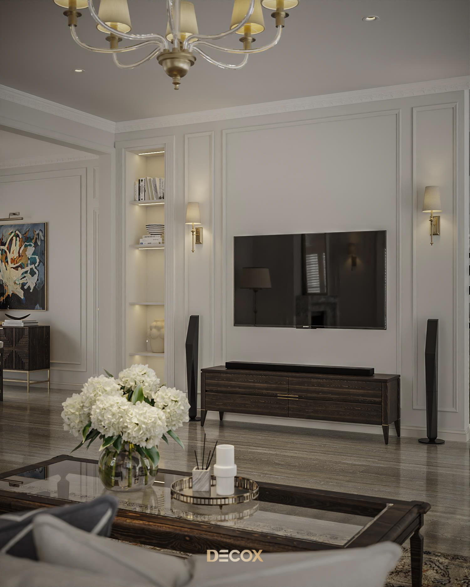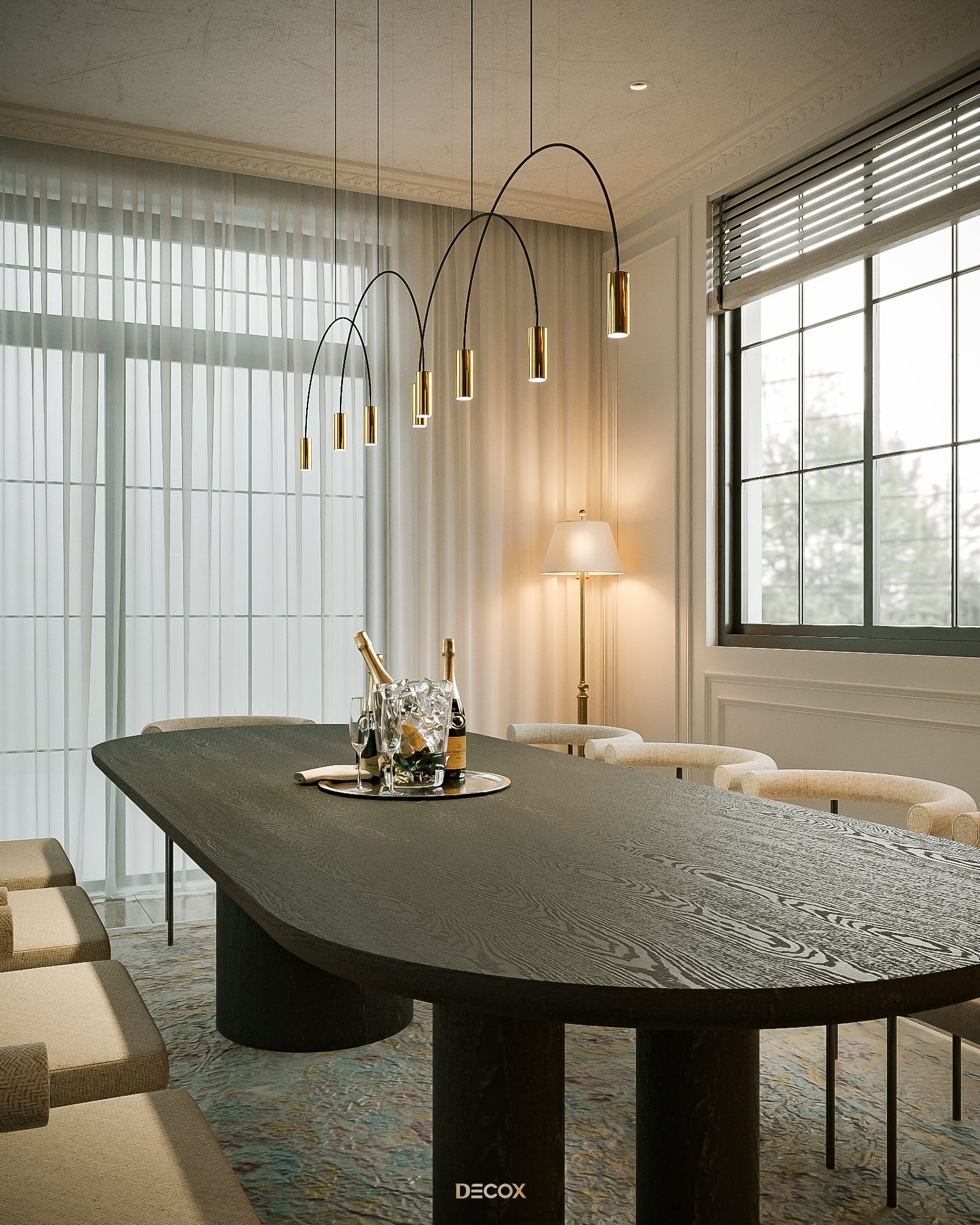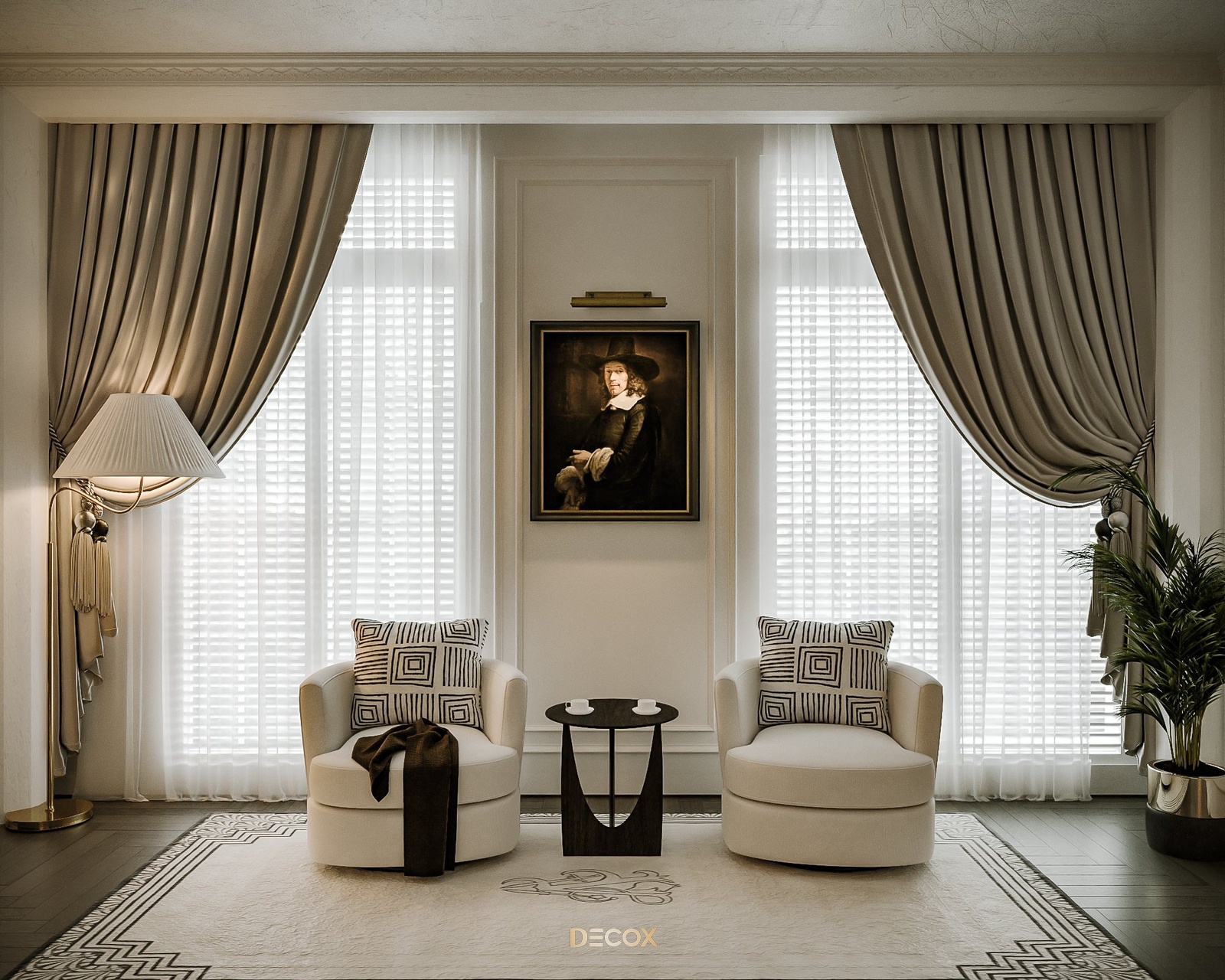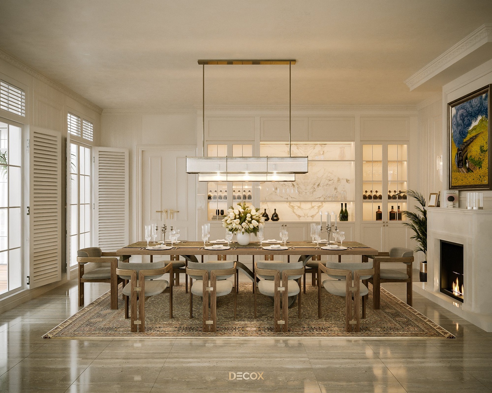 Đề bài của gia chủ là mong muốn một không gian sống sang trọng, tinh tế, hài hòa với khối kiến trúc và có vẻ đẹp vượt thời gian. Thế nên, Decox đã mang đến một thiết kế lấy cảm hứng từ thẩm mỹ Tây phương, nhấn mạnh vào sự tinh tế đặc trưng của phong cách Tân cổ điển. Với sự nhẹ nhàng của tông màu trắng chủ đạo, kết hợp với chất liệu gỗ và ánh sáng vàng dịu nhẹ đã tạo nên không gian thân mật, ấm cúng, nuôi dưỡng cảm xúc từ sâu trong tâm hồn.