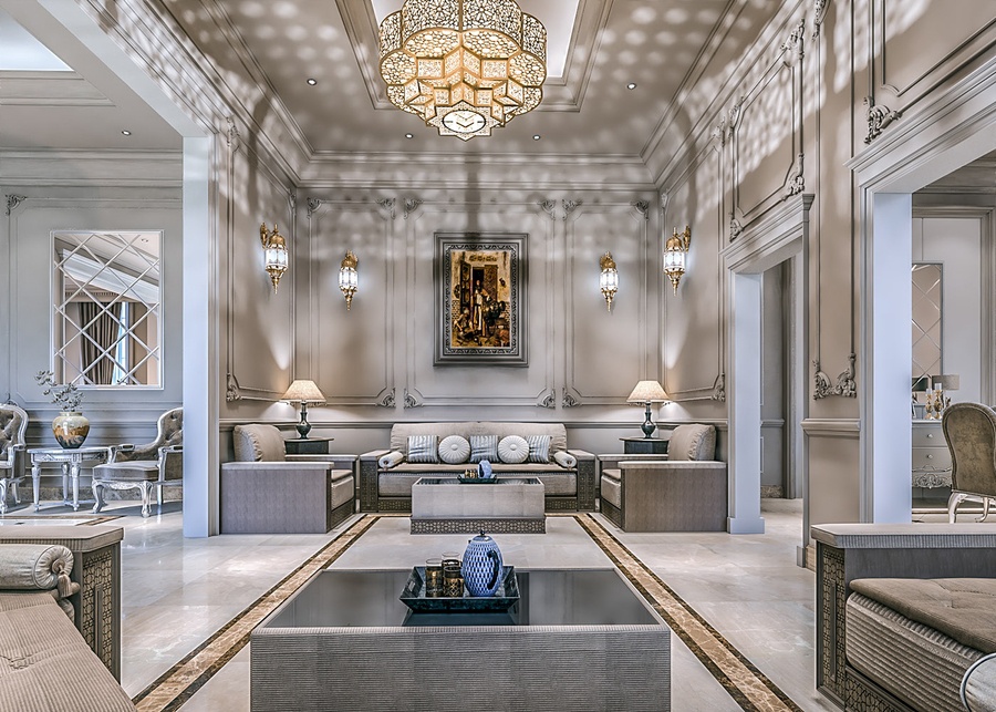 Với một diện tích vượt trội mà loại hình biệt thự sở hữu, gia chủ nên cân nhắc thiết kế phòng khách sao cho cân xứng với diện tích thực cũng như làm toát lên được vẻ đồ sộ, hoành tráng của mình. Ở đây nếu muốn một không gian rộng, thoáng và lý tưởng về mặt chiều sâu thì thiết kế thông tầng sẽ là một sự lựa chọn hoàn hảo. Ngoài ra, đừng quên trang trí thêm bộ đèn chùm lớn, tráng lệ để làm tăng thêm vẻ đẹp của biệt thự tân cổ điển nhé.