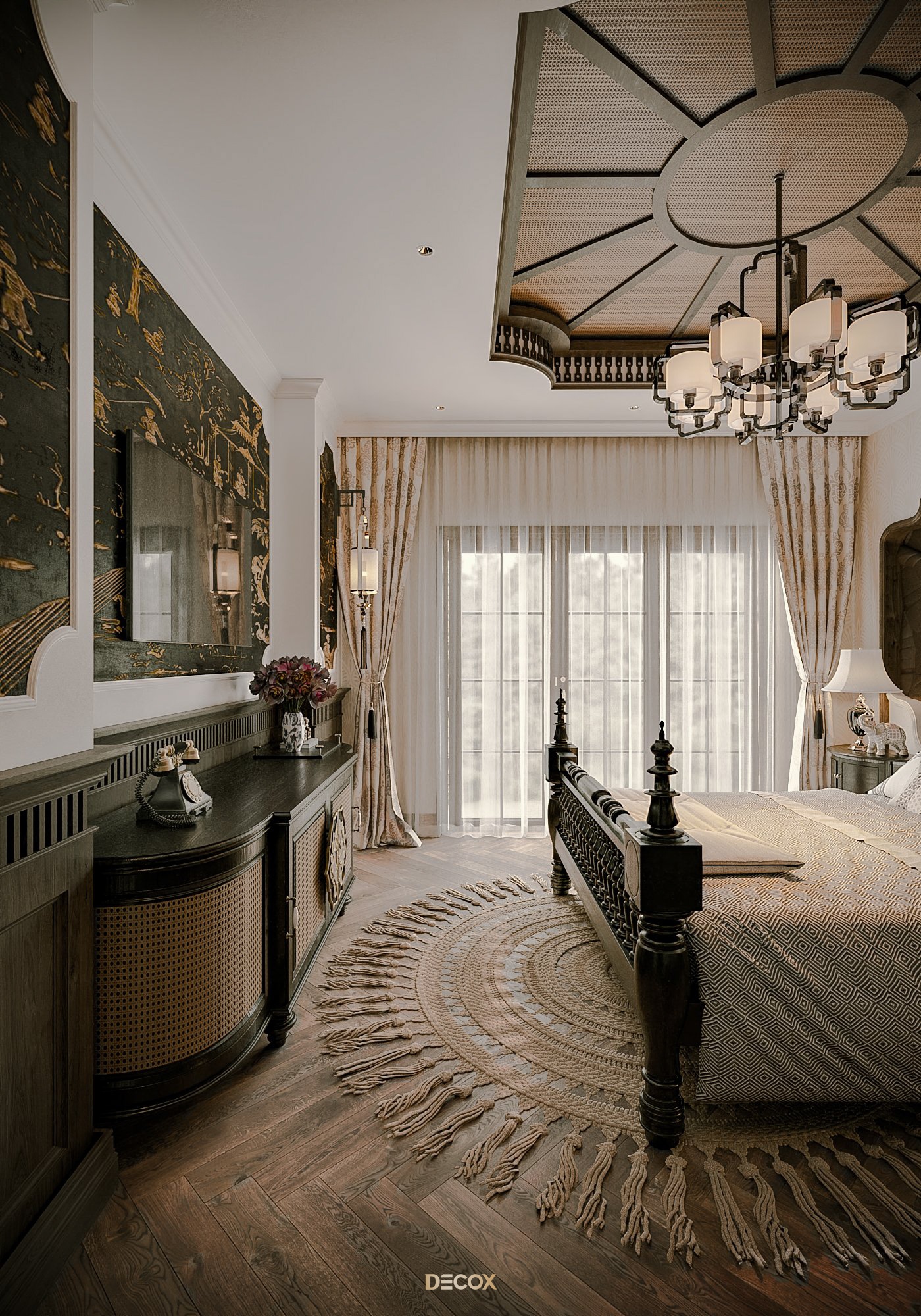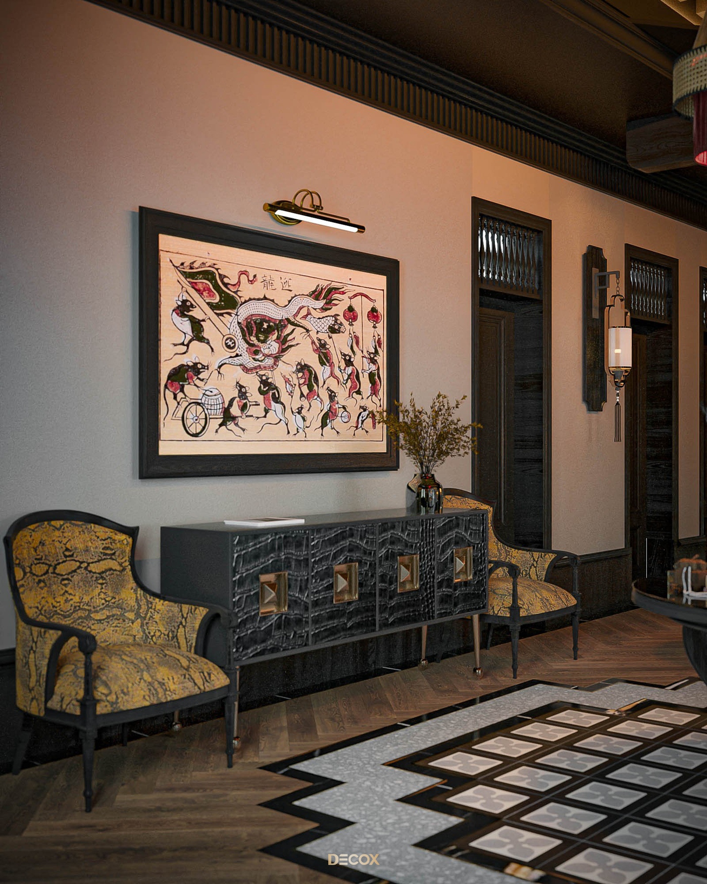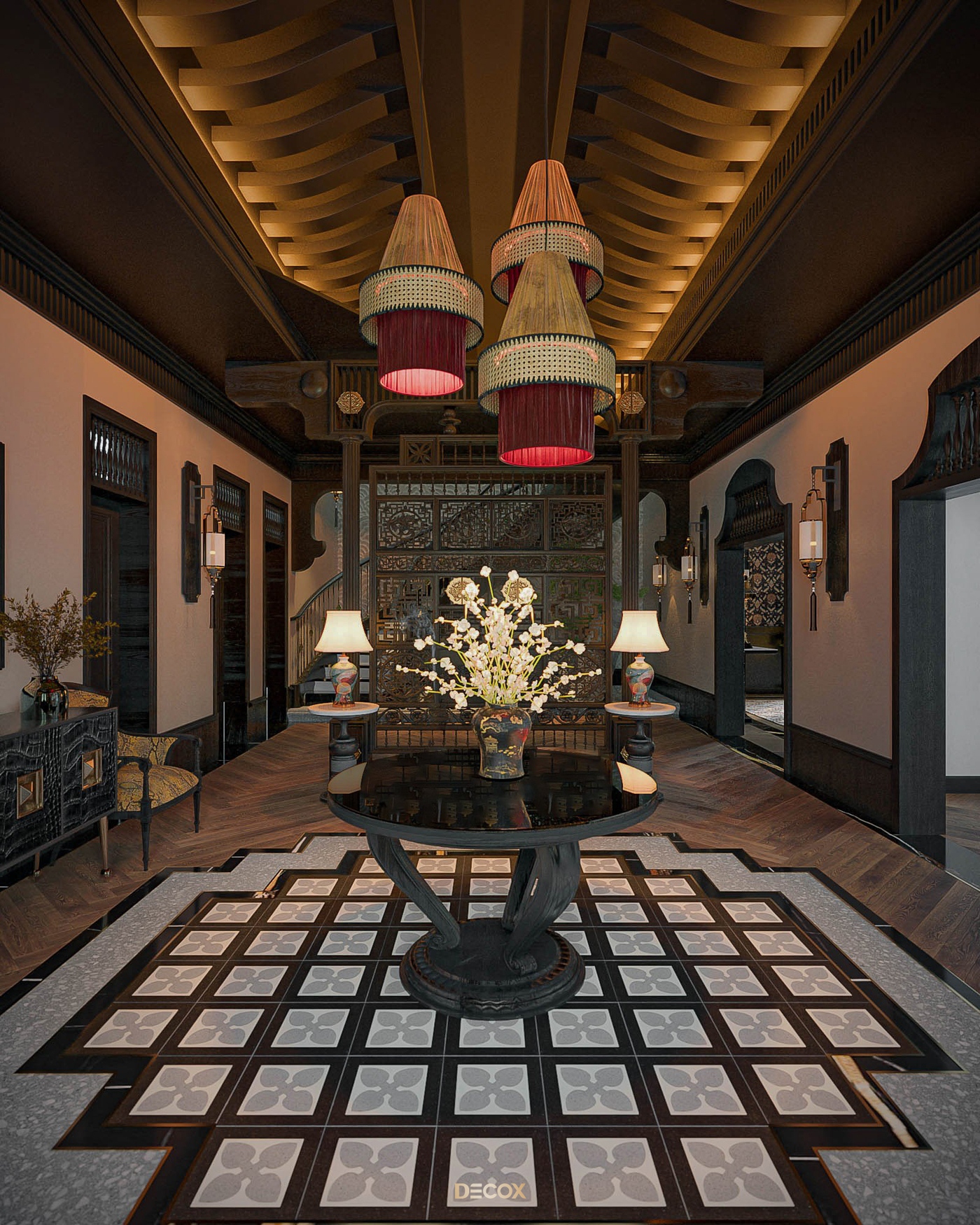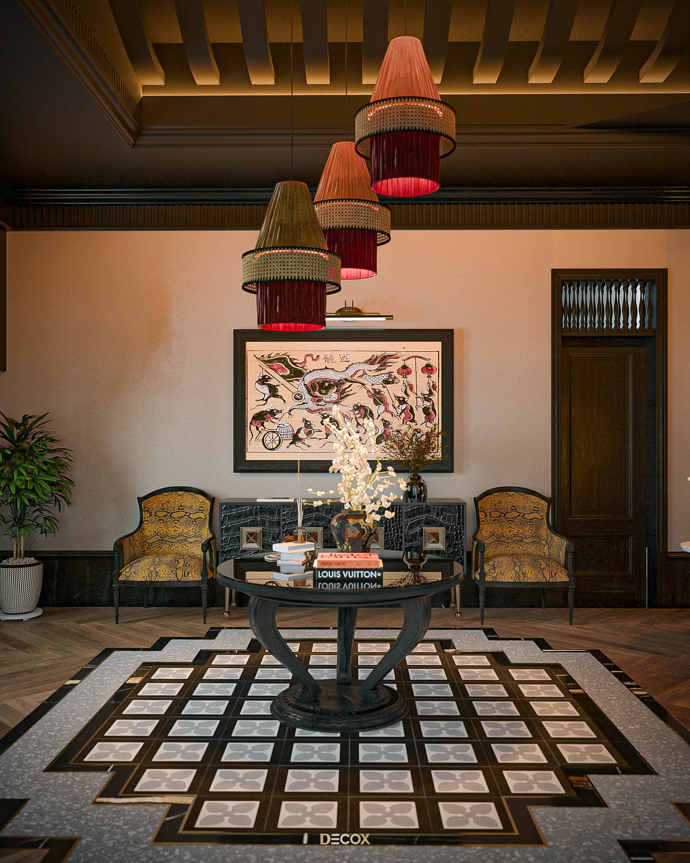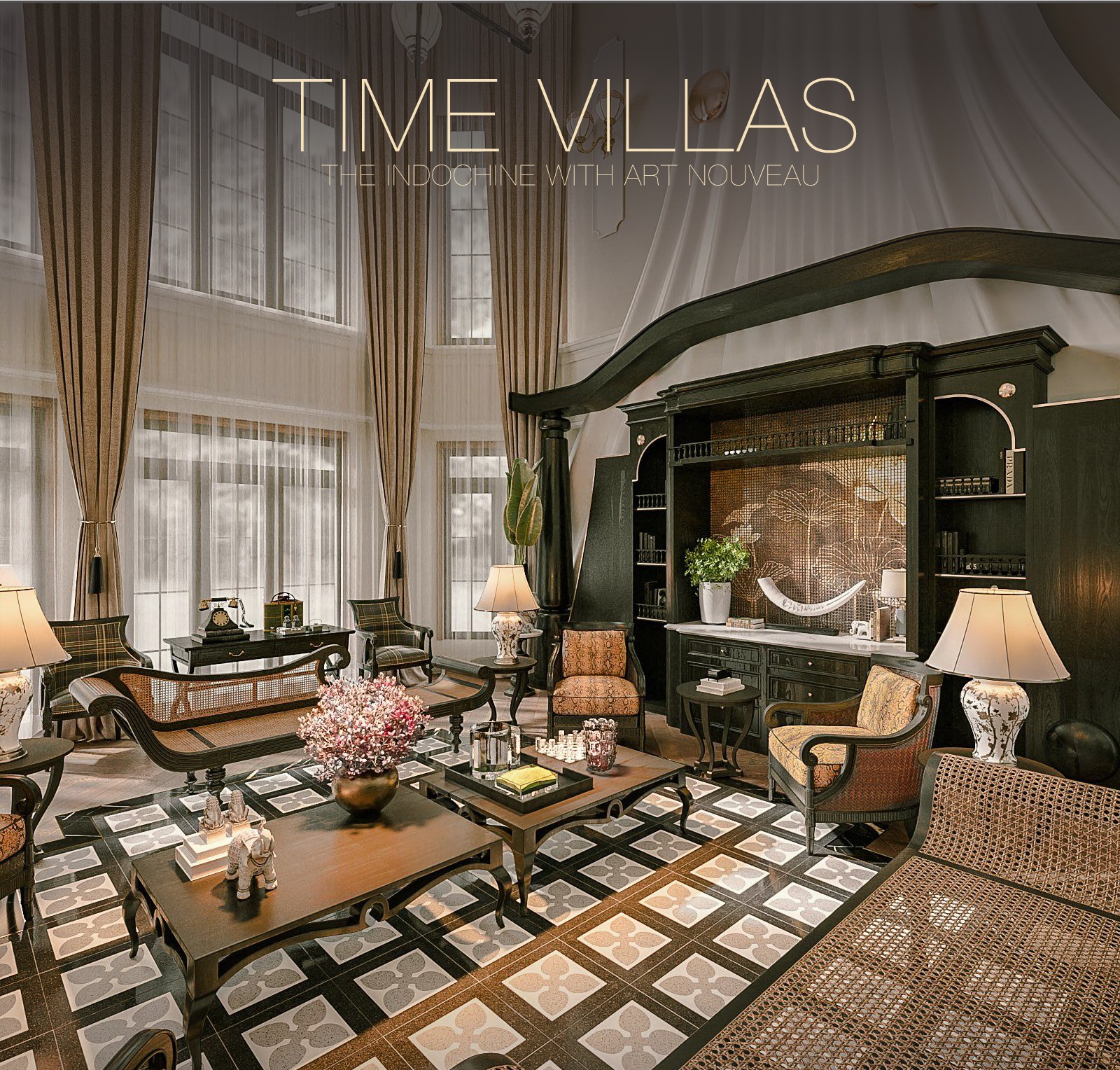 TIME VILLAS - Một căn biệt thự hòa trộn giữa phong cách Đông Dương và Art Nouveau do Decox thực hiện. Thiết kế nội thất là sự hiện diện của gam màu trầm ấm kết hợp với gỗ mun đen tạo nên sự quý phái sang trọng quyền lực cho gia chủ.