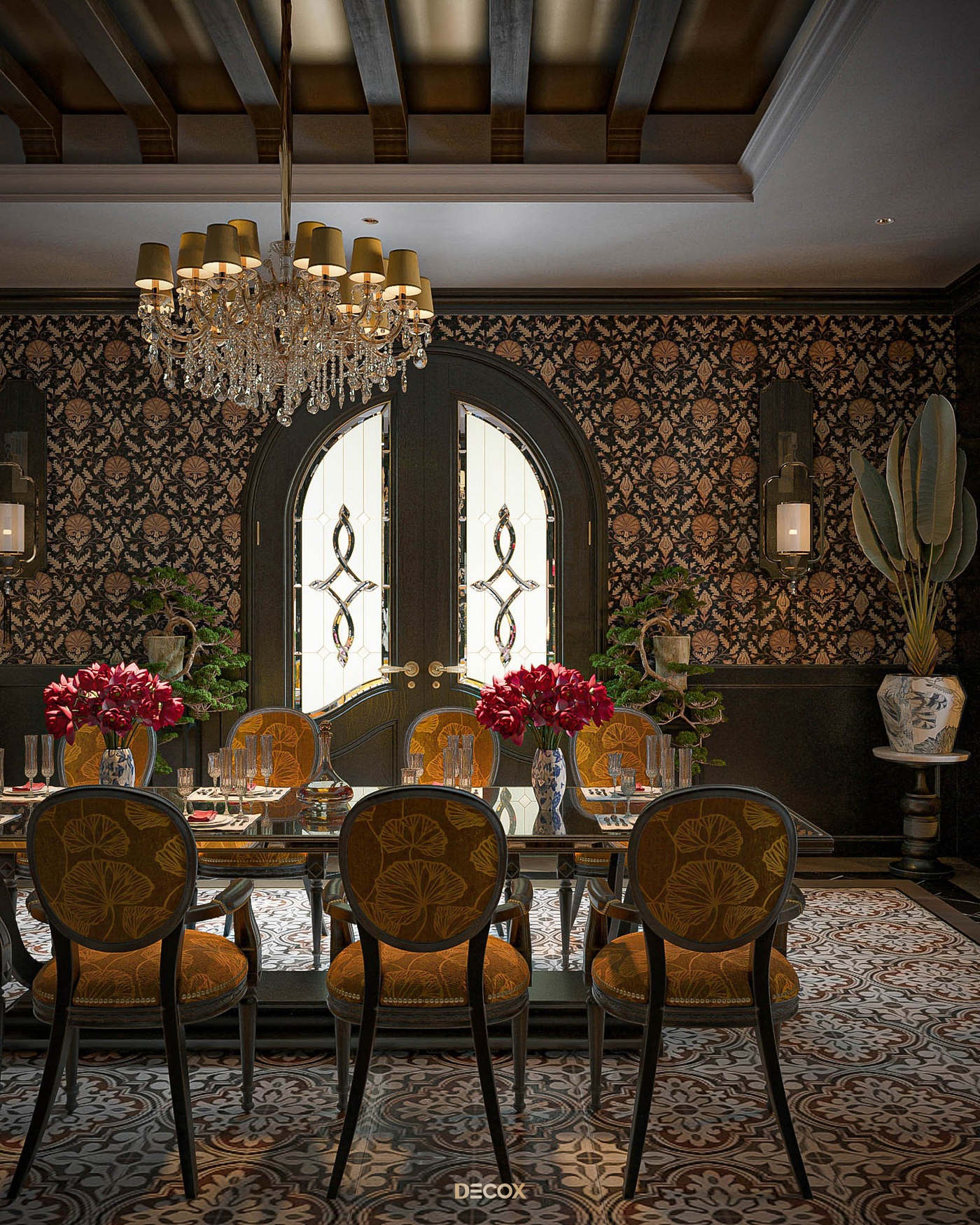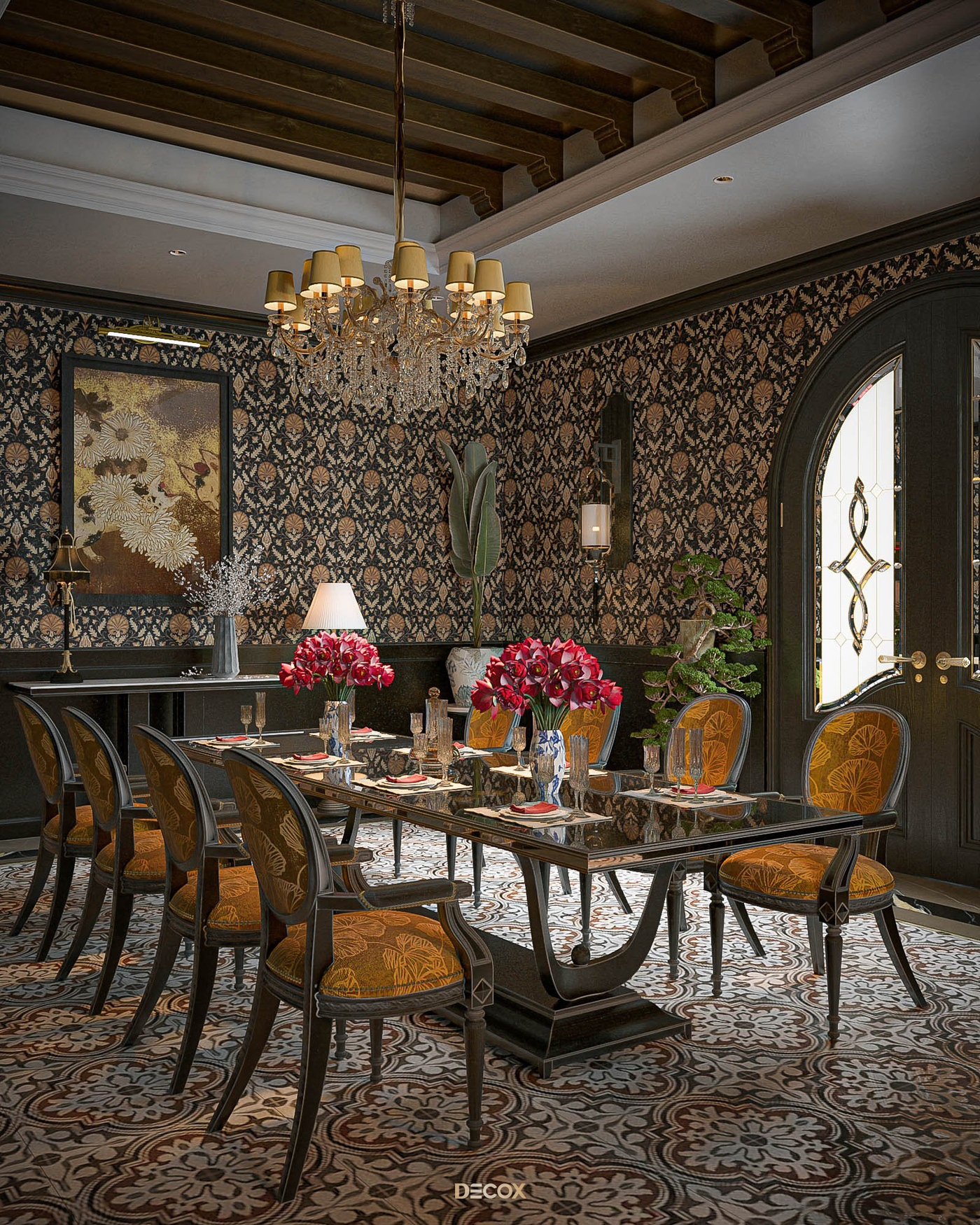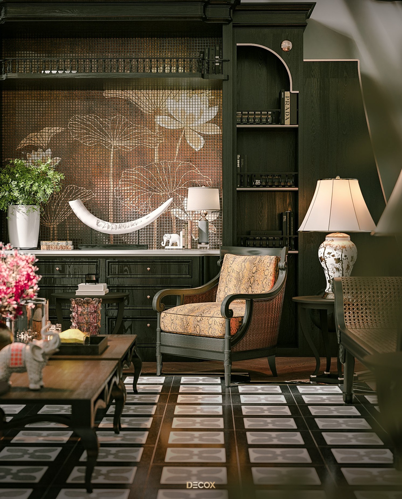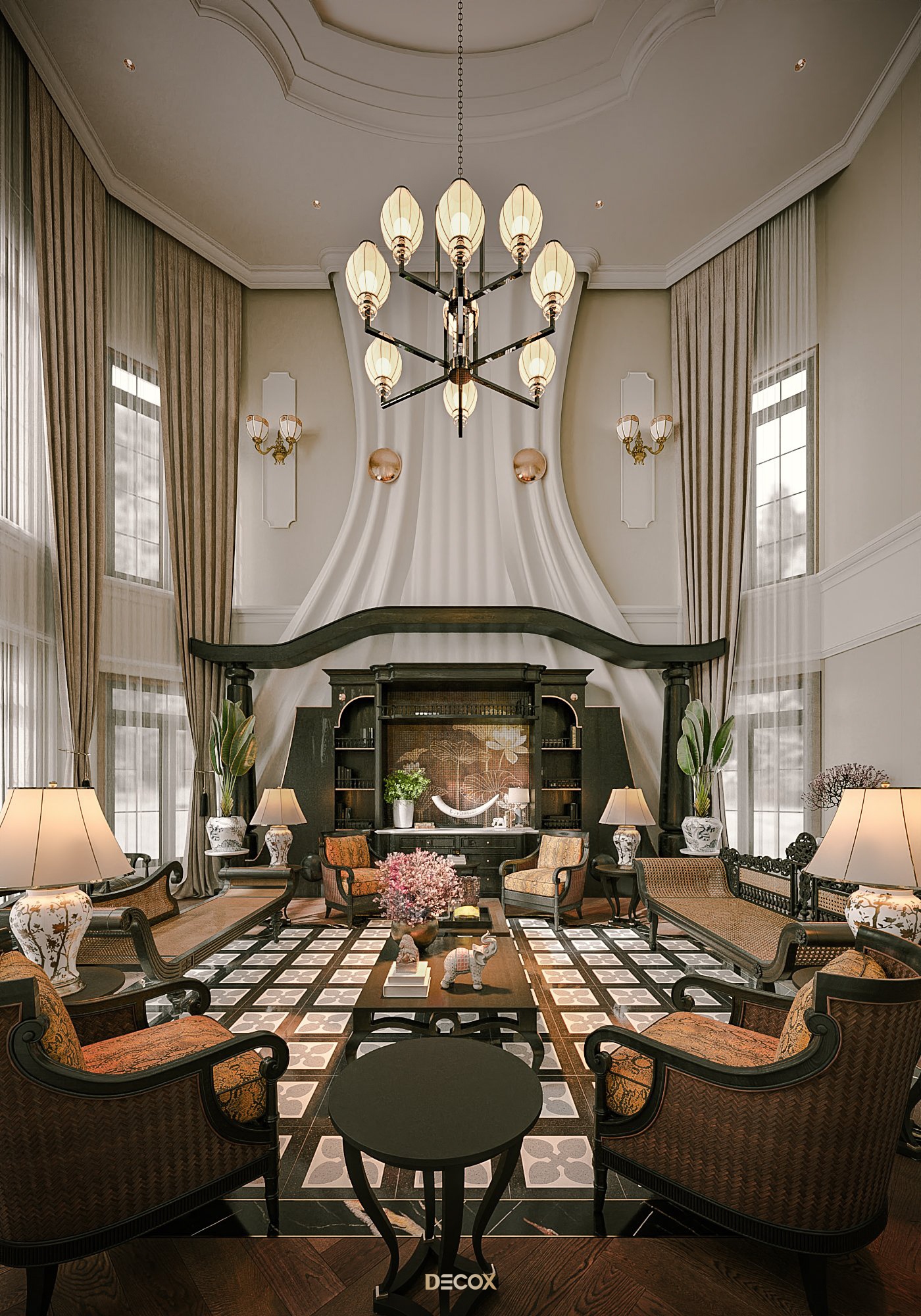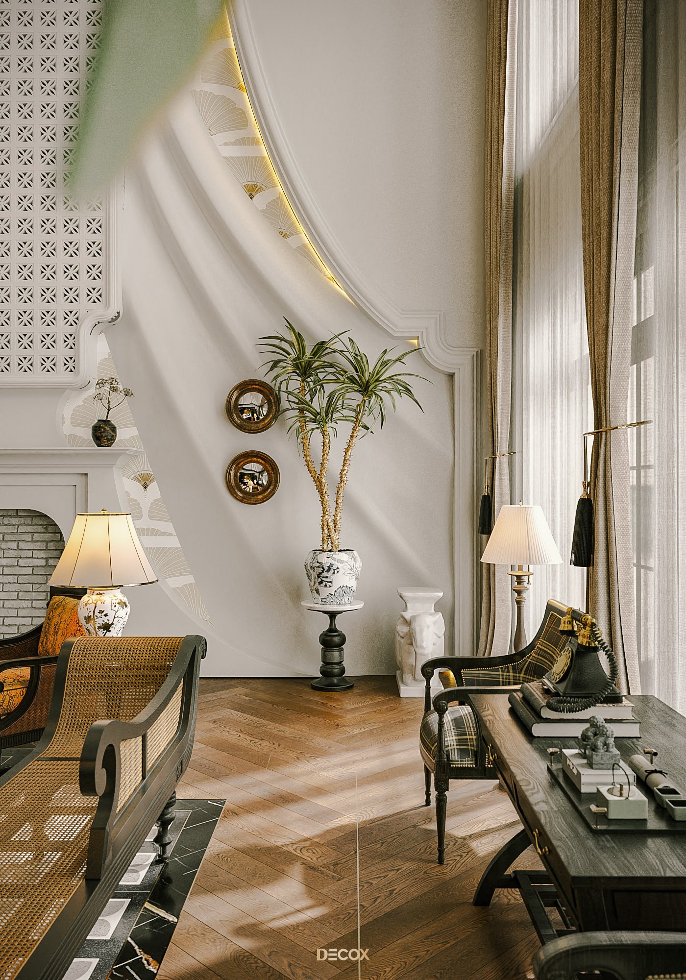 TIME VILLAS - Một căn biệt thự hòa trộn giữa phong cách Đông Dương và Art Nouveau do Decox thực hiện. Thiết kế nội thất là sự hiện diện của gam màu trầm ấm kết hợp với gỗ mun đen tạo nên sự quý phái sang trọng quyền lực cho gia chủ.