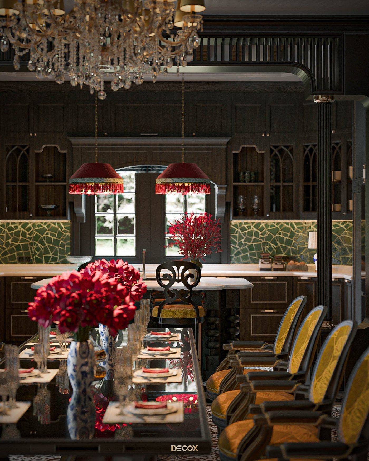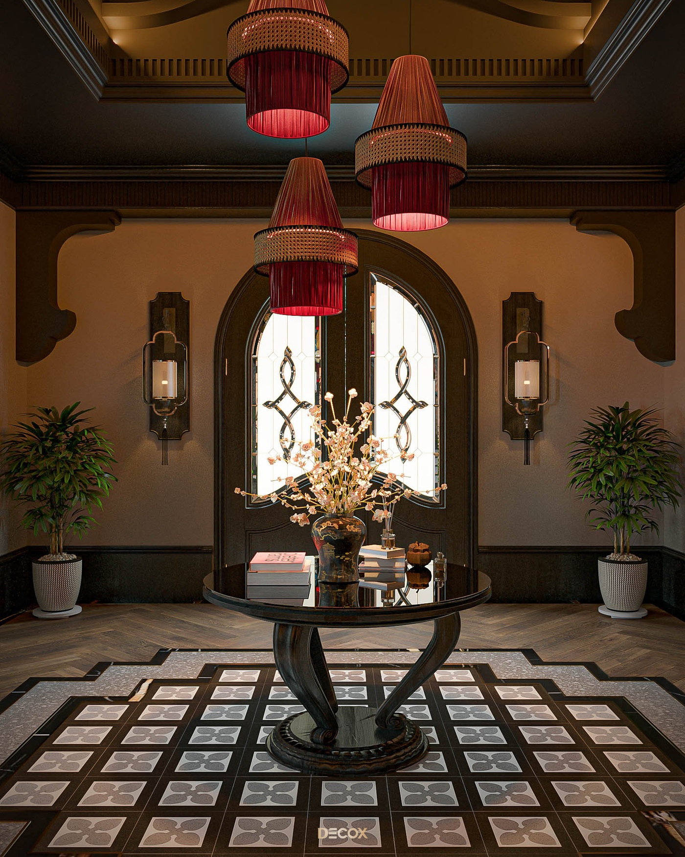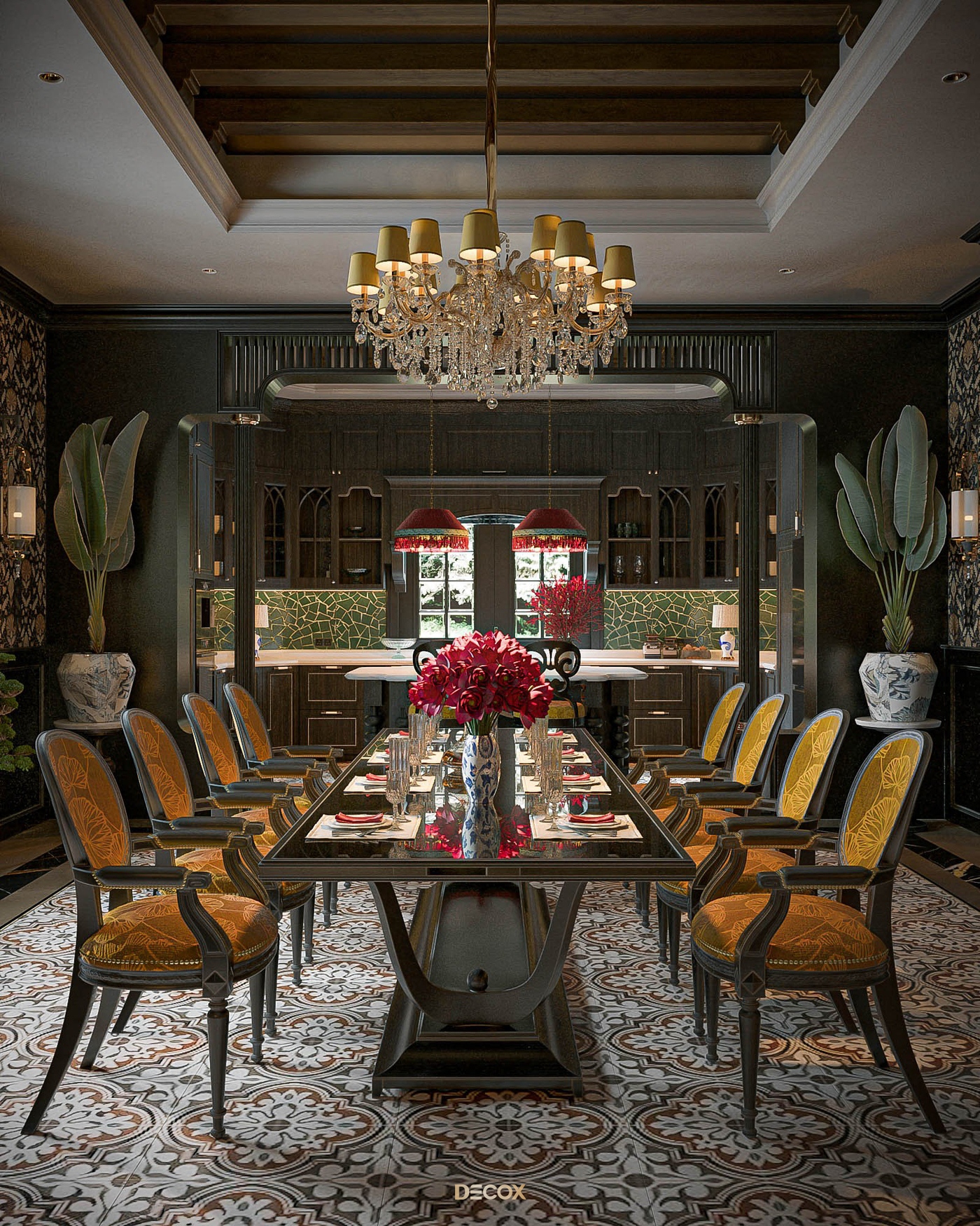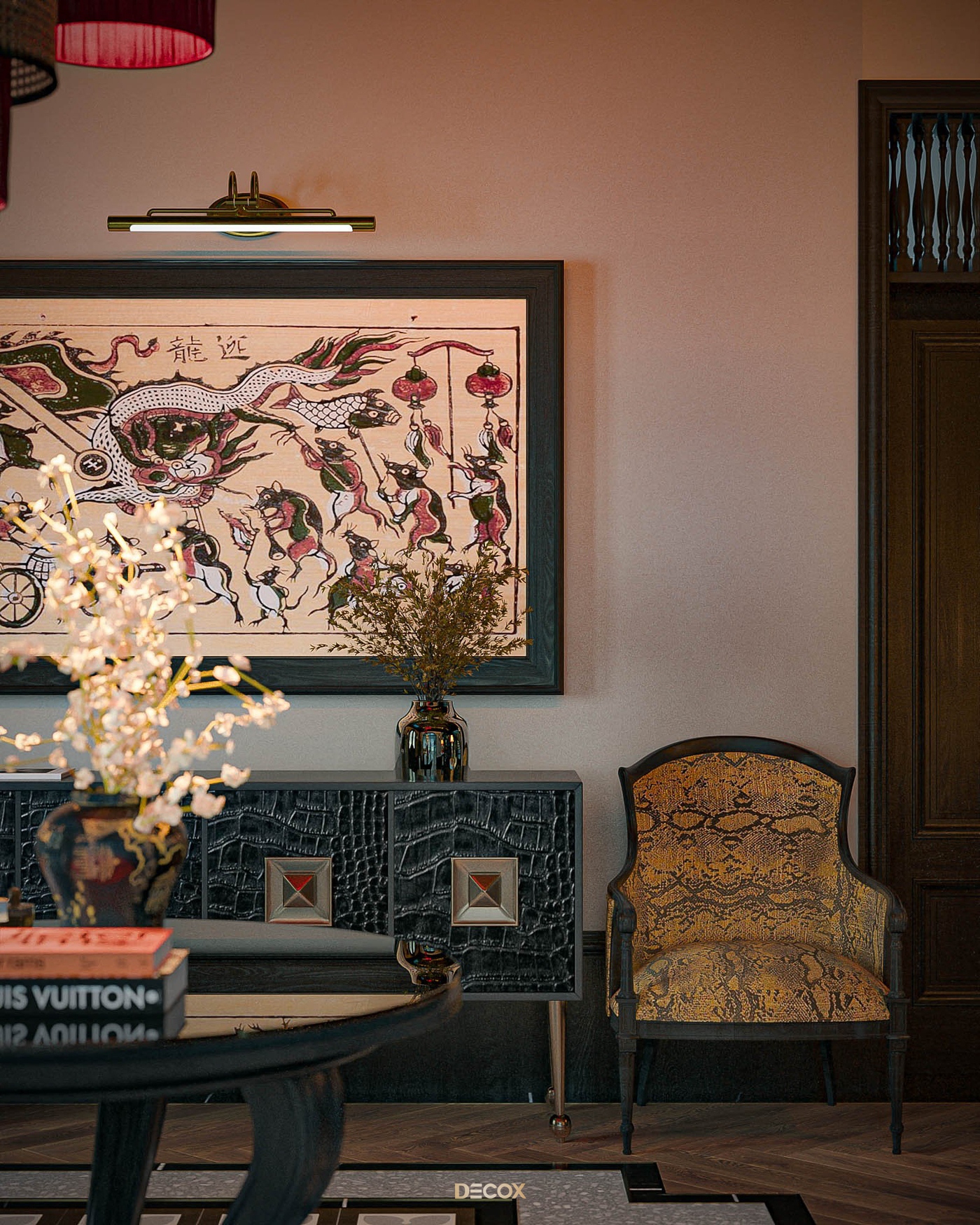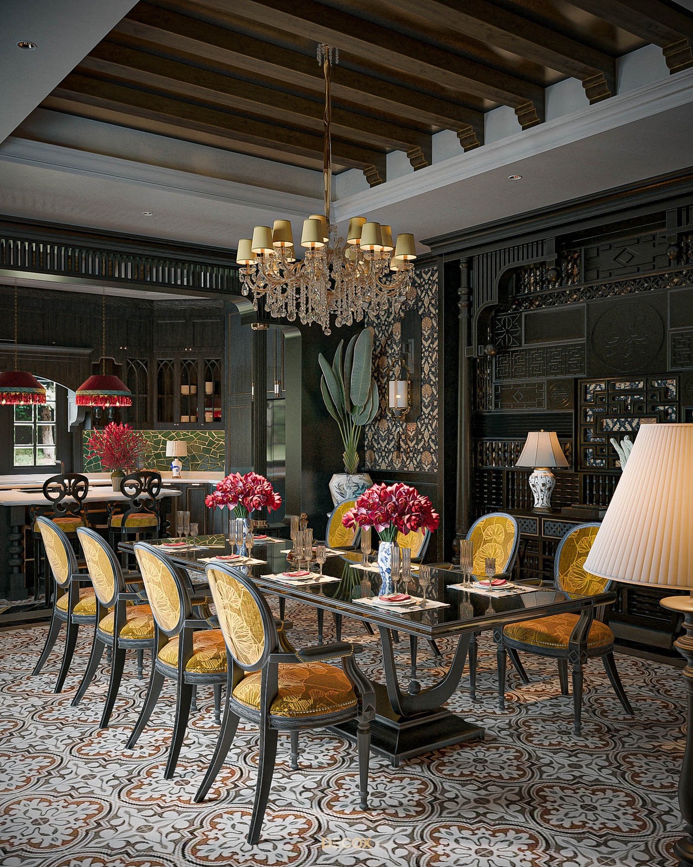 TIME VILLAS - Một căn biệt thự hòa trộn giữa phong cách Đông Dương và Art Nouveau do Decox thực hiện. Thiết kế nội thất là sự hiện diện của gam màu trầm ấm kết hợp với gỗ mun đen tạo nên sự quý phái sang trọng quyền lực cho gia chủ.