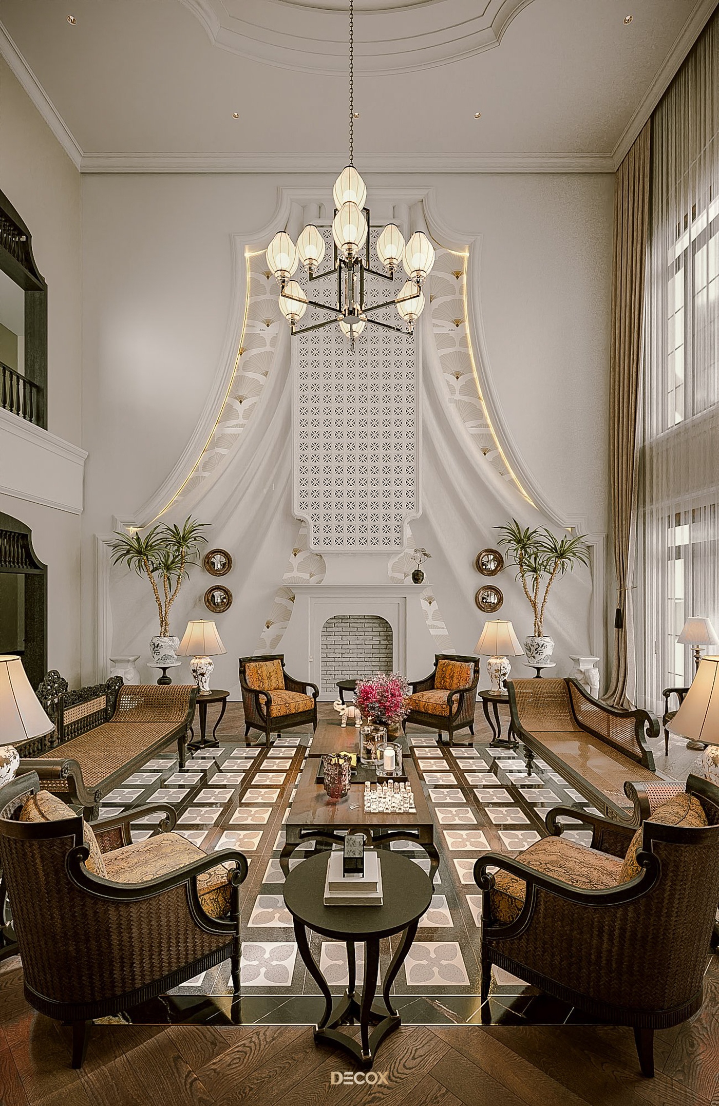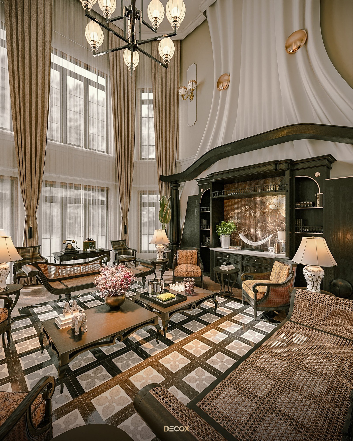 Làm mới phong cách Indochine bằng cách lồng ghép những yếu tố hình khối, đường nét tuyến tính của Art Nouveau là cách mà Decox đã áp dụng cho không gian nội thất phòng khách TIME VILLAS. Tổng thể thiết kế xoay quanh những vật liệu, chi tiết nội thất thuần chất Đông Dương như gạch bông, đồ gốm, ghế gỗ đan mây, cây xanh nhiệt đới hay những đường cong dài kiểu Asymmetrical uốn lượn mang phong thái phóng khoáng lấy cảm hứng từ thiên nhiên… tất cả được kết hợp nhịp nhàng với nhau để mang đến một tác phẩm nghệ thuật hoàn chỉnh.
