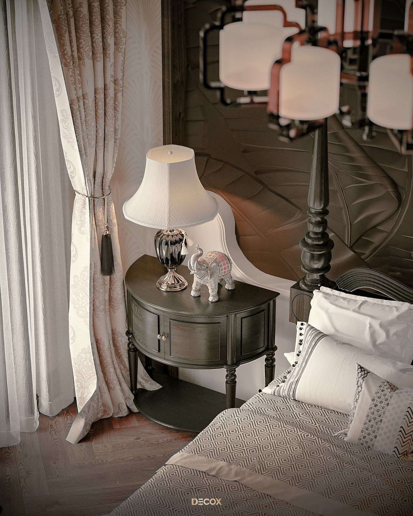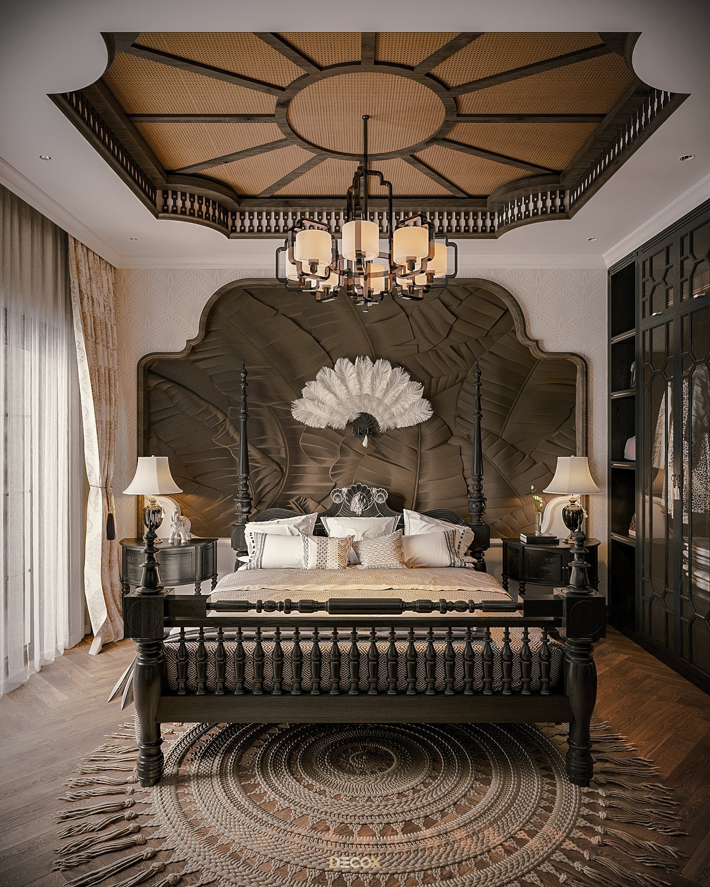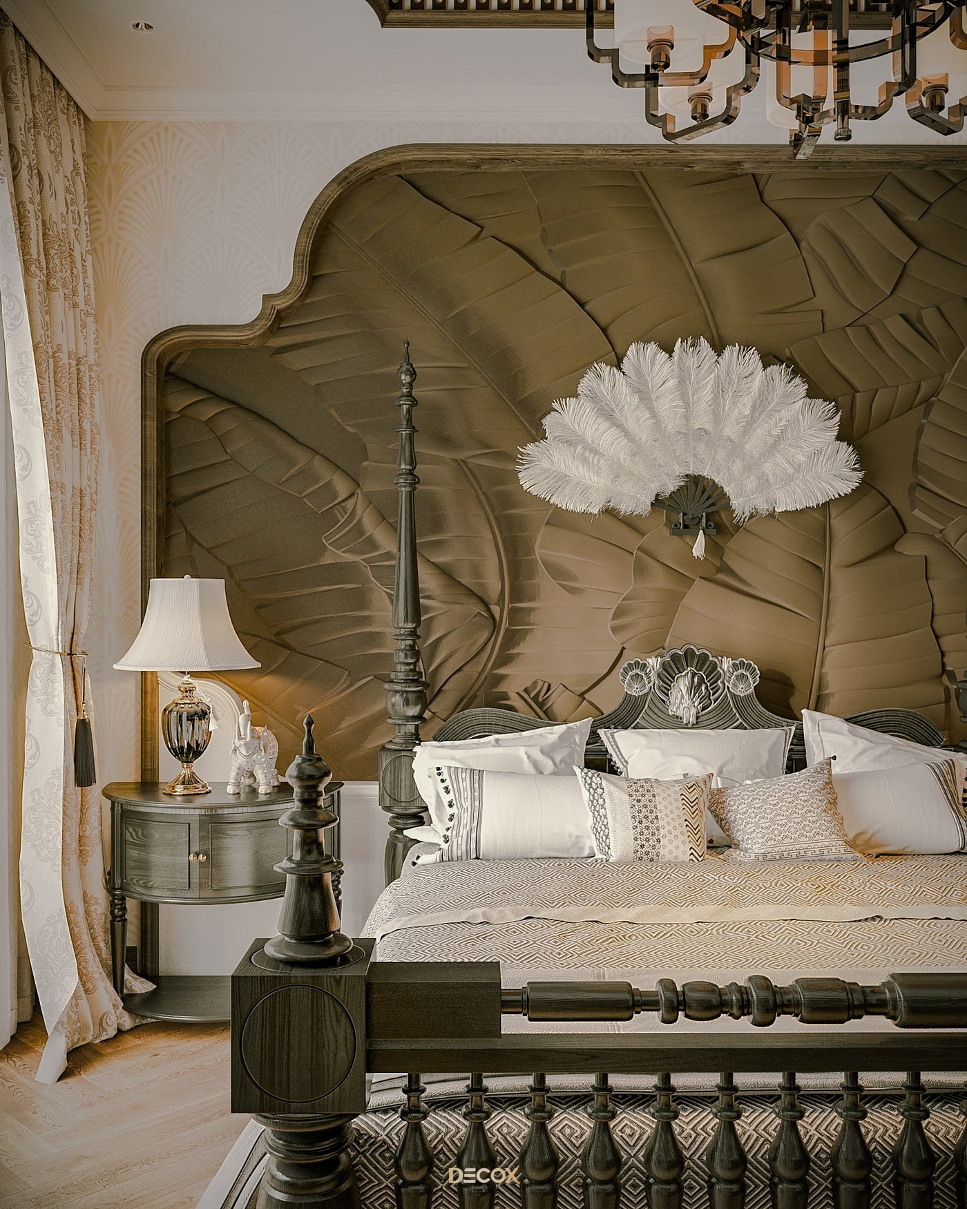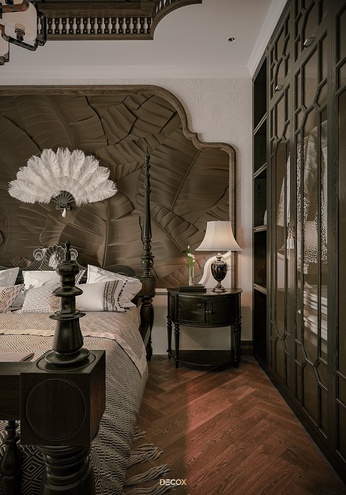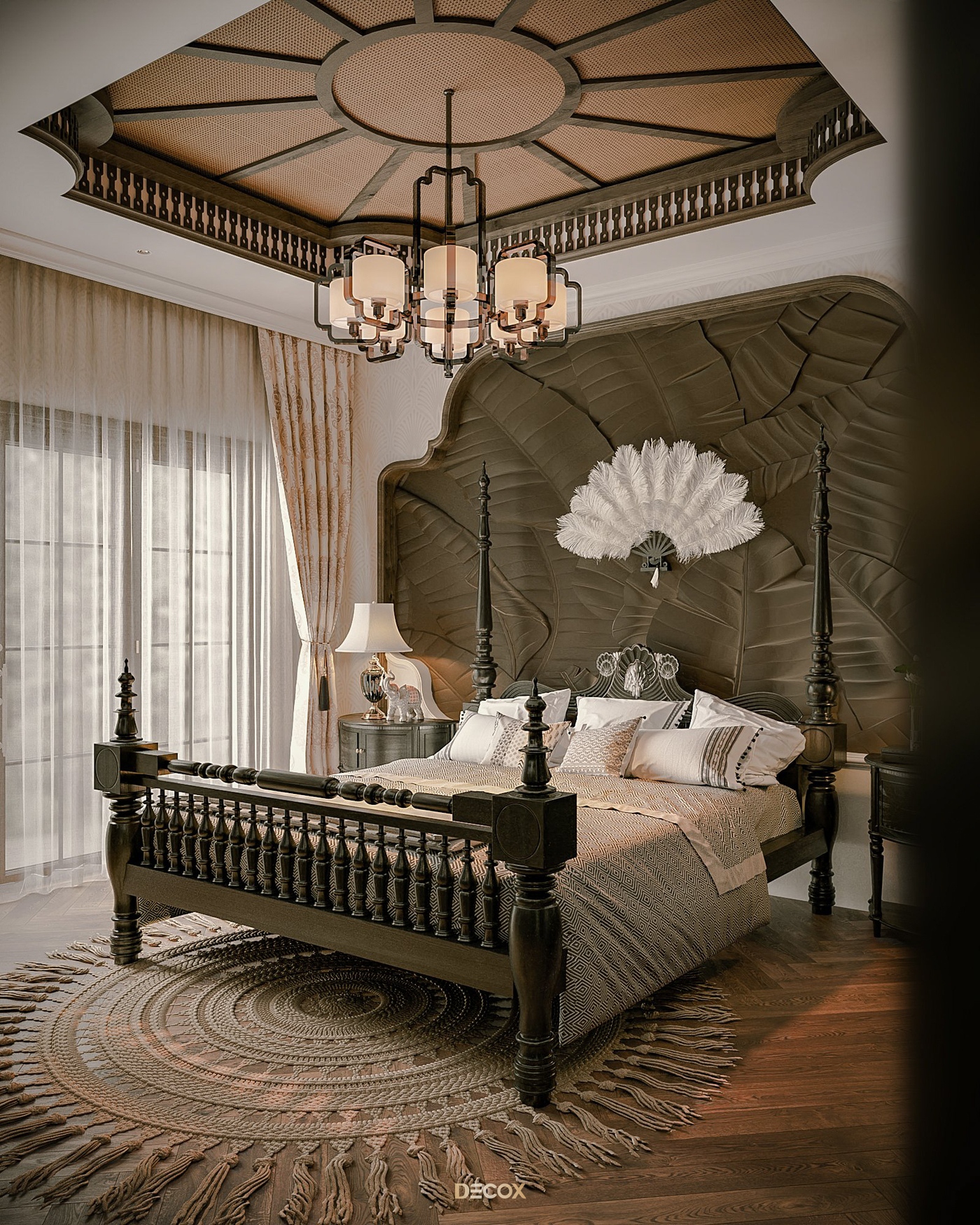 Những đường cong lượn sóng mềm mại, họa tiết cách điệu hóa đặc trưng của phong cách Art Nouveau kết hợp cùng chất gỗ mộc mạc, những chi tiết con tiện, họa tiết hình học đặc trưng của phong cách Indochine mang đến sự hấp dẫn về mặt thị giác nhưng vẫn đảm bảo tính hài hòa trong không gian. Đây chính là nét đặc biệt trong không gian phòng ngủ master dự án TIME VILLAS.