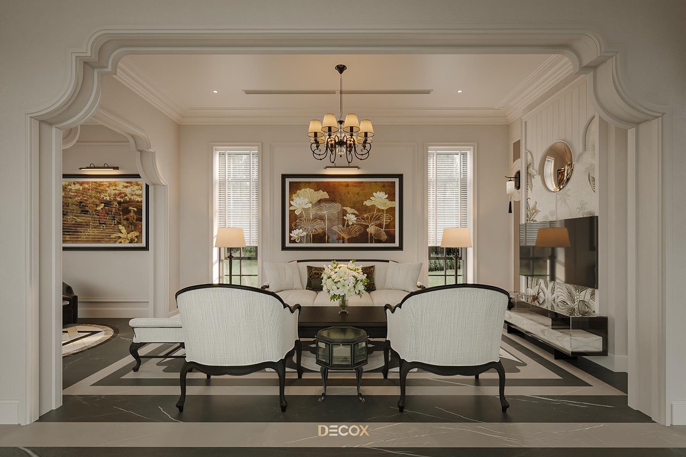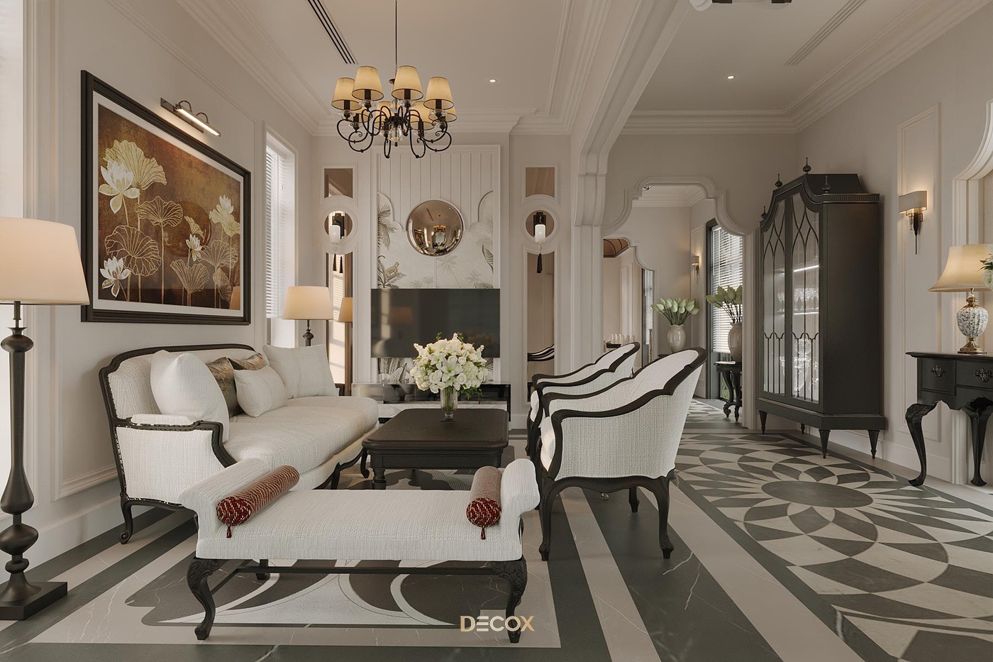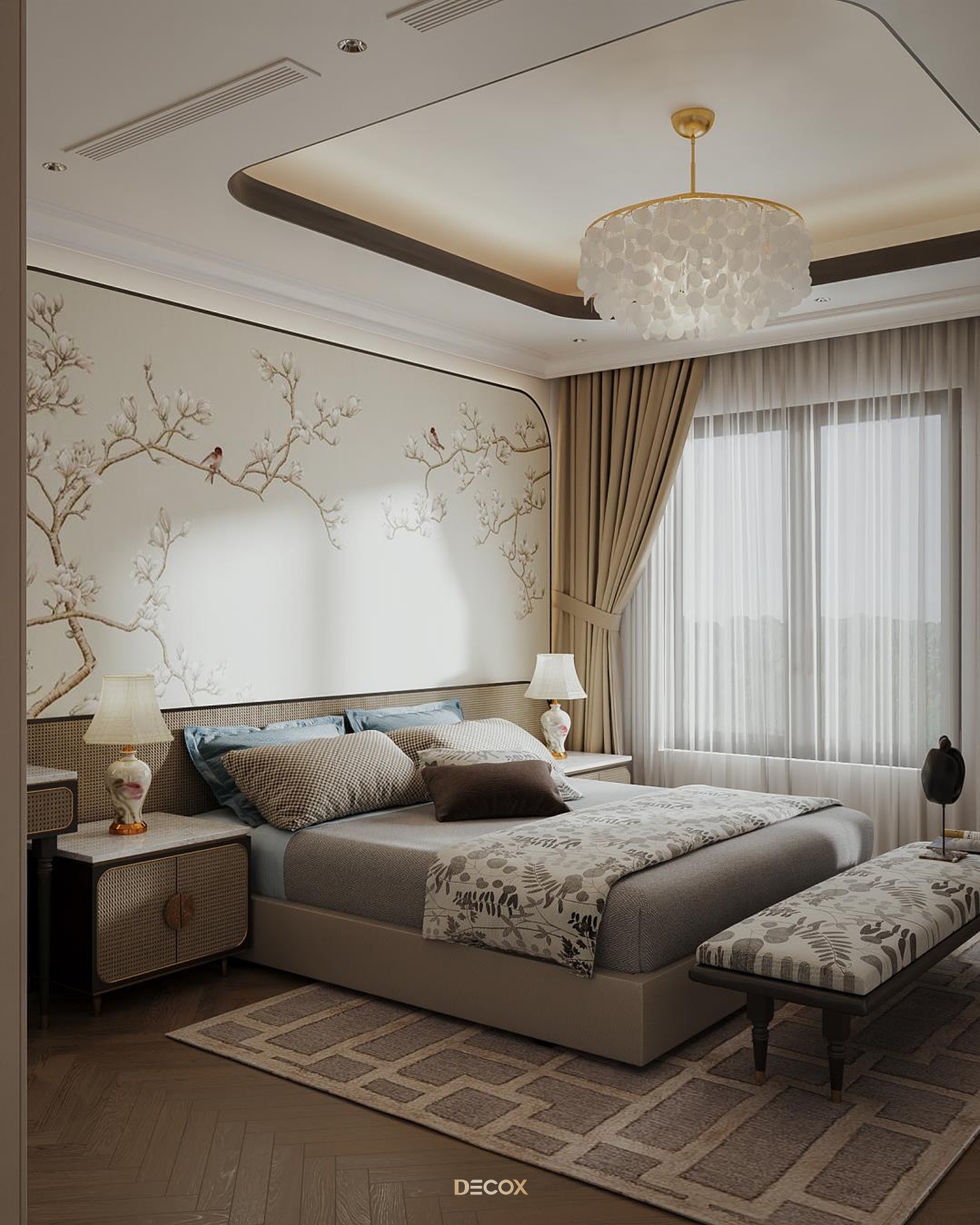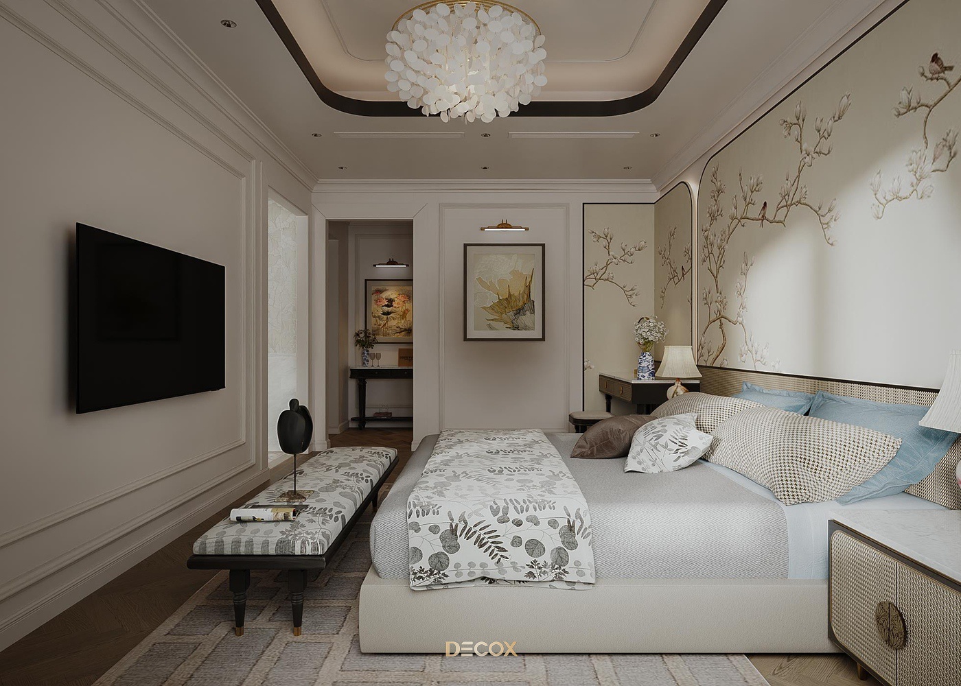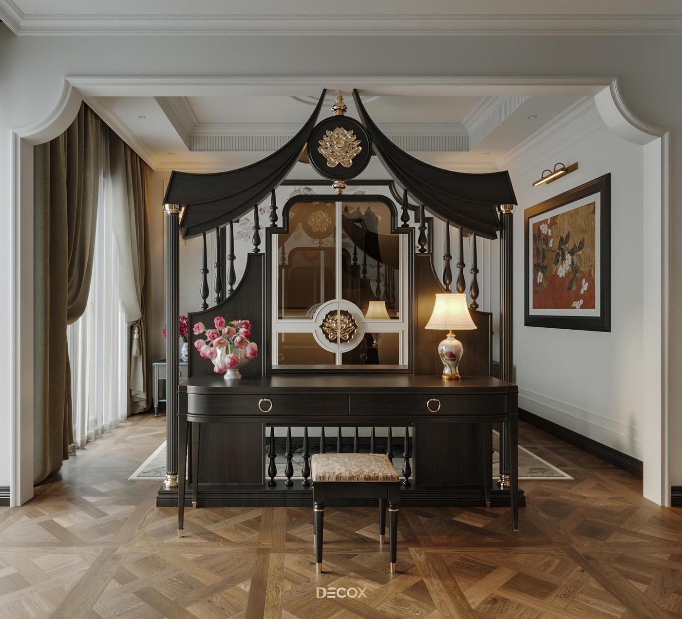 Sử dụng hiệu ứng sơn mài và tranh vẽ tay trên những tấm bình phong và vách tường được đo đạc kỹ lưỡng, Decox đã tạo nên một không gian sống độc bản, đậm đà bản sắc dân tộc. Thiết kế nội thất là sự kết hợp hài hòa giữa cổ kính và hiện đại, Á Đông và Tây phương, mang đến vẻ đẹp vừa sang trọng vừa thân thuộc. Điểm nhấn đặc biệt trong thiết kế còn nằm ở việc sử dụng những món đồ nội thất thủ công, tạo nên phong cách sống cá nhân hóa. Những họa tiết dân gian, hình ảnh chim muông, hoa lá và biểu tượng chim hạc mang ý nghĩa tốt lành đều được sắp xếp một cách hài hòa, có chủ đích, tạo nên giá trị tinh tế và đầy nghệ thuật cho tổ ấm.