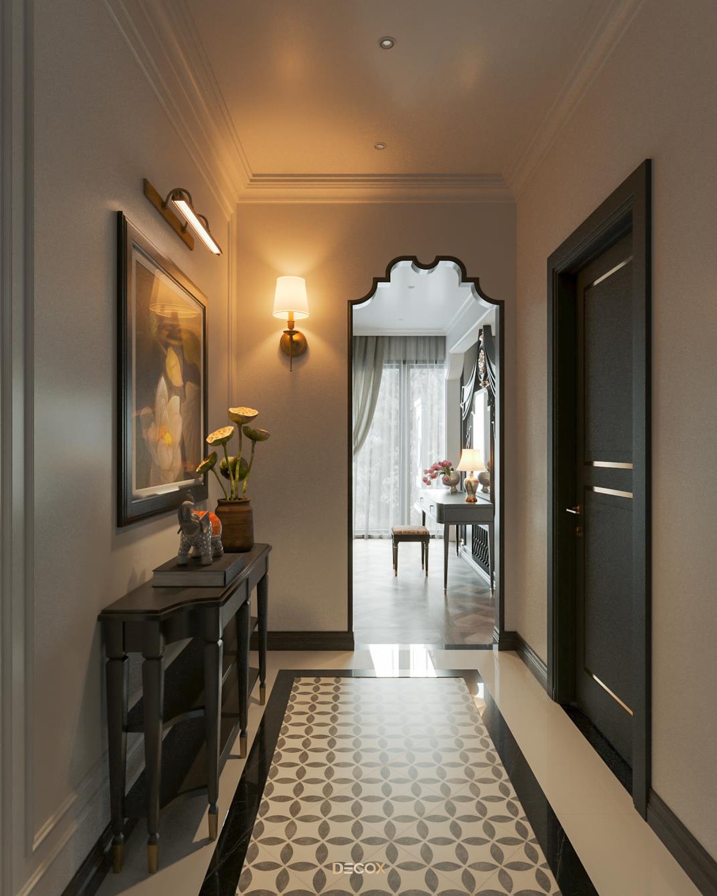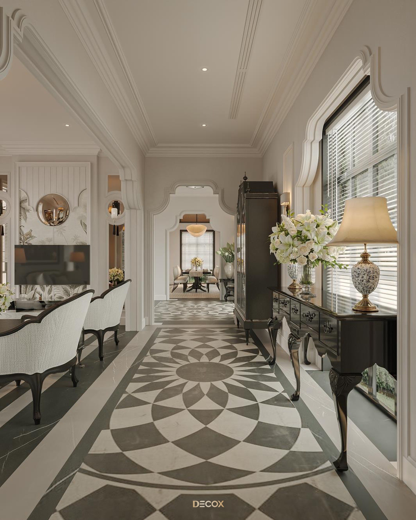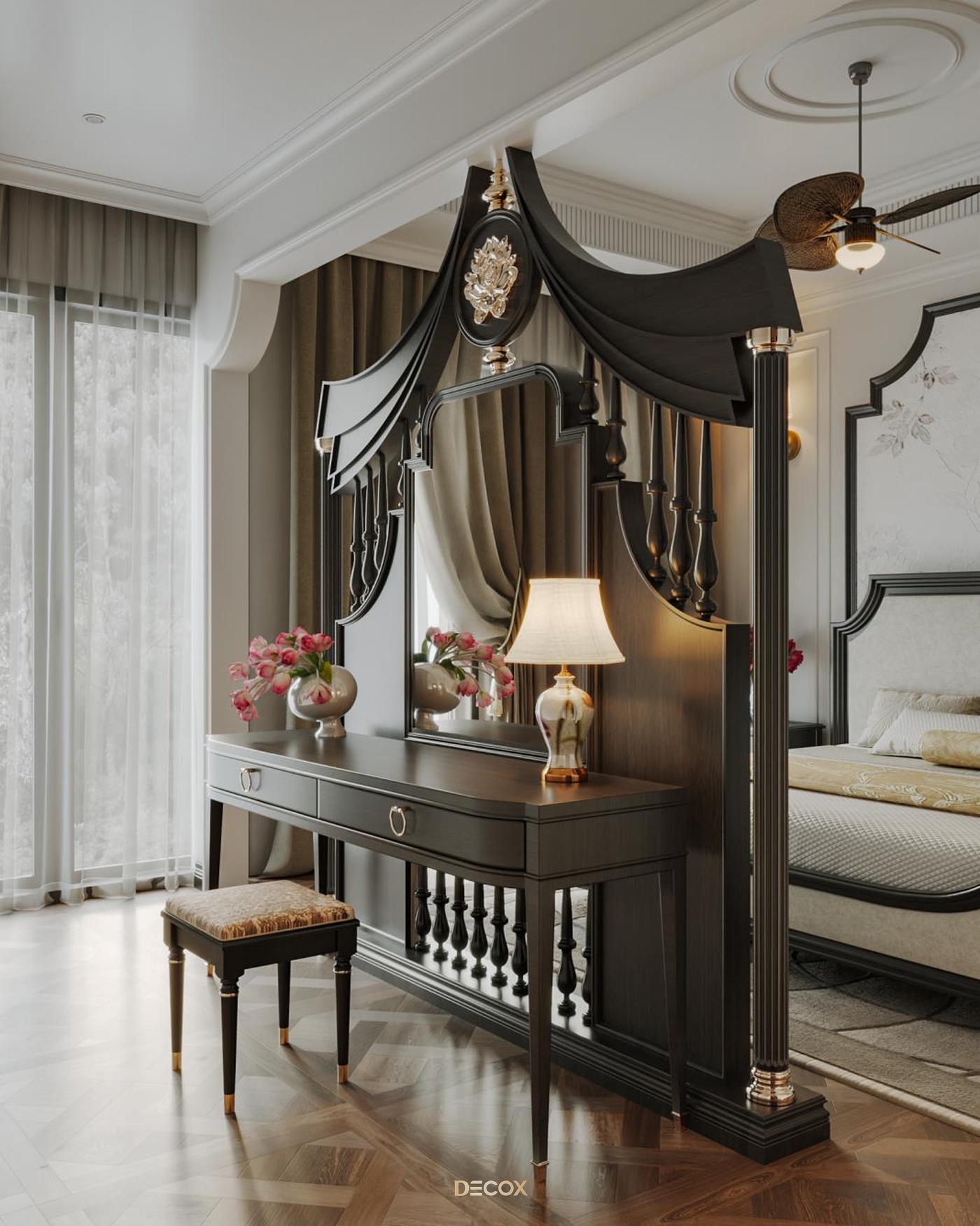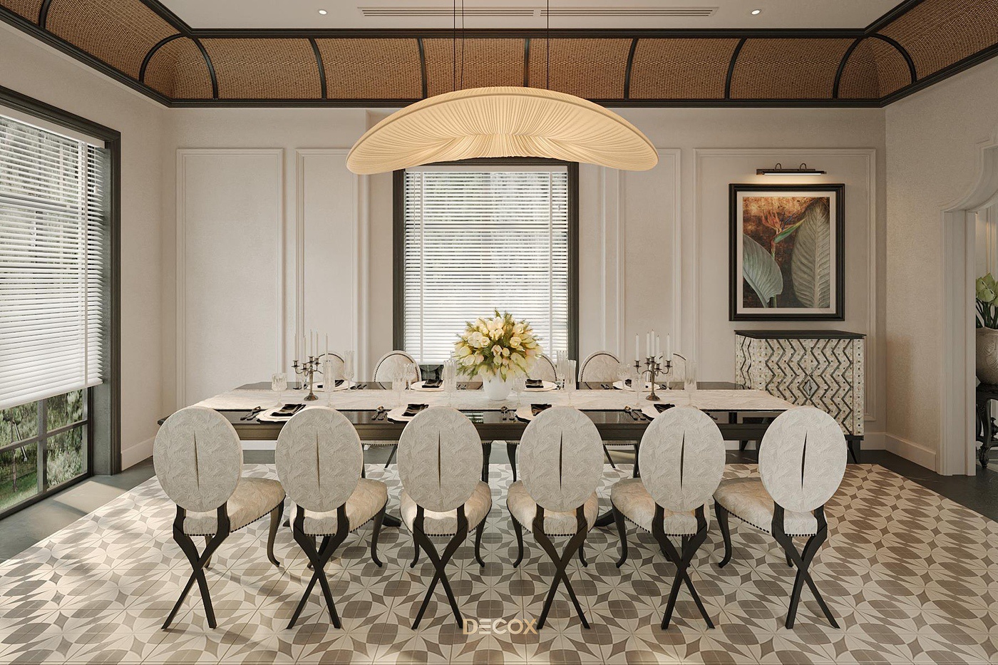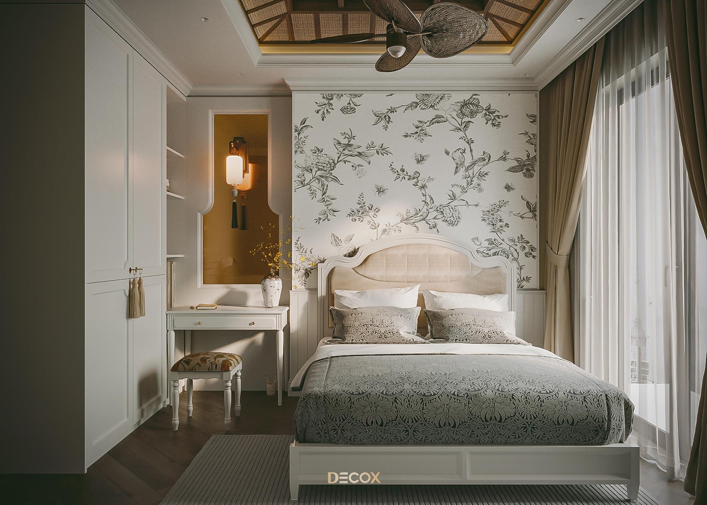 Sử dụng hiệu ứng sơn mài và tranh vẽ tay trên những tấm bình phong và vách tường được đo đạc kỹ lưỡng, Decox đã tạo nên một không gian sống độc bản, đậm đà bản sắc dân tộc. Thiết kế nội thất là sự kết hợp hài hòa giữa cổ kính và hiện đại, Á Đông và Tây phương, mang đến vẻ đẹp vừa sang trọng vừa thân thuộc. Điểm nhấn đặc biệt trong thiết kế còn nằm ở việc sử dụng những món đồ nội thất thủ công, tạo nên phong cách sống cá nhân hóa. Những họa tiết dân gian, hình ảnh chim muông, hoa lá và biểu tượng chim hạc mang ý nghĩa tốt lành đều được sắp xếp một cách hài hòa, có chủ đích, tạo nên giá trị tinh tế và đầy nghệ thuật cho tổ ấm.