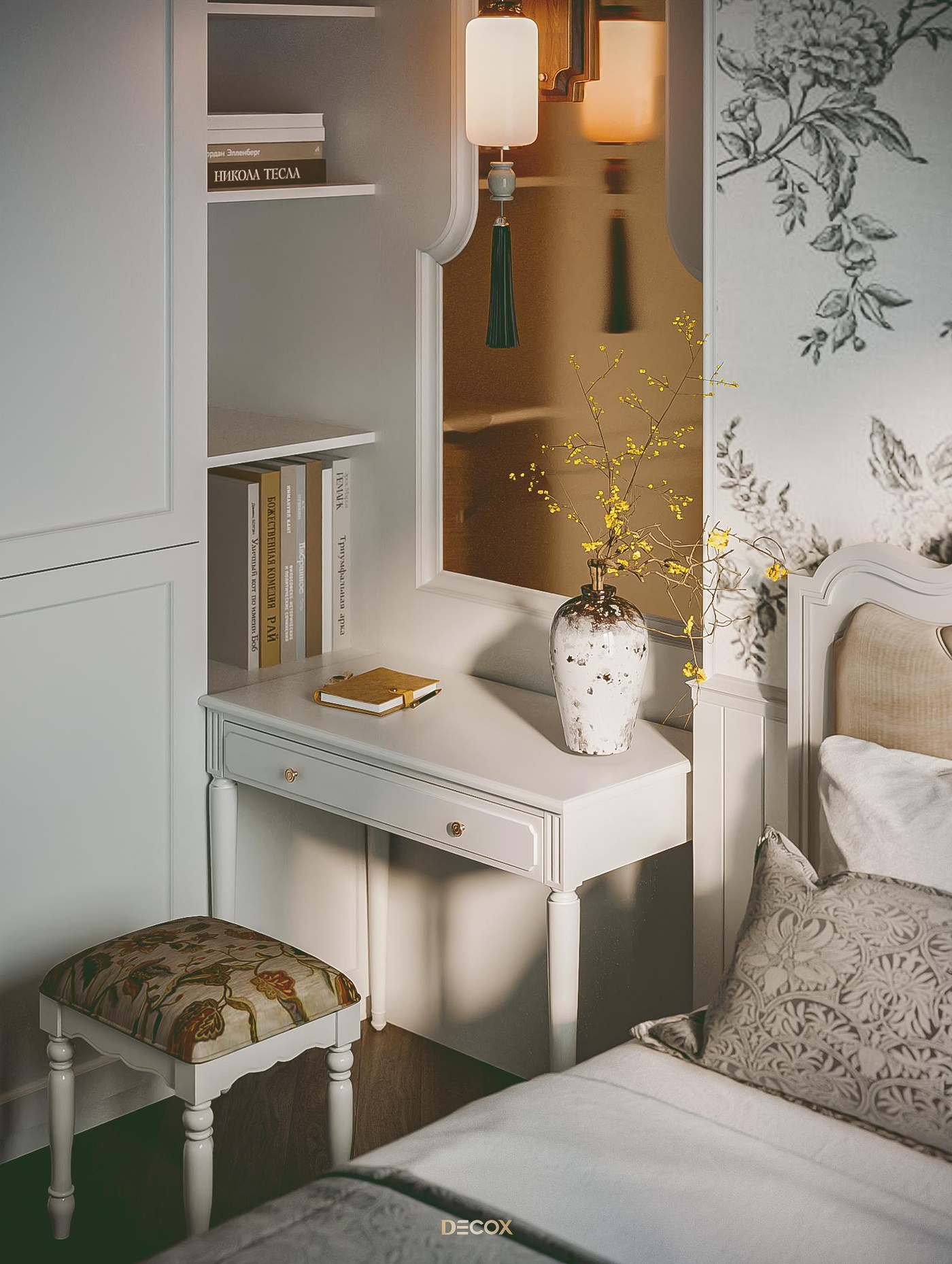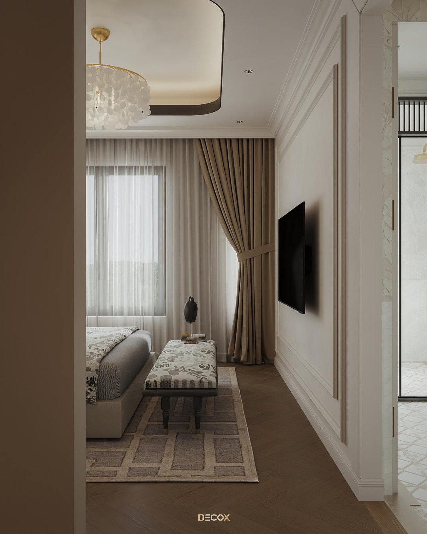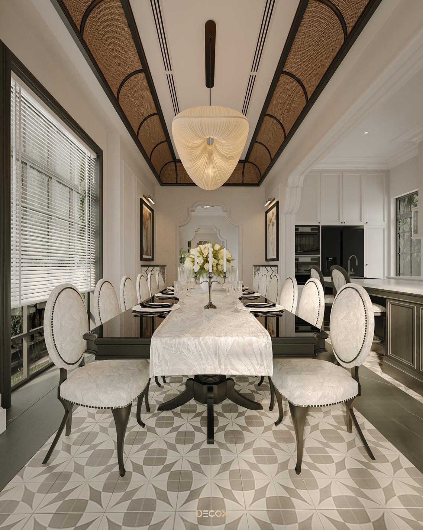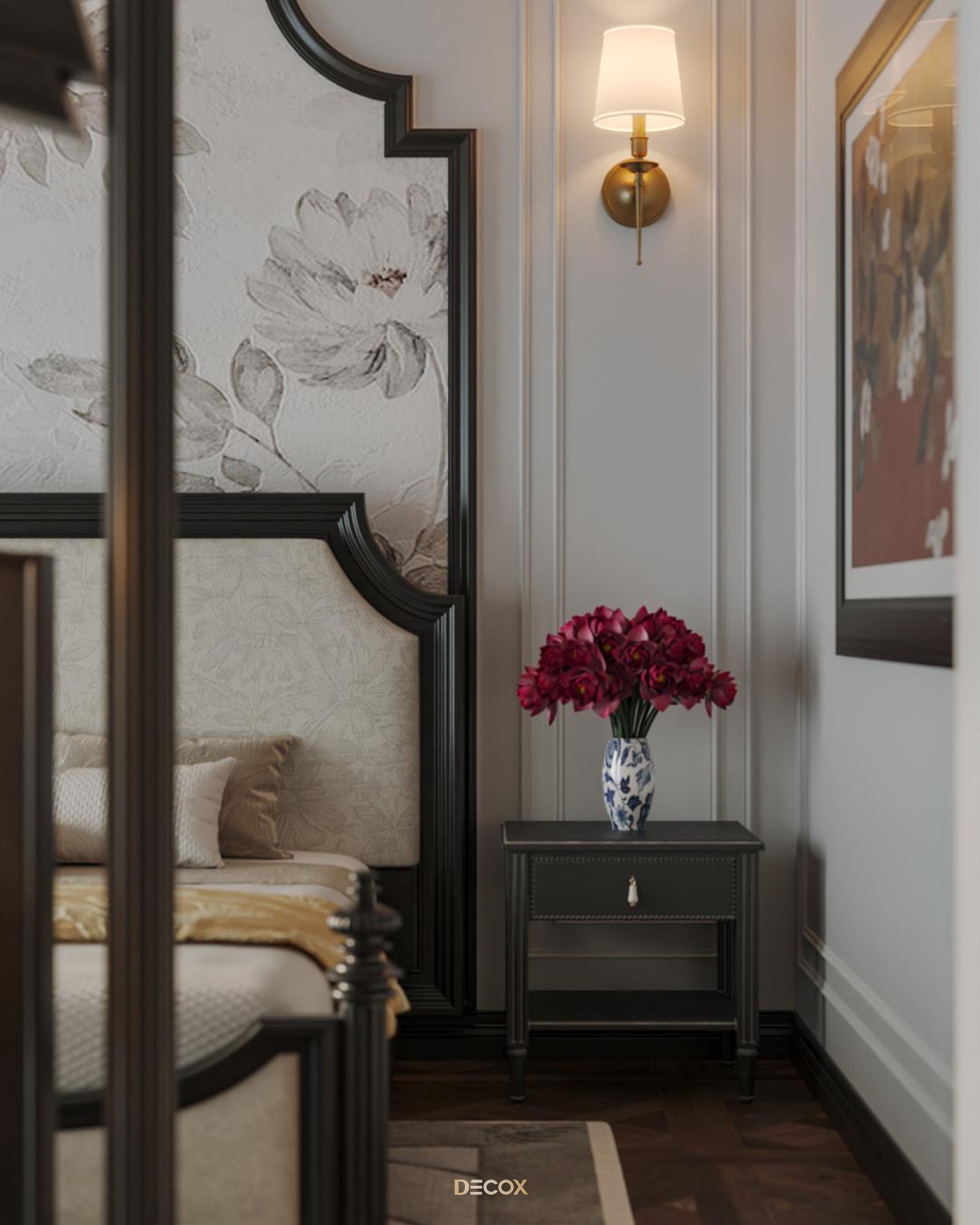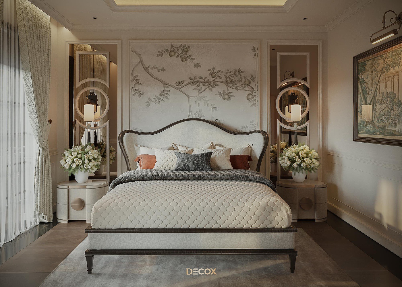 Sử dụng hiệu ứng sơn mài và tranh vẽ tay trên những tấm bình phong và vách tường được đo đạc kỹ lưỡng, Decox đã tạo nên một không gian sống độc bản, đậm đà bản sắc dân tộc. Thiết kế nội thất là sự kết hợp hài hòa giữa cổ kính và hiện đại, Á Đông và Tây phương, mang đến vẻ đẹp vừa sang trọng vừa thân thuộc. Điểm nhấn đặc biệt trong thiết kế còn nằm ở việc sử dụng những món đồ nội thất thủ công, tạo nên phong cách sống cá nhân hóa. Những họa tiết dân gian, hình ảnh chim muông, hoa lá và biểu tượng chim hạc mang ý nghĩa tốt lành đều được sắp xếp một cách hài hòa, có chủ đích, tạo nên giá trị tinh tế và đầy nghệ thuật cho tổ ấm.