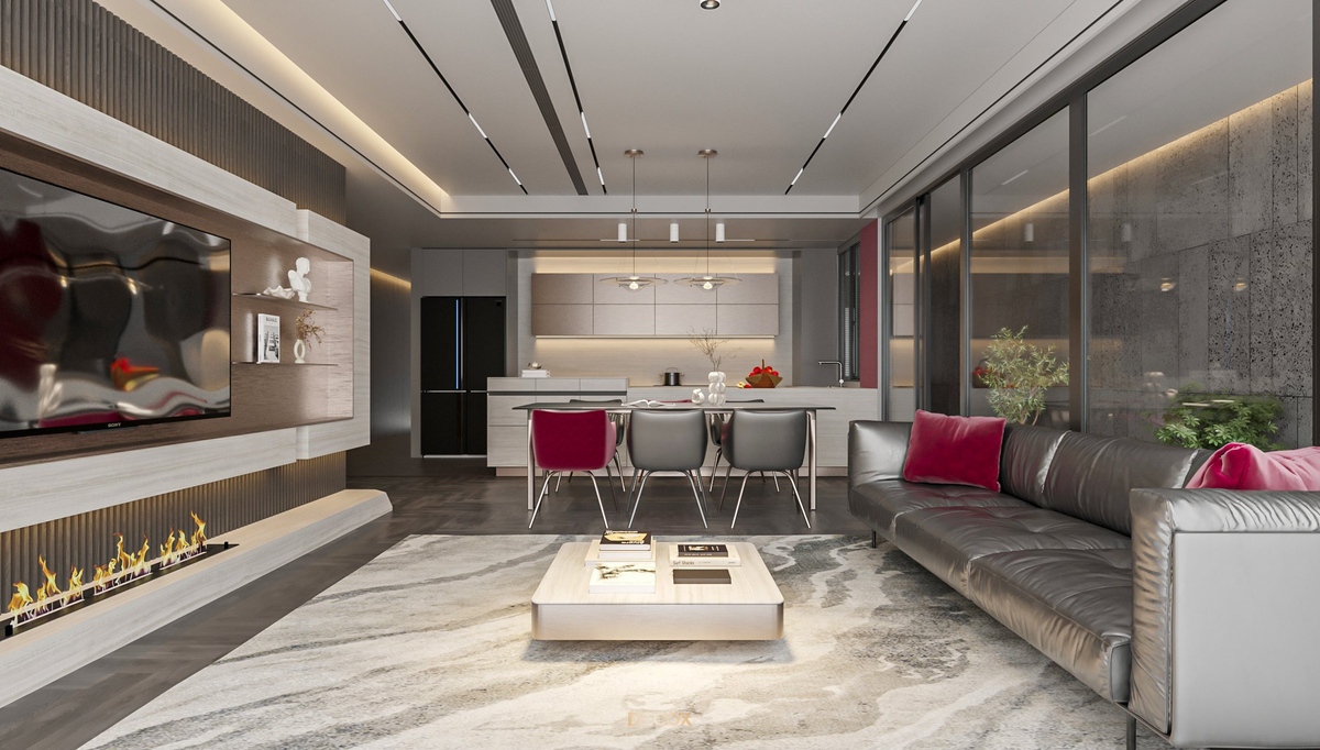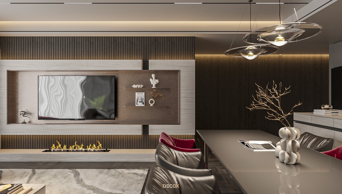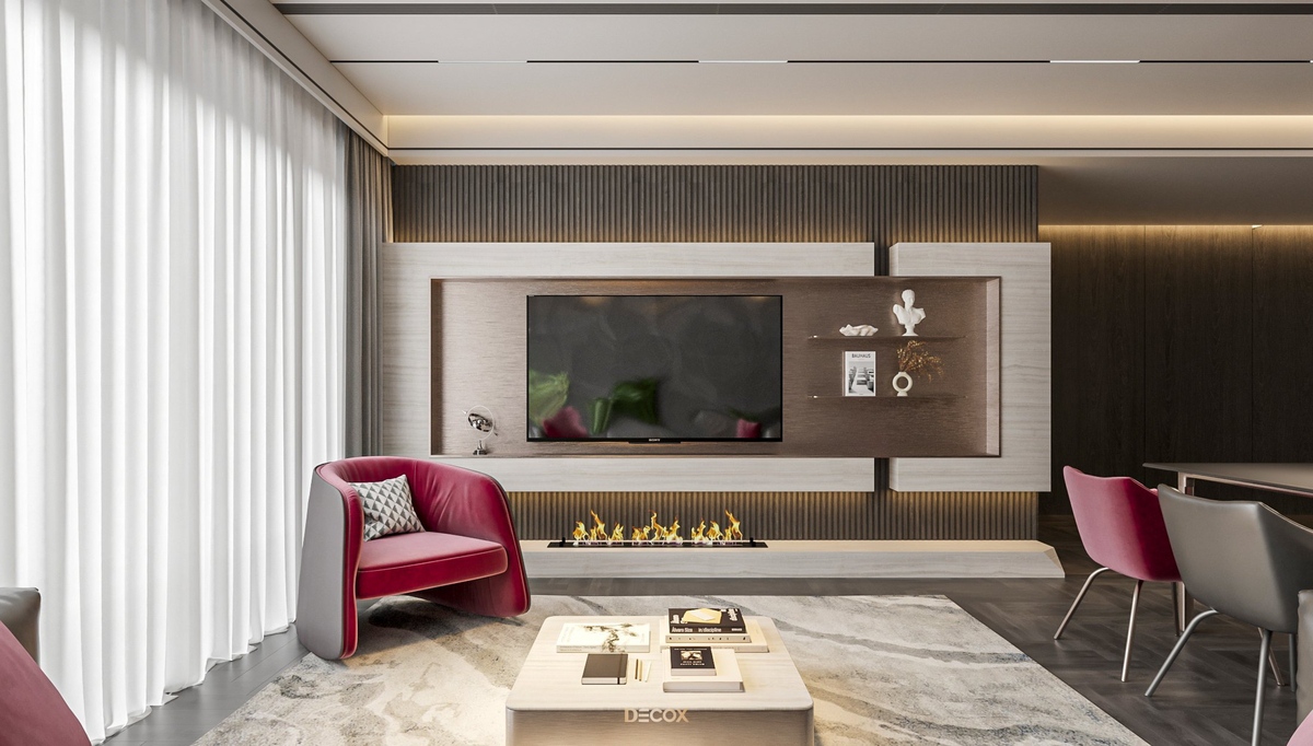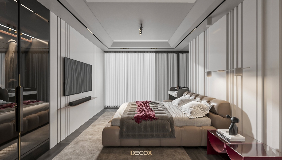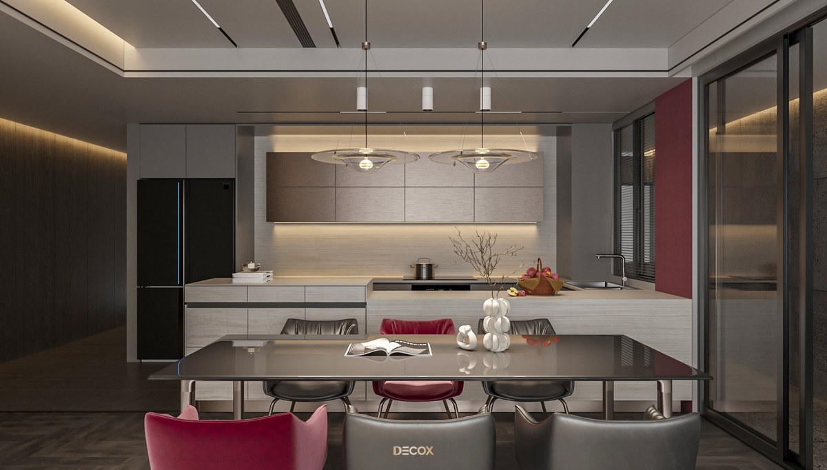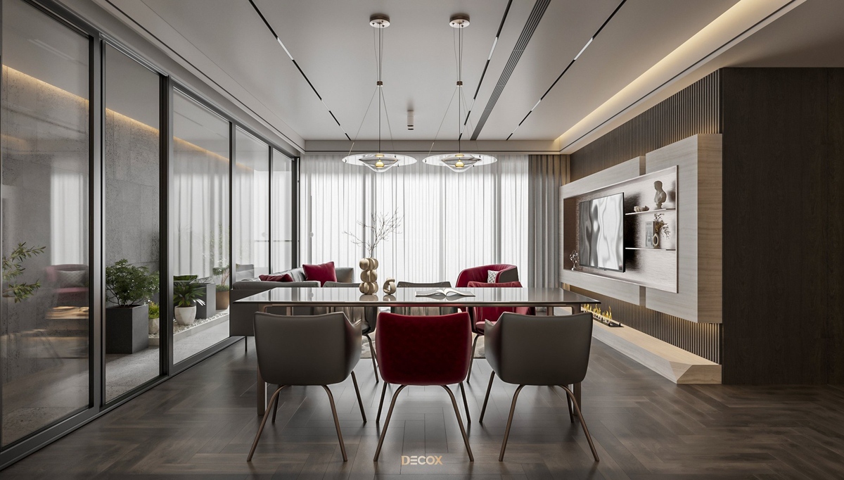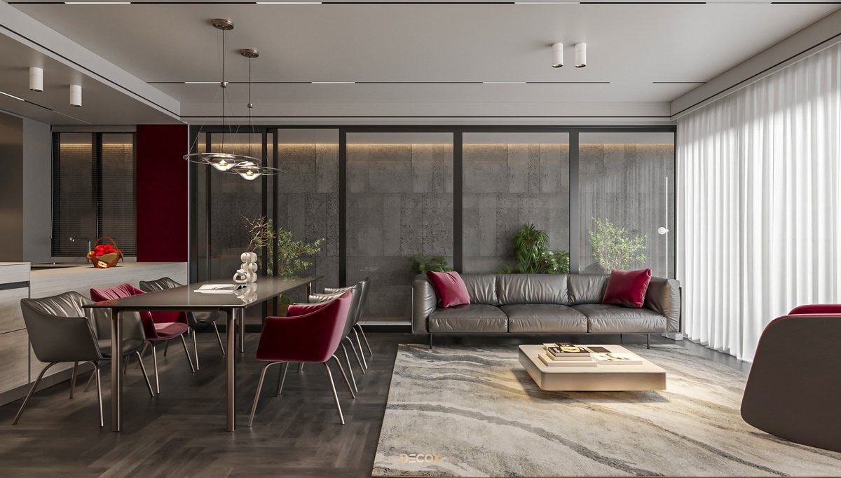Sự kết hợp hài hòa giữa màu sắc và thiên nhiên đã mang đến sự hấp dẫn về mặt thị giác trong thiết kế nội thất căn hộ rộng 157m2 này. Điểm nhấn dự án là tone màu đỏ cá tính, sang trọng nổi bật trên nền trung tính và những đường nét tinh giản chủ đạo. Bên cạnh những đường thẳng tuyến tính đặc trưng trong phong cách hiện đại, KTS Decox cũng khéo léo bổ sung thêm những đường cong uyển chuyển để tạo nên dòng chảy mềm mại, tôn lên vẻ đẹp nội thất trong không gian.