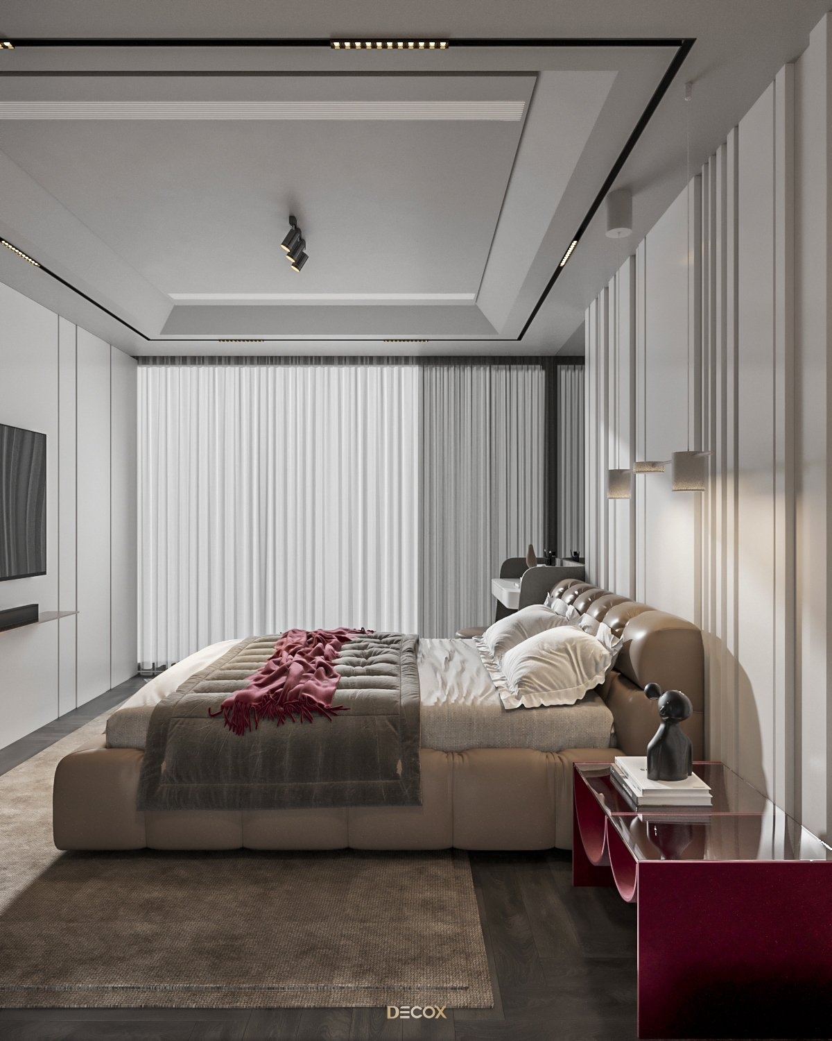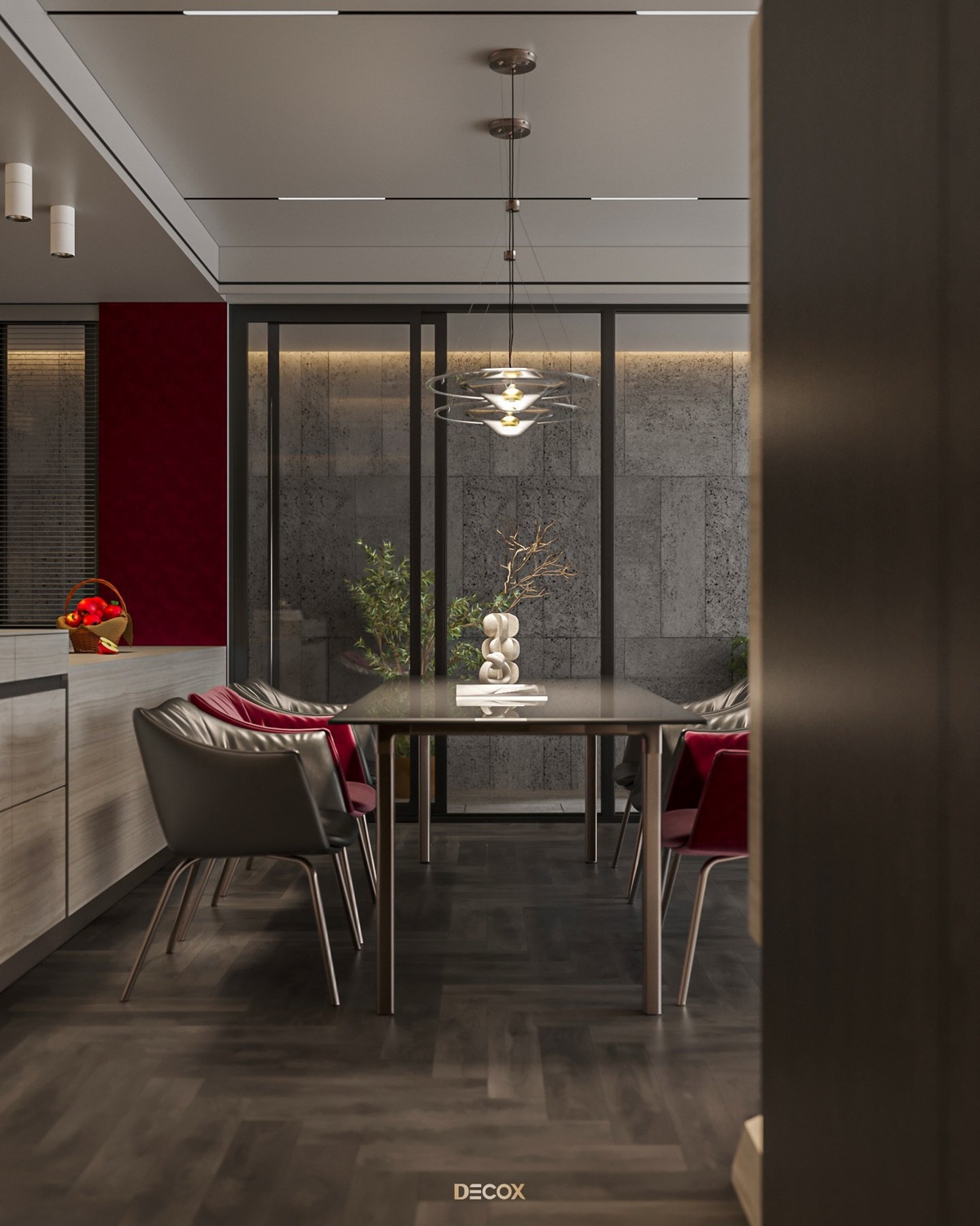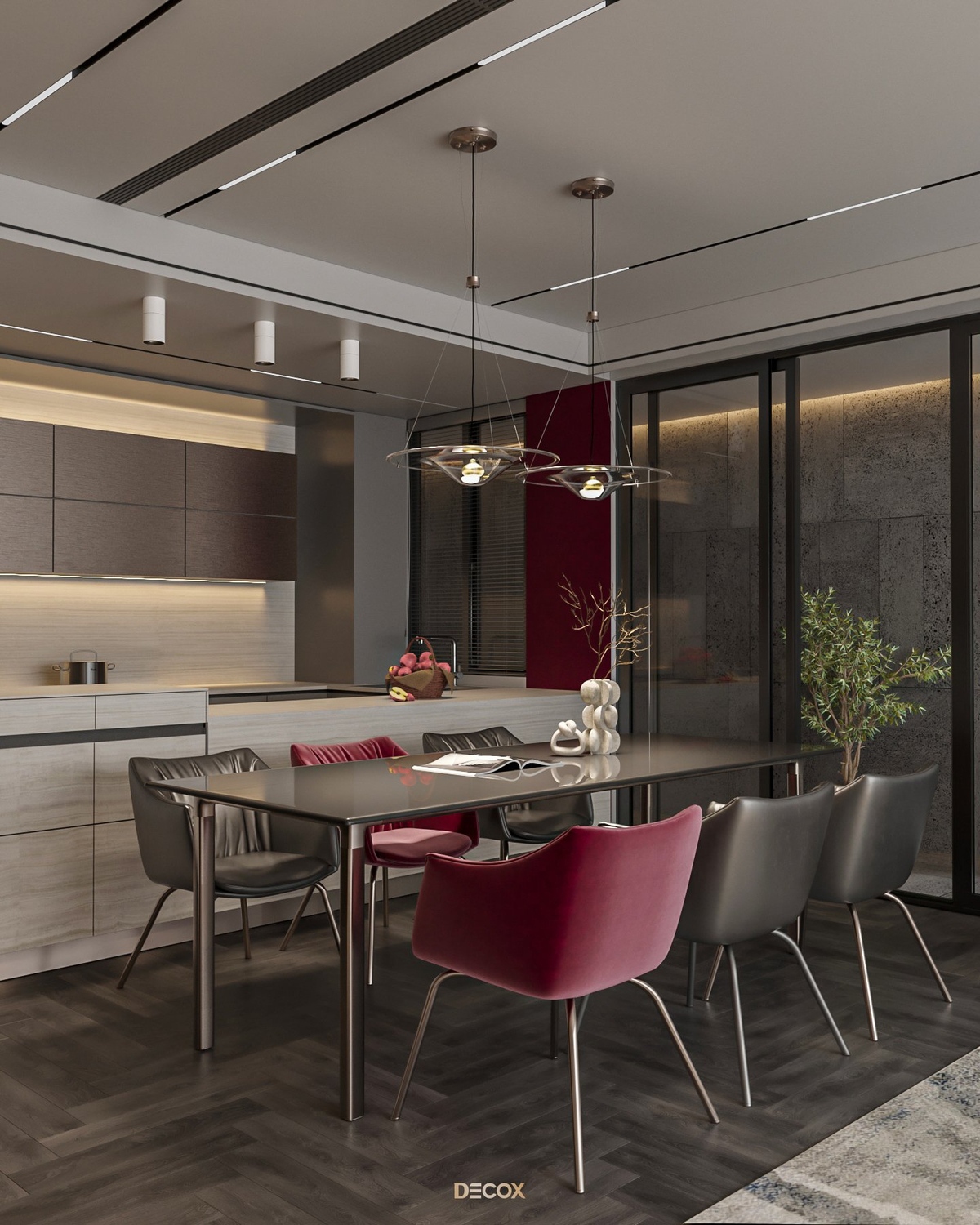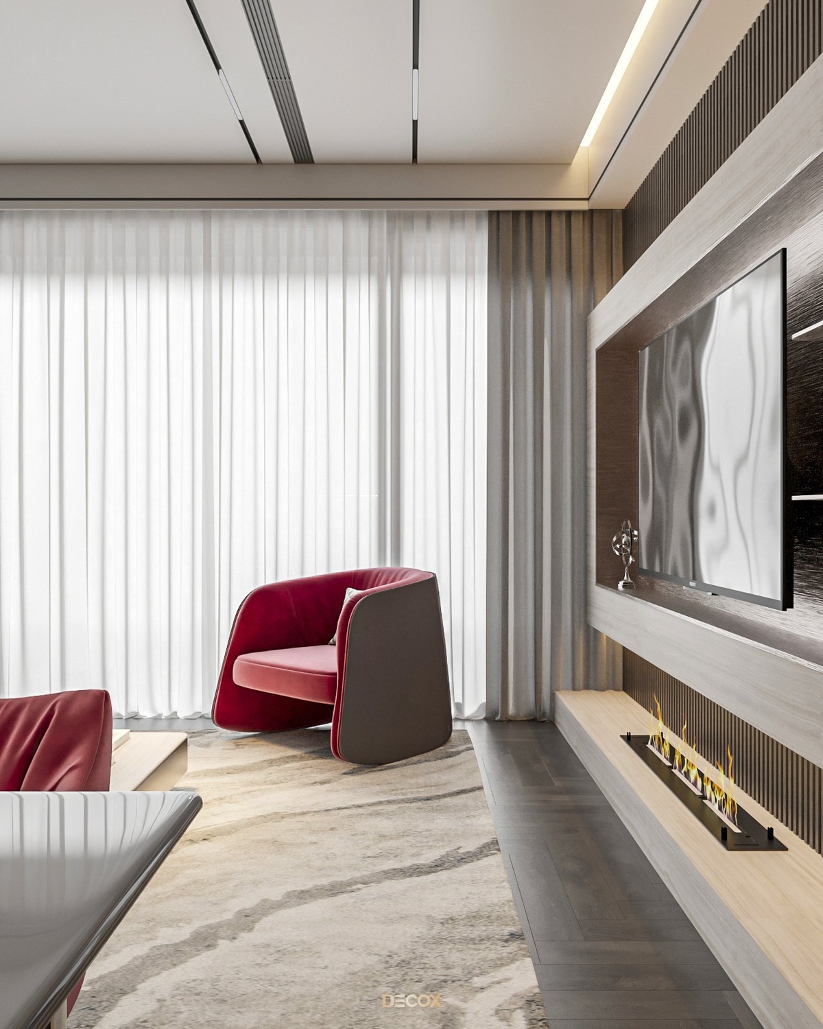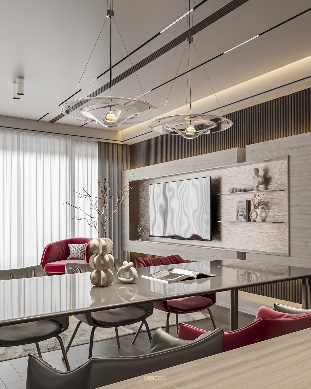 Sự kết hợp hài hòa giữa màu sắc và thiên nhiên đã mang đến sự hấp dẫn về mặt thị giác trong thiết kế nội thất căn hộ rộng 157m2 này. Điểm nhấn dự án là tone màu đỏ cá tính, sang trọng nổi bật trên nền trung tính và những đường nét tinh giản chủ đạo. Bên cạnh những đường thẳng tuyến tính đặc trưng trong phong cách hiện đại, KTS Decox cũng khéo léo bổ sung thêm những đường cong uyển chuyển để tạo nên dòng chảy mềm mại, tôn lên vẻ đẹp nội thất trong không gian.