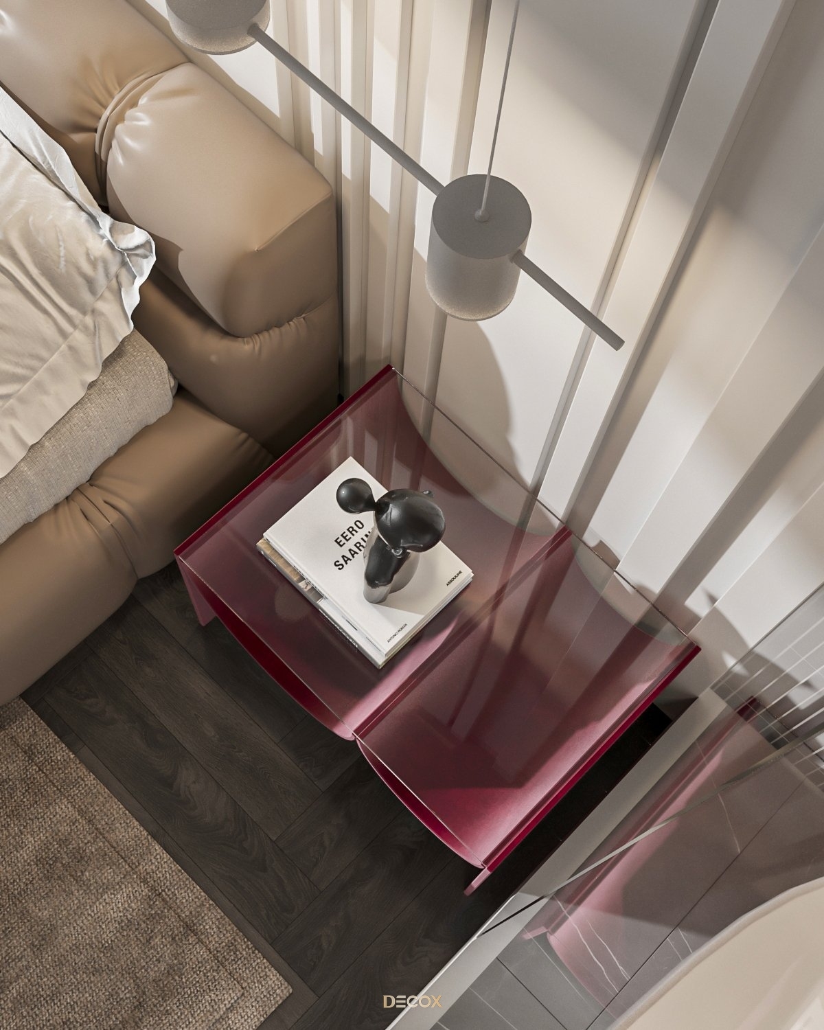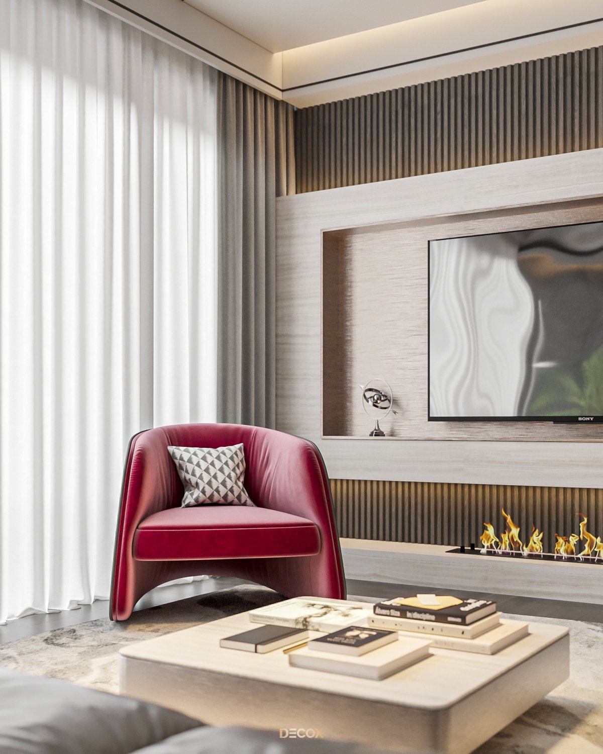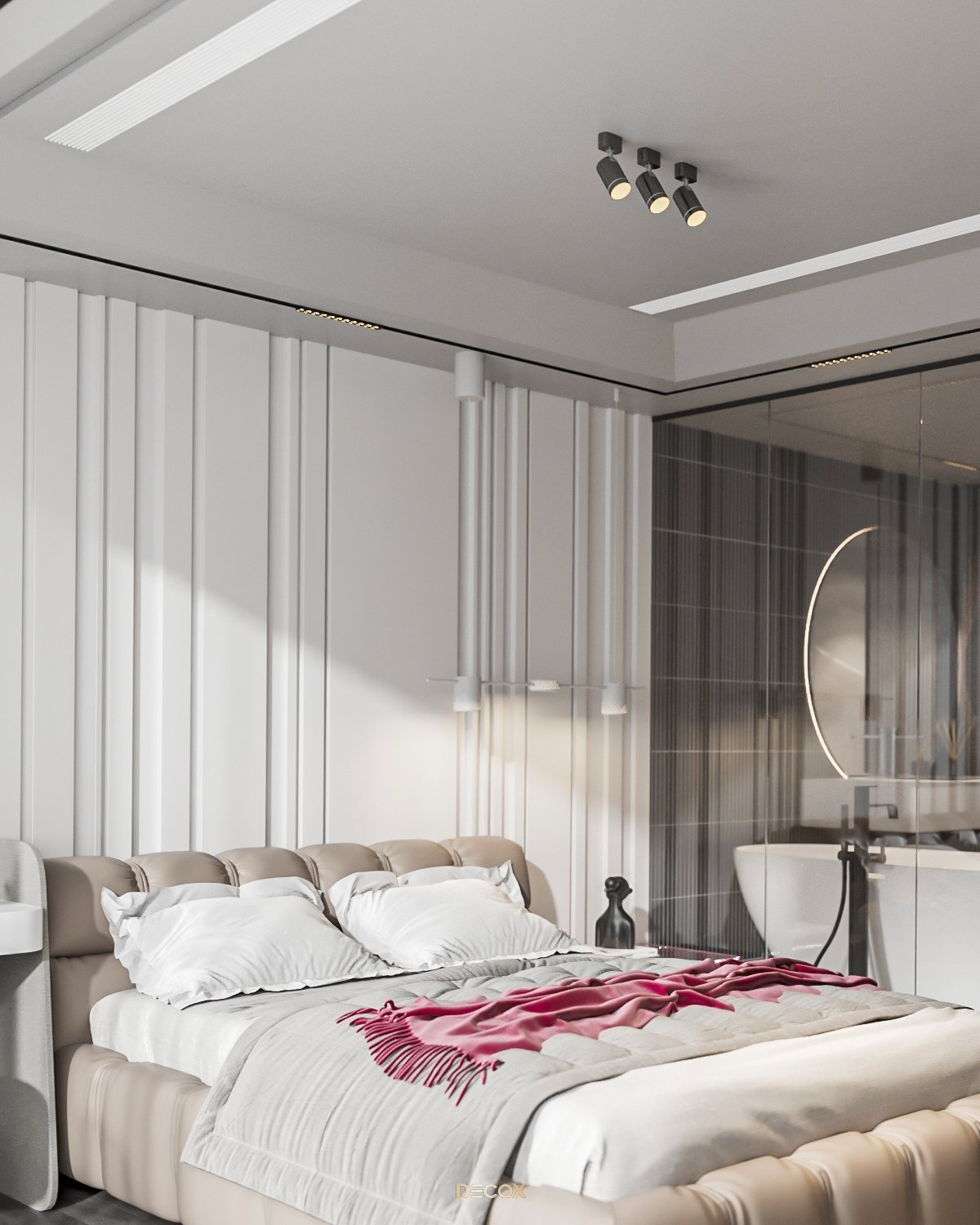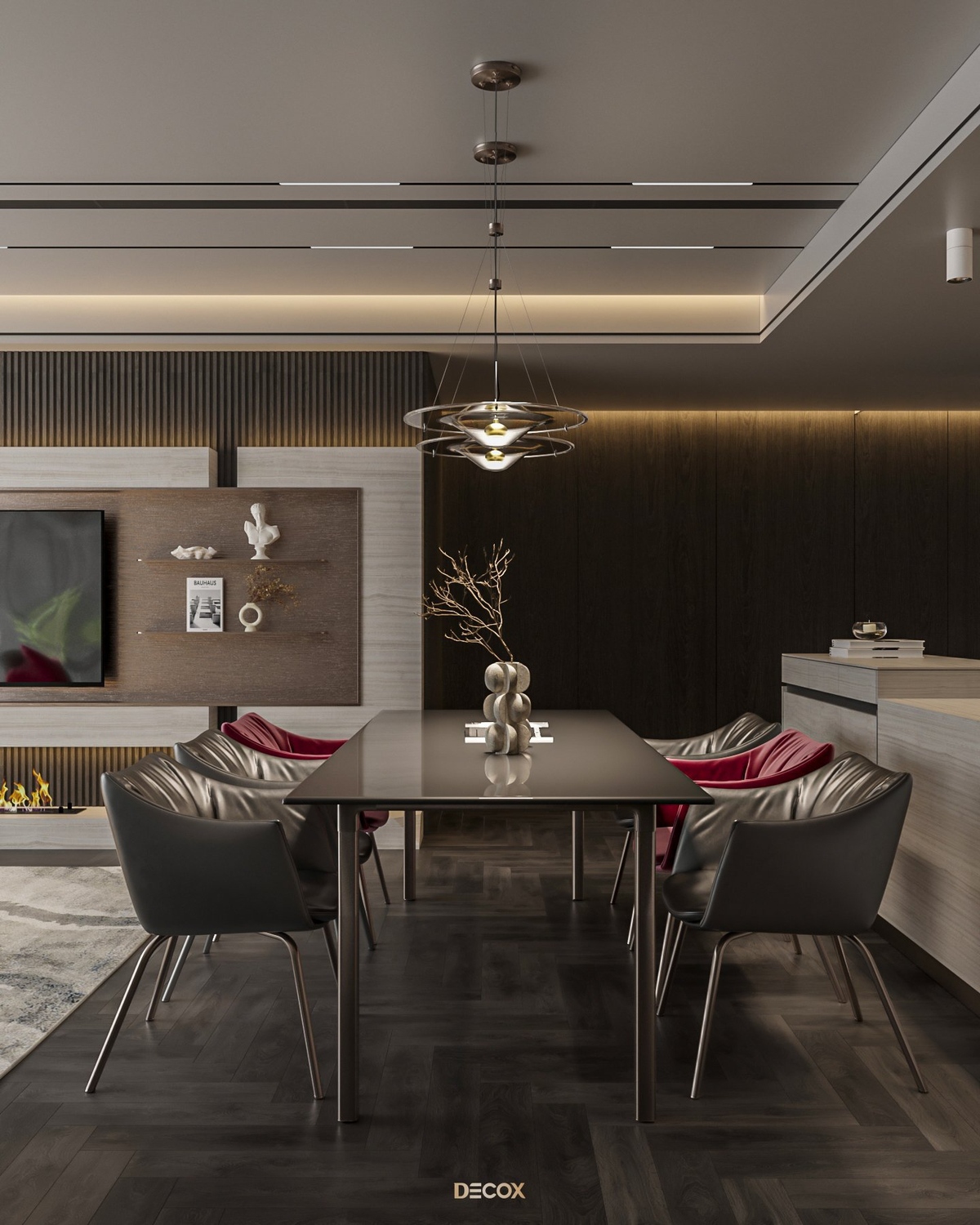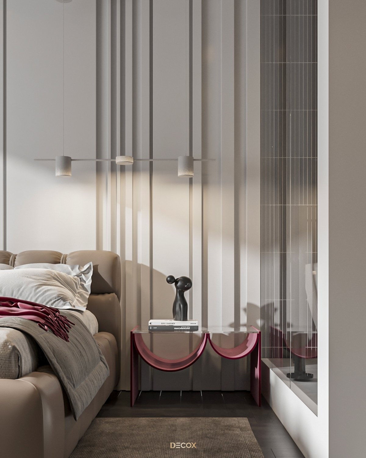 Sự kết hợp hài hòa giữa màu sắc và thiên nhiên đã mang đến sự hấp dẫn về mặt thị giác trong thiết kế nội thất căn hộ rộng 157m2 này. Điểm nhấn dự án là tone màu đỏ cá tính, sang trọng nổi bật trên nền trung tính và những đường nét tinh giản chủ đạo. Bên cạnh những đường thẳng tuyến tính đặc trưng trong phong cách hiện đại, KTS Decox cũng khéo léo bổ sung thêm những đường cong uyển chuyển để tạo nên dòng chảy mềm mại, tôn lên vẻ đẹp nội thất trong không gian.