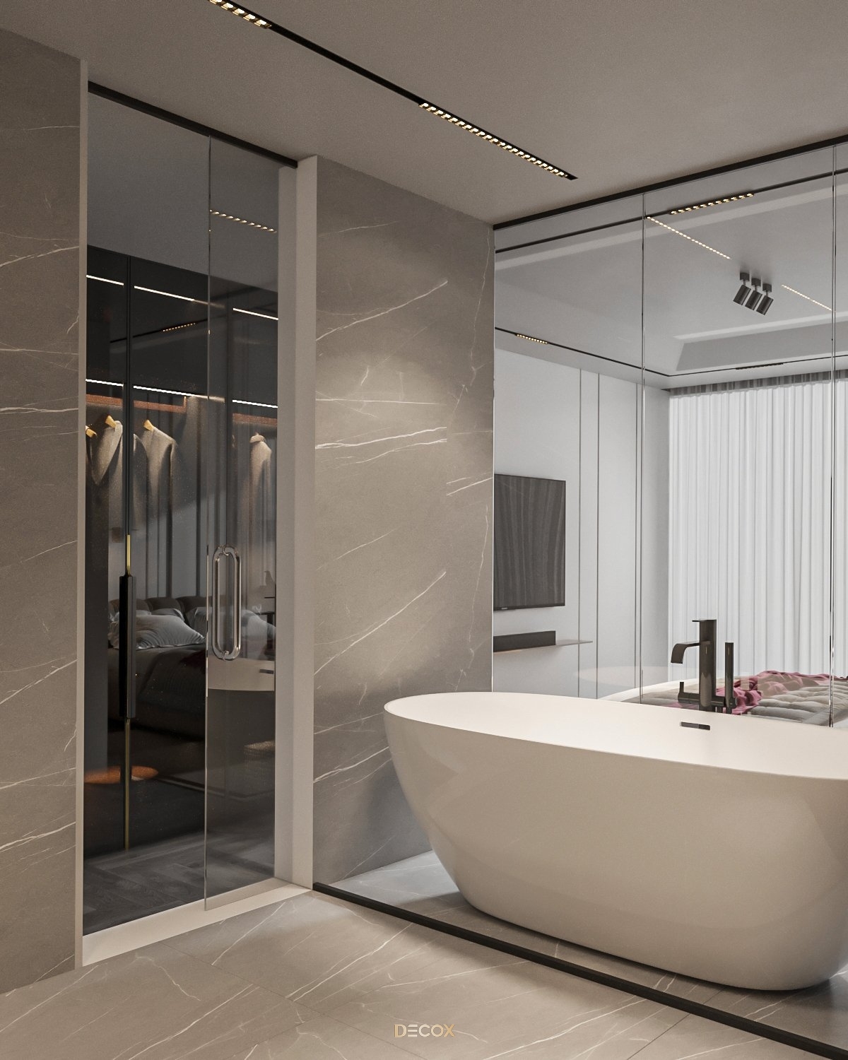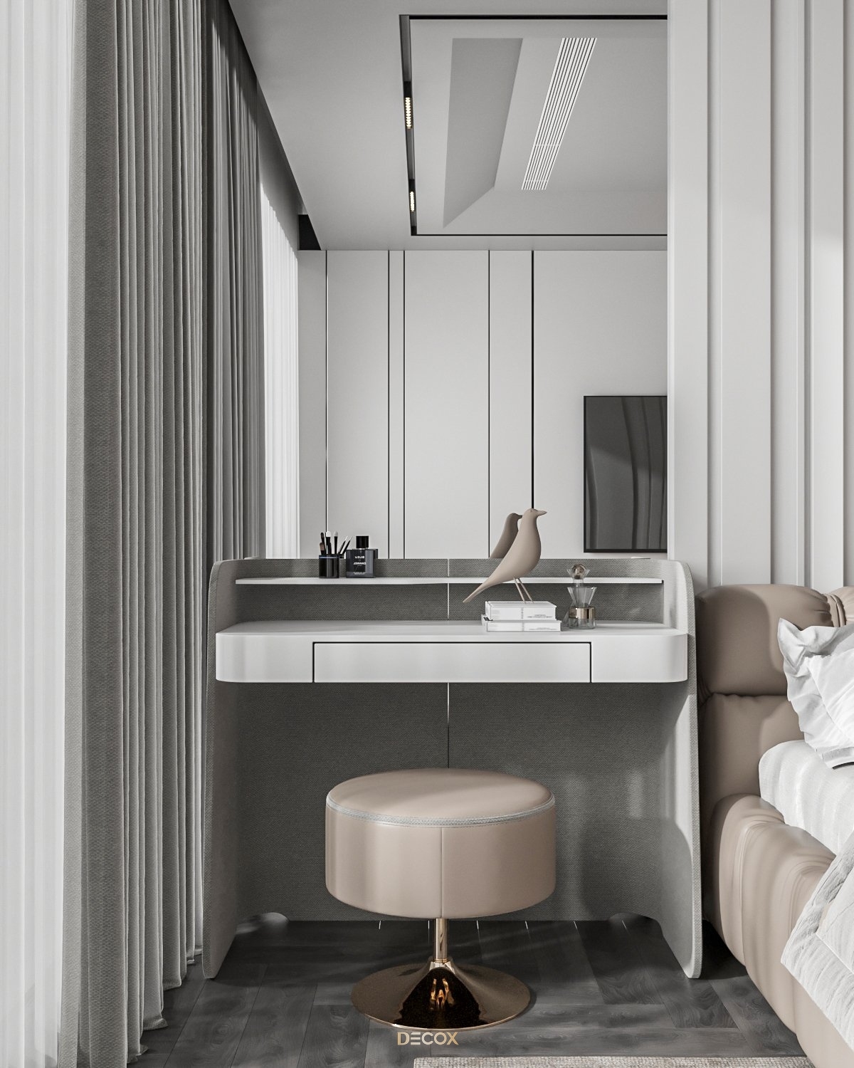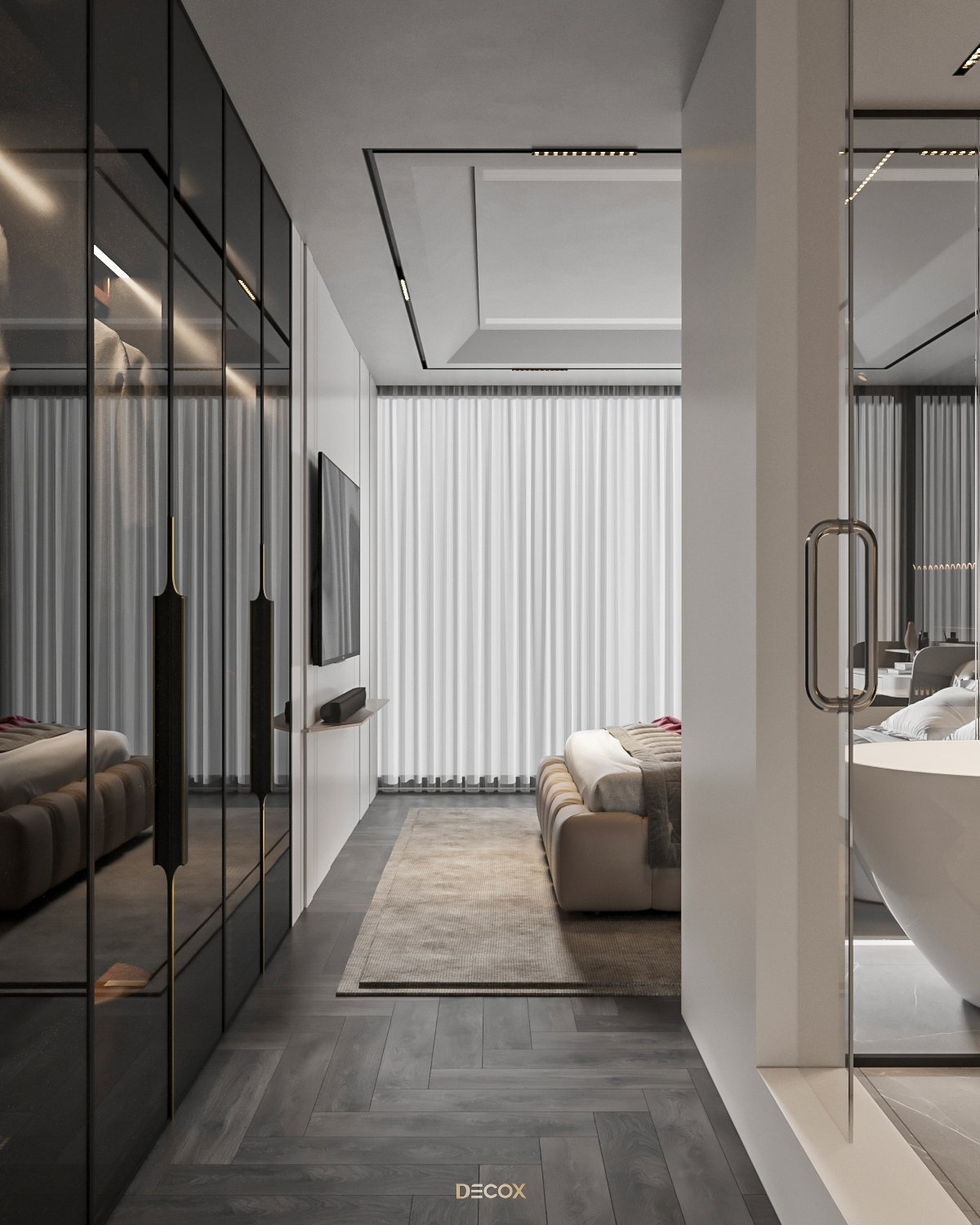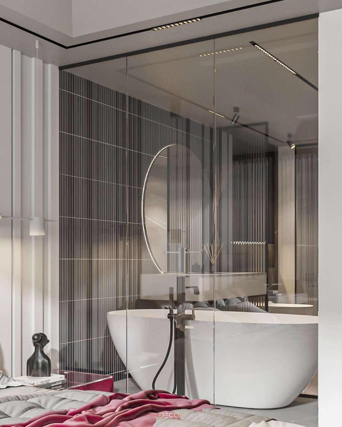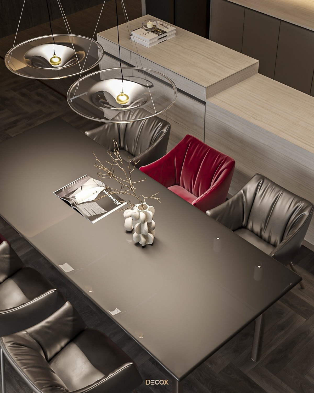 Sự kết hợp hài hòa giữa màu sắc và thiên nhiên đã mang đến sự hấp dẫn về mặt thị giác trong thiết kế nội thất căn hộ rộng 157m2 này. Điểm nhấn dự án là tone màu đỏ cá tính, sang trọng nổi bật trên nền trung tính và những đường nét tinh giản chủ đạo. Bên cạnh những đường thẳng tuyến tính đặc trưng trong phong cách hiện đại, KTS Decox cũng khéo léo bổ sung thêm những đường cong uyển chuyển để tạo nên dòng chảy mềm mại, tôn lên vẻ đẹp nội thất trong không gian.