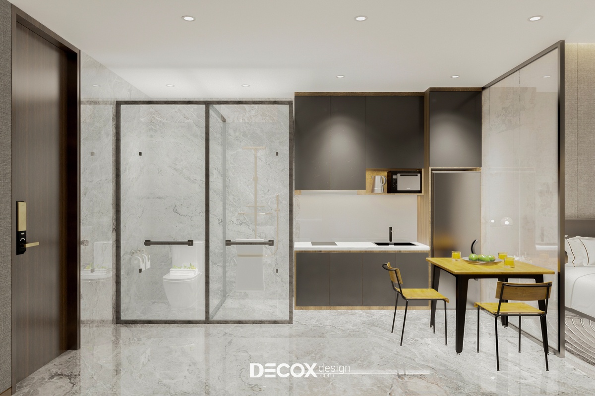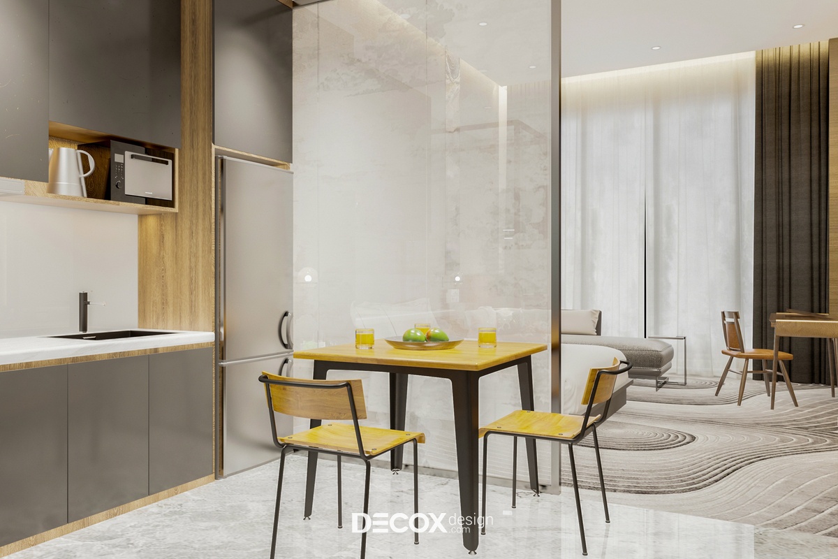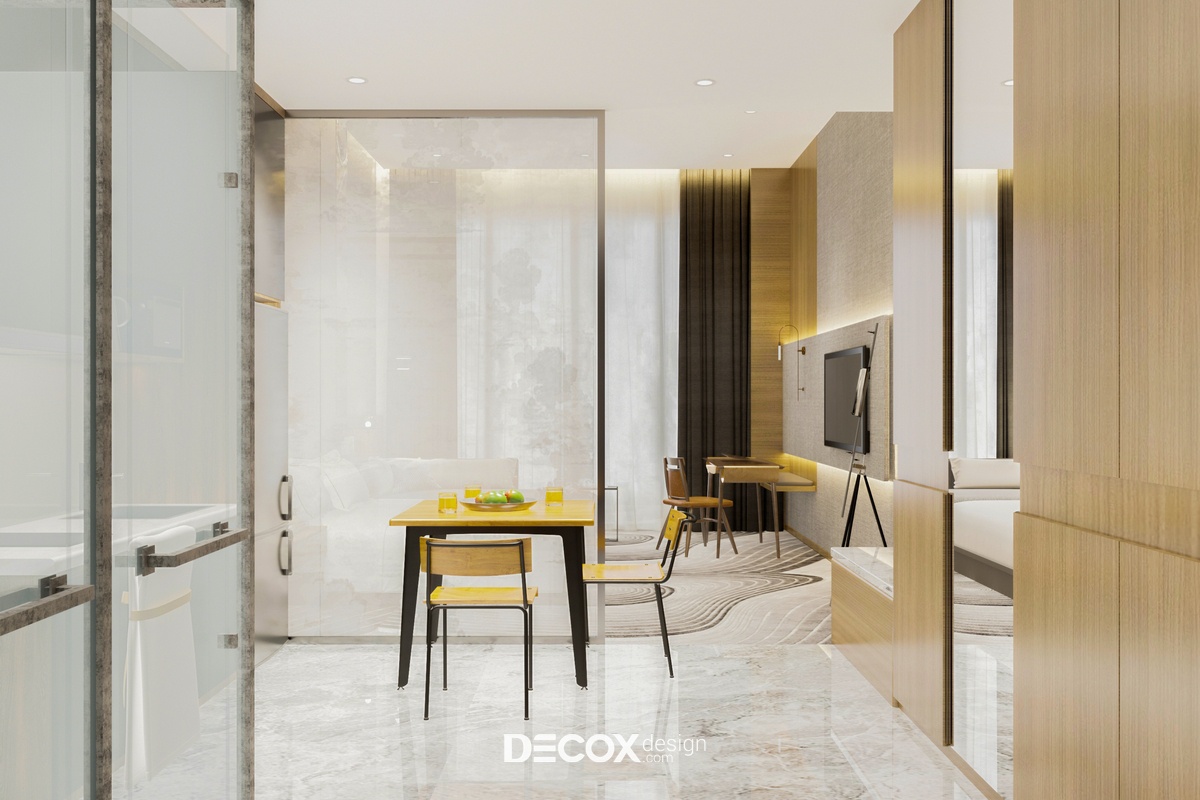 Thiết kế nội thất căn hộ dịch vụ sở hữu đầy đủ những chức năng cơ bản phục vụ cho sinh hoạt của khách hàng từ khu vực tiếp khách, nghỉ ngơi, phòng bếp - bàn ăn cho đến phòng vệ sinh. Để đảm bảo không gian sống rộng rãi và tiện ích KTS đã lựa chọn lối thiết kế mở cho không gian phòng khách và phòng ngủ, riêng khu vực phòng bếp và wc sẽ được phân tách riêng biệt thông qua hệ vách ngăn mỏng. Cách làm này vừa đảm bảo sự riêng tư cần thiết cho việc nghỉ ngơi vừa tránh khói bếp hay thức ăn bám mùi gây khó chịu và ảnh hưởng đến chất lượng giấc ngủ của khách hàng. Bên cạnh đó, nội thất sử dụng trong căn hộ này hầu hết đều được làm từ chất liệu gỗ, có kết cấu gọn, nhẹ, kiểu dáng đơn giản và có thể được dùng cho nhiều mục đích khác nhau, việc này sẽ hạn chế tối đa nội thất dư thừa gây chật chỗ.