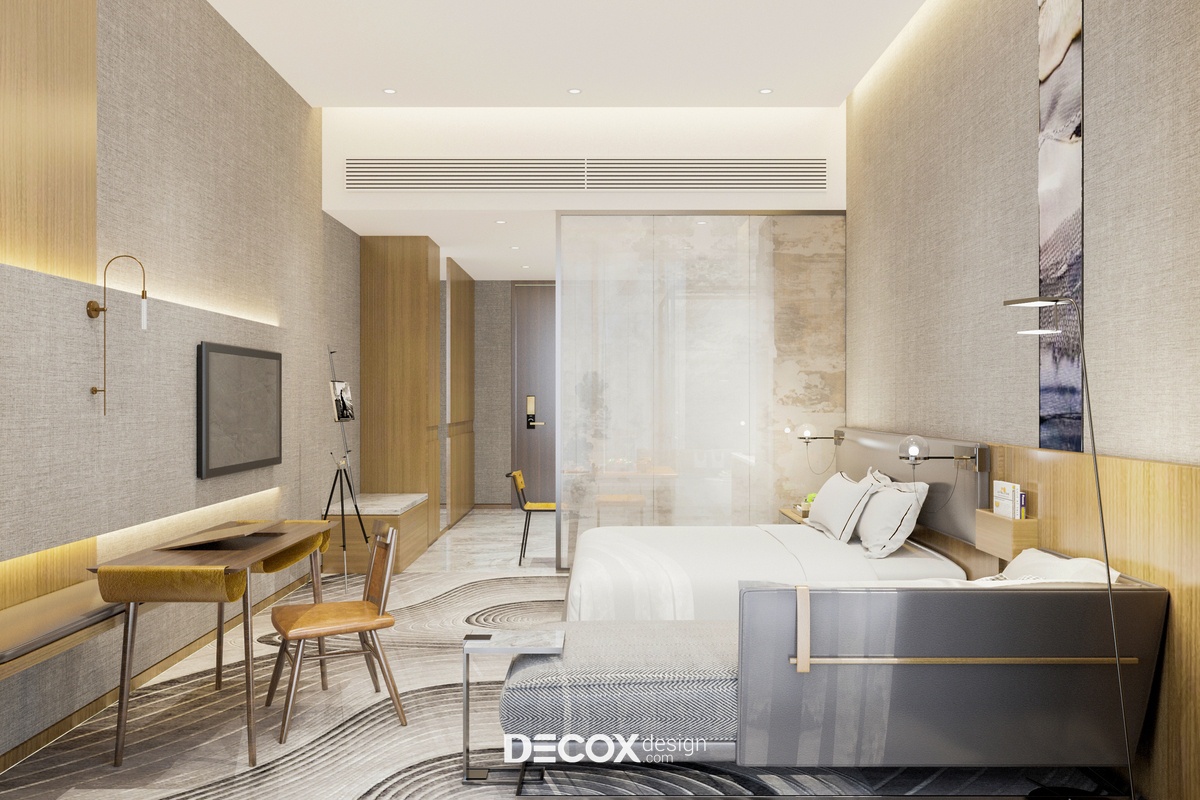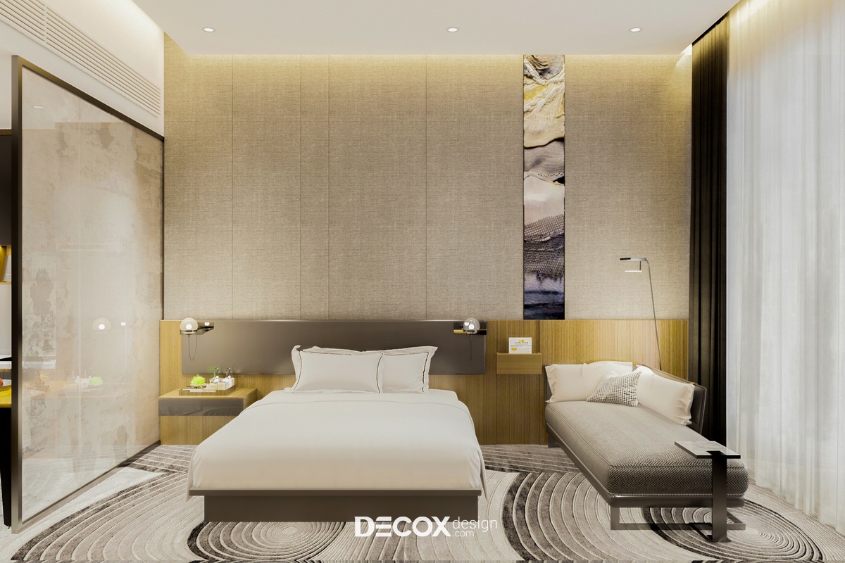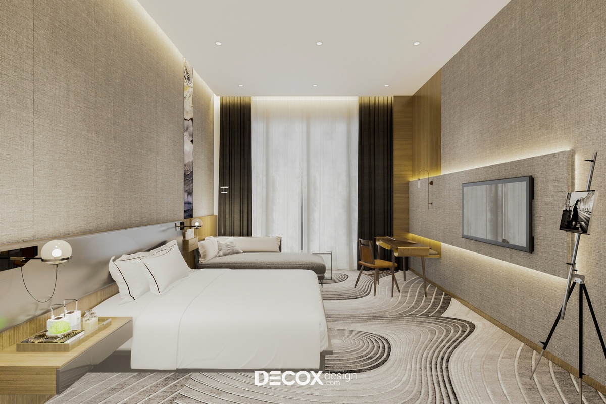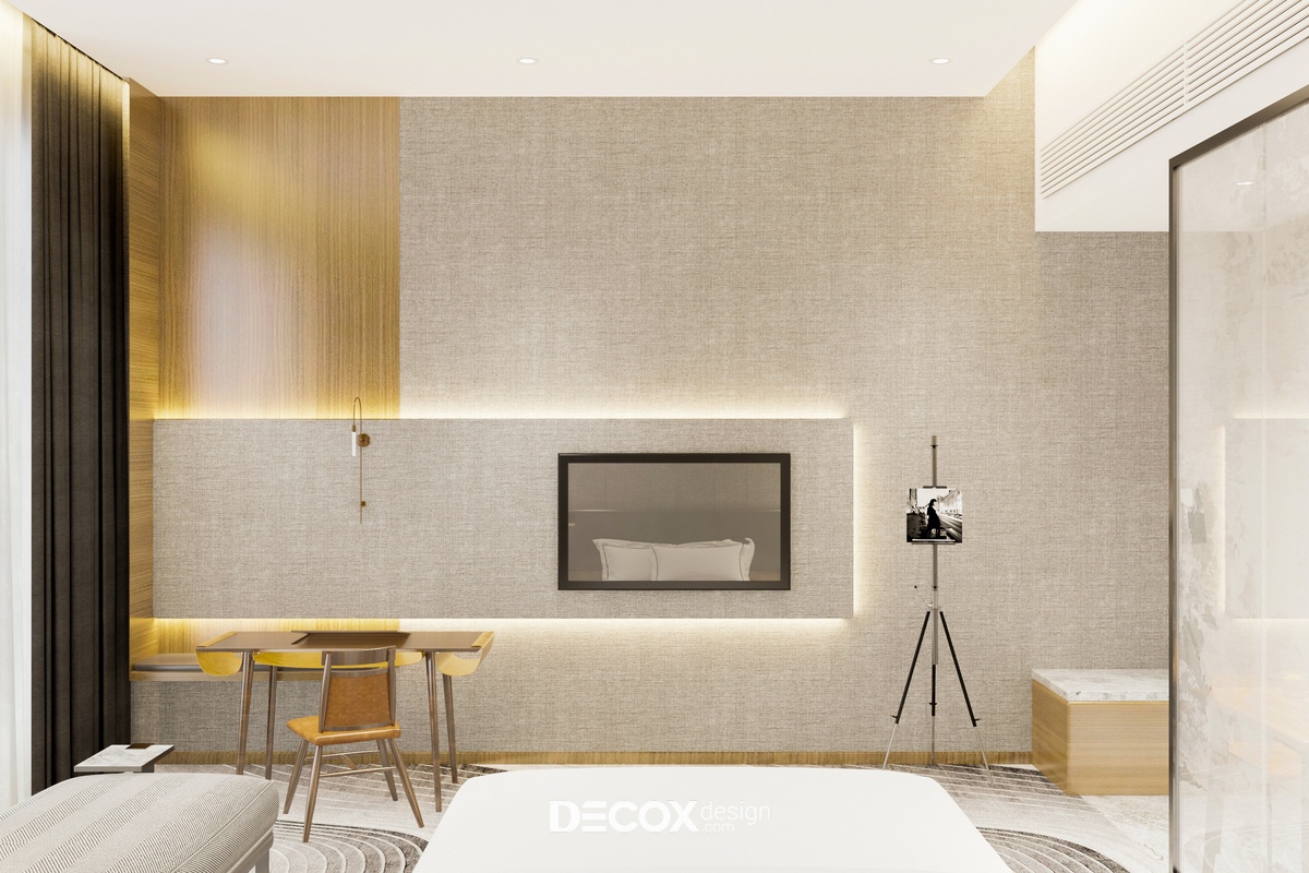 Khu vực phòng khách và phòng ngủ được tích hợp trong cùng một không gian theo lối thiết kế mở đầy tiện ích. Đến với không gian này bạn sẽ cảm nhận được sự hiện đại, tinh tế pha lẫn nét sang trong thông qua các chi tiết trong phòng từ giấy dán tường cao cấp với tone màu trung tính thanh lịch, chất liệu gỗ ốp tường kết hợp đèn led hắt tường nhấn điểm những khu vực quan trọng như tivi, bàn làm việc và sofa. Ngoài ra, thiết kế nội thất phòng còn gây ấn tượng mạnh nhờ hệ thảm trải sàn hiệu ứng 3D có tác dụng kích thích thị giác mạnh, những đường nét họa tiết mềm mại trên thảm cũng góp phần giúp không gian thêm quyến rũ.