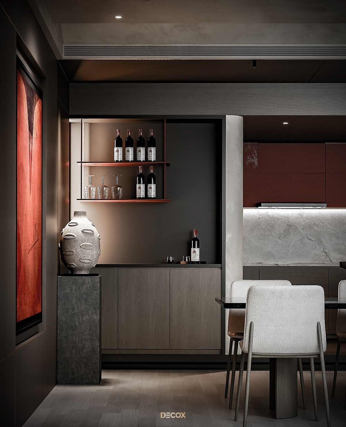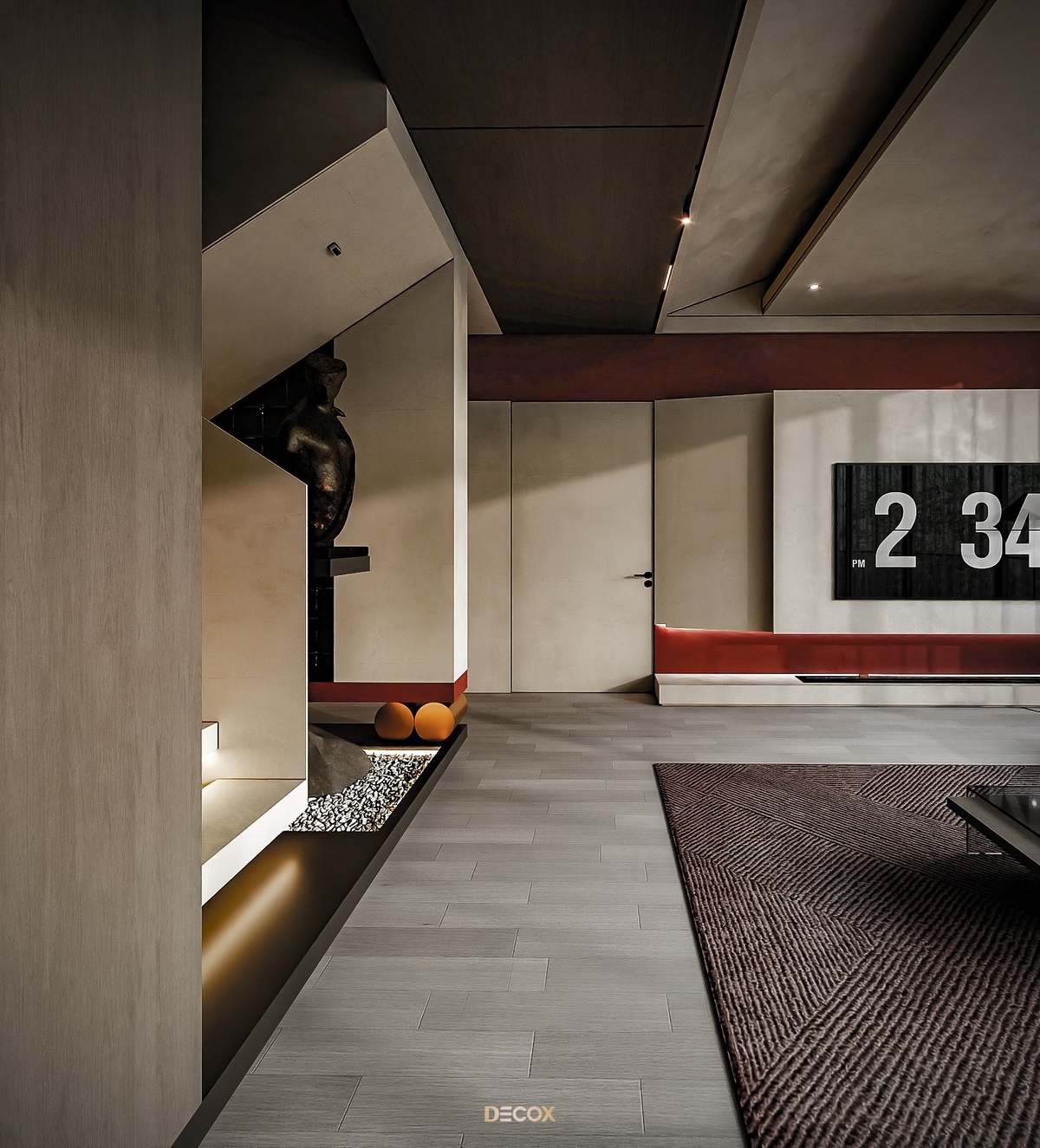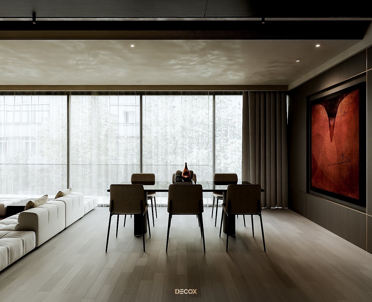 Bằng việc kết hợp nghệ thuật vào không gian sống, KTS Decox đã tạo ra một dòng chảy với nhiều cung bậc cảm xúc tại The F Red, một căn Loft nằm tại tầng 23 thuộc dự án The Opera. Thiết kế nội thất là sự phối hợp nhịp nhàng giữa sự ấm áp của gỗ tự nhiên, sự mềm mại của chất liệu vải và sự cứng cáp của bê tông, đá marble sang trọng. Sự cân bằng trong căn hộ còn nằm ở việc phối màu, trong đó, nổi bật nhất vẫn là cặp màu tương phản đỏ và đen đóng vai trò tạo điểm nhấn, thể hiện cá tính, phong cách sống độc đáo của chủ sở hữu.