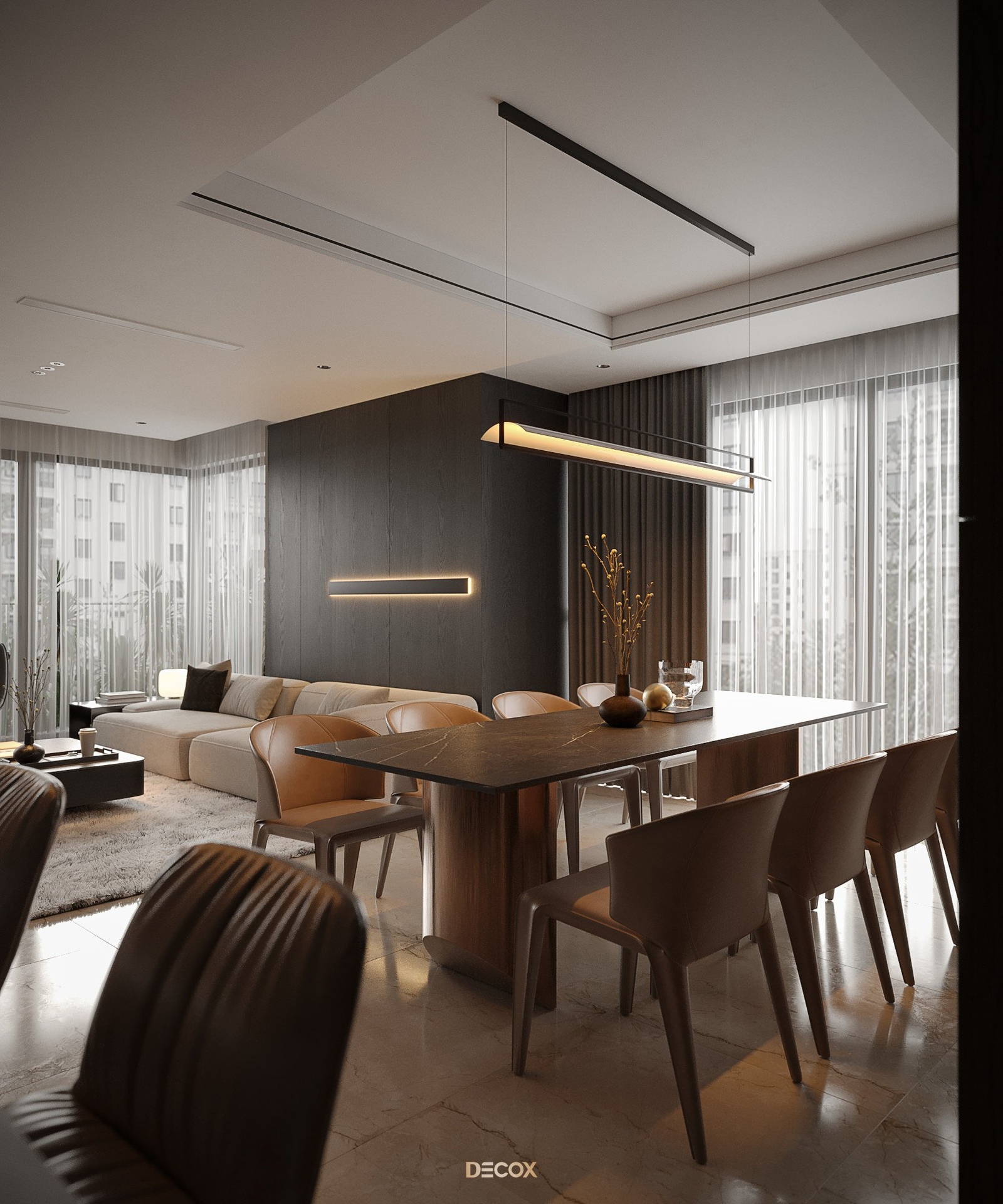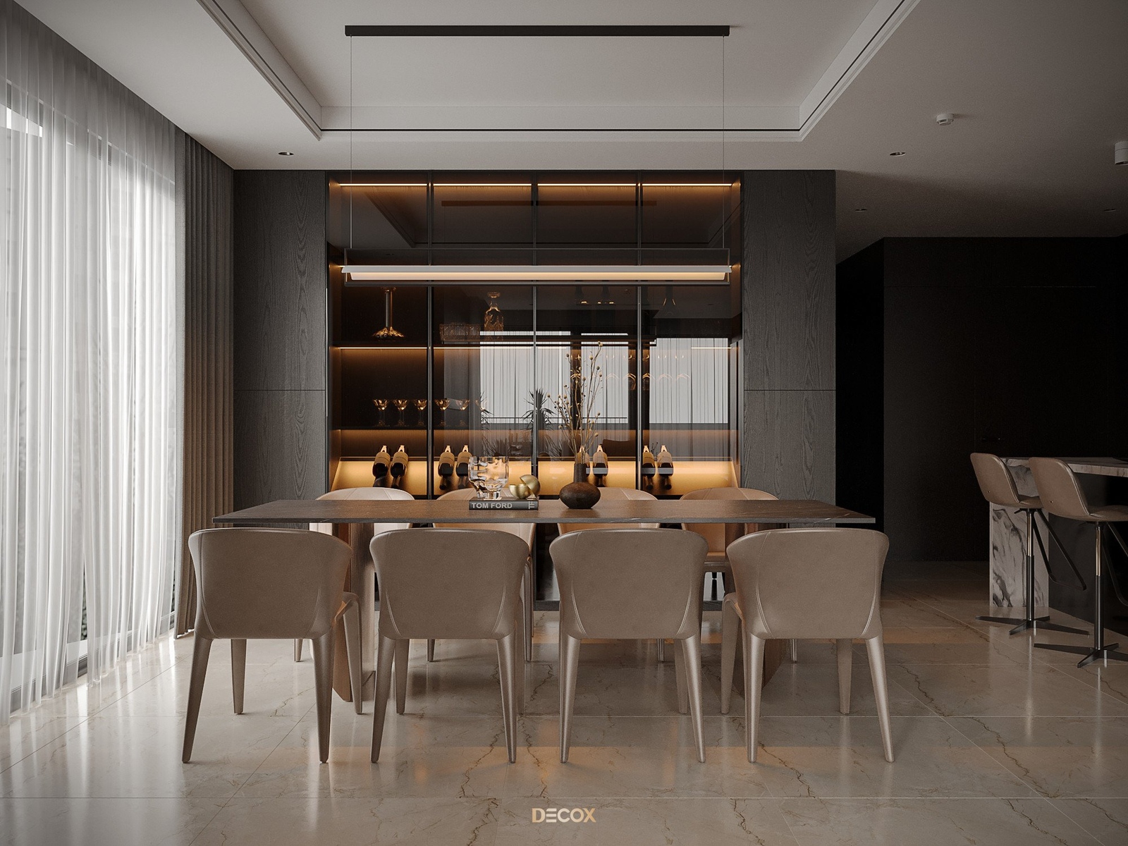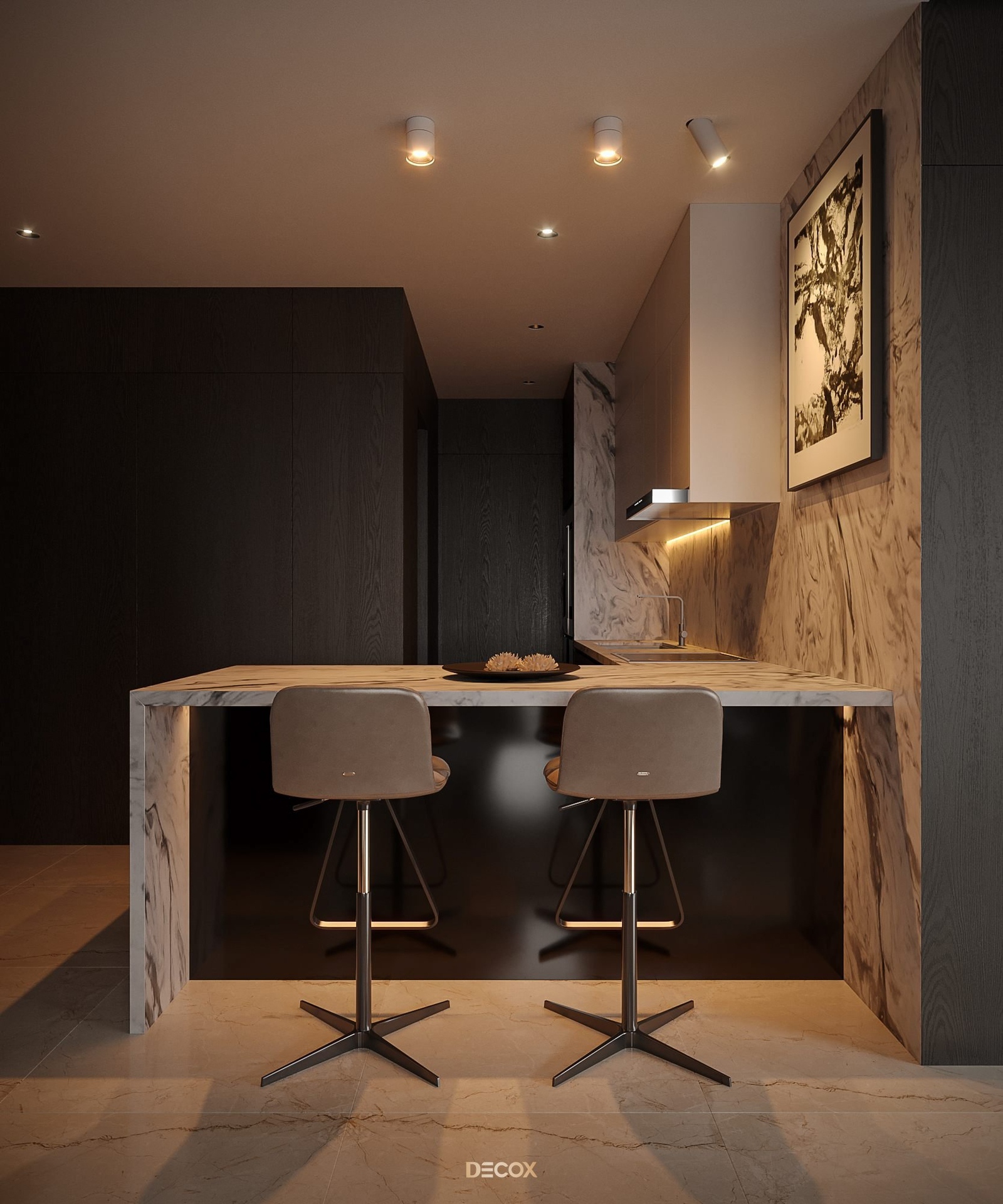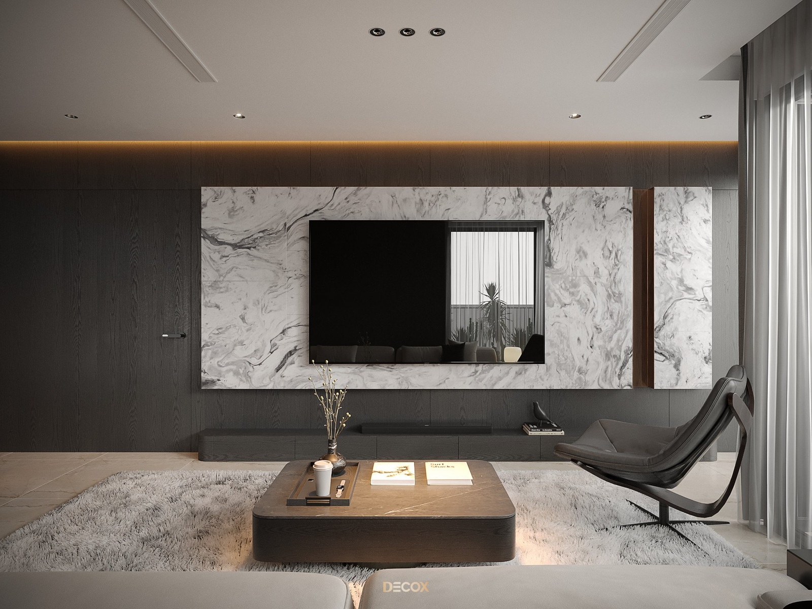 Bằng cách kết hợp vật liệu gỗ tối màu và những mảng tường, đá marble sáng màu, KTS Decox đã đem nghệ thuật tương phản vào thiết kế nội thất căn hộ cao cấp The Opera. Sự đối lập giữa sáng và tối, ấm và lạnh không chỉ tạo hiệu ứng mạnh mẽ về mặt thị giác mà còn đảm bảo sự cân bằng và sang trọng cho không gian.