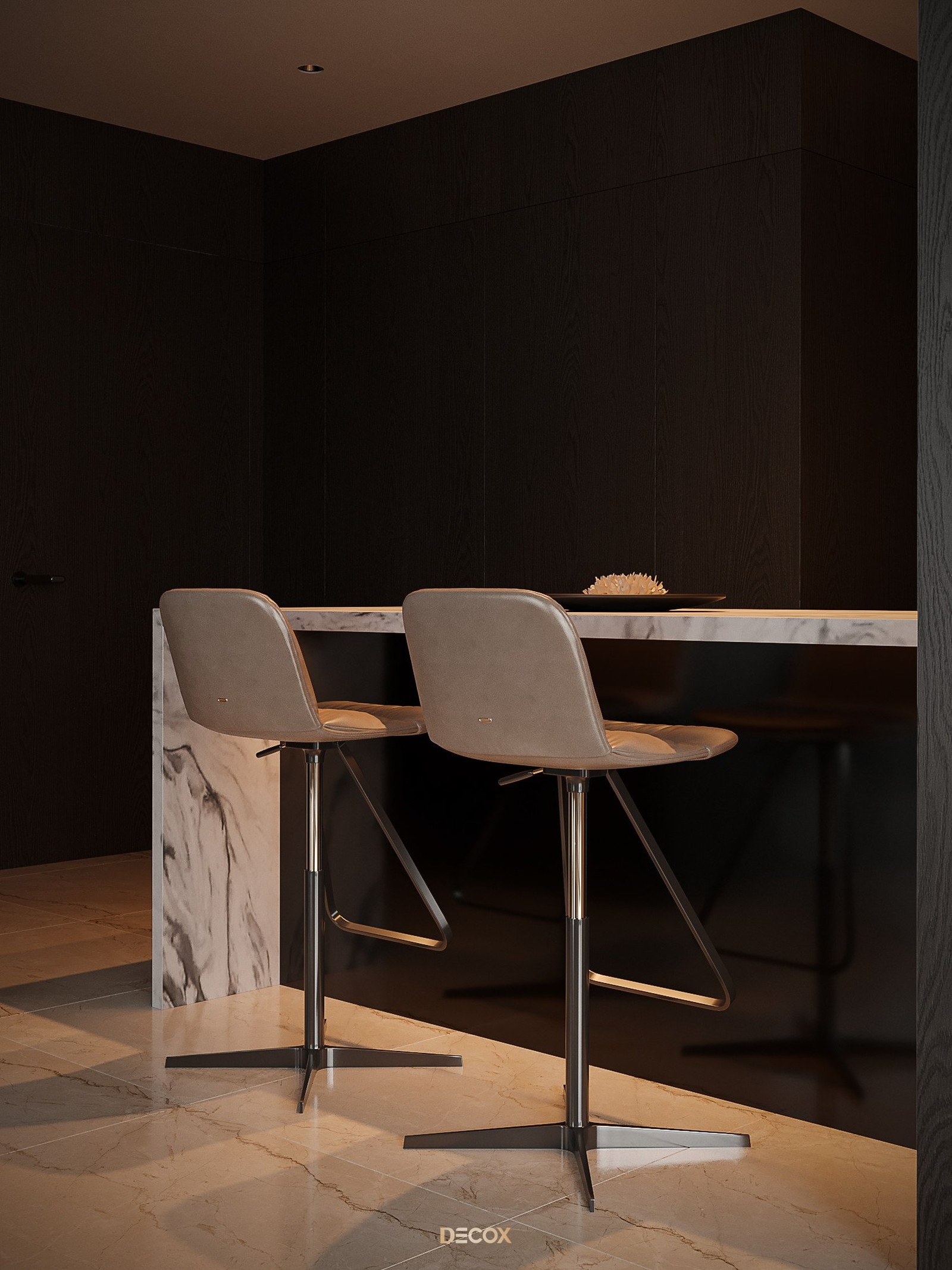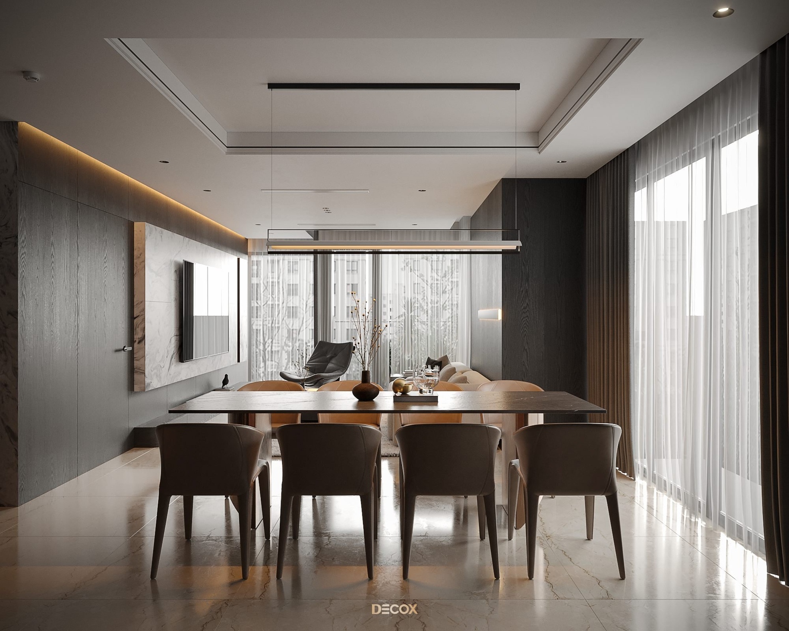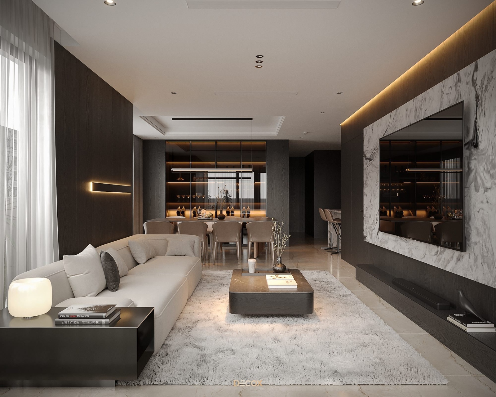 Bằng cách kết hợp vật liệu gỗ tối màu và những mảng tường, đá marble sáng màu, KTS Decox đã đem nghệ thuật tương phản vào thiết kế nội thất căn hộ cao cấp The Opera. Sự đối lập giữa sáng và tối, ấm và lạnh không chỉ tạo hiệu ứng mạnh mẽ về mặt thị giác mà còn đảm bảo sự cân bằng và sang trọng cho không gian.