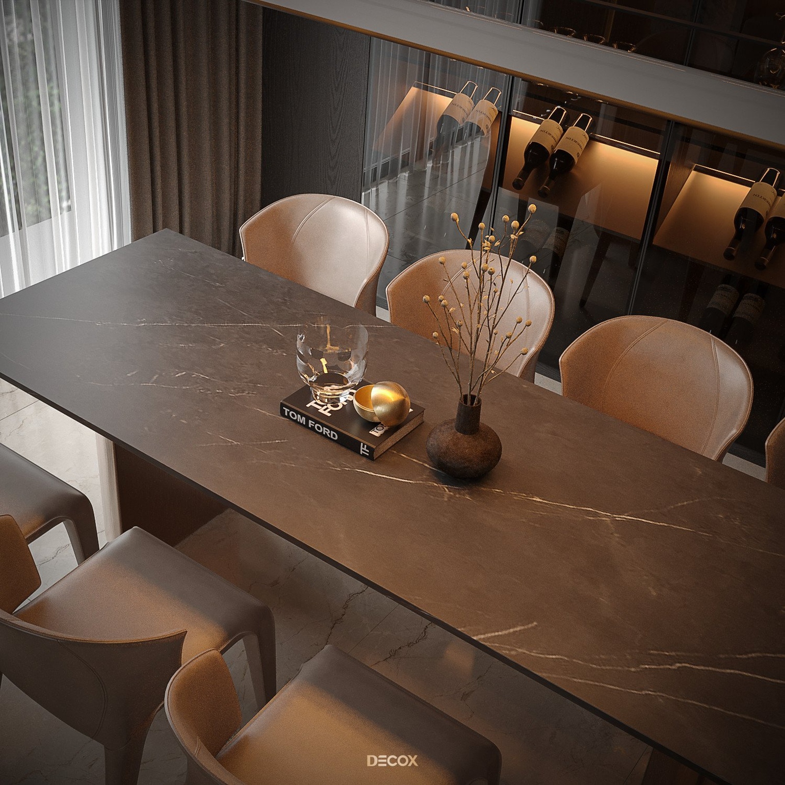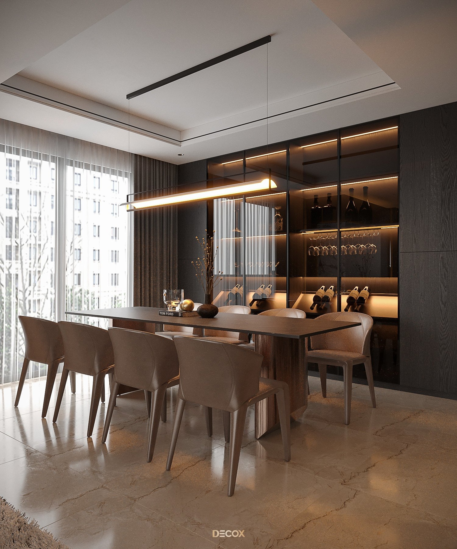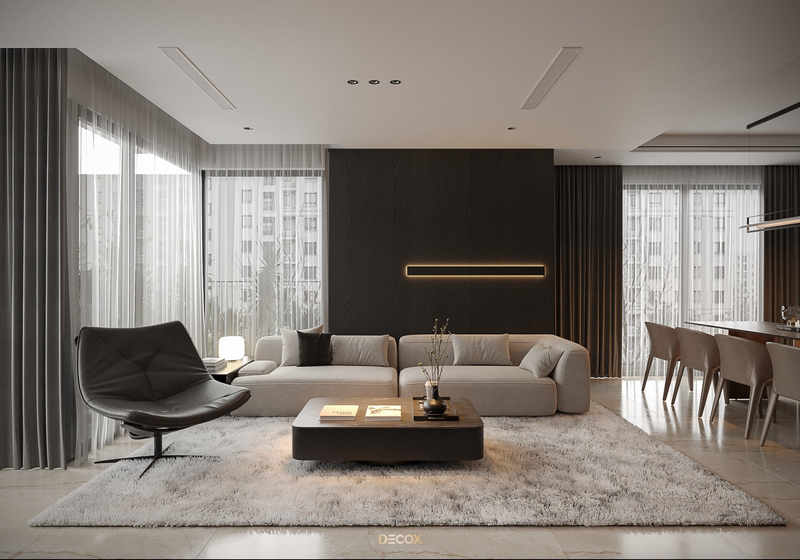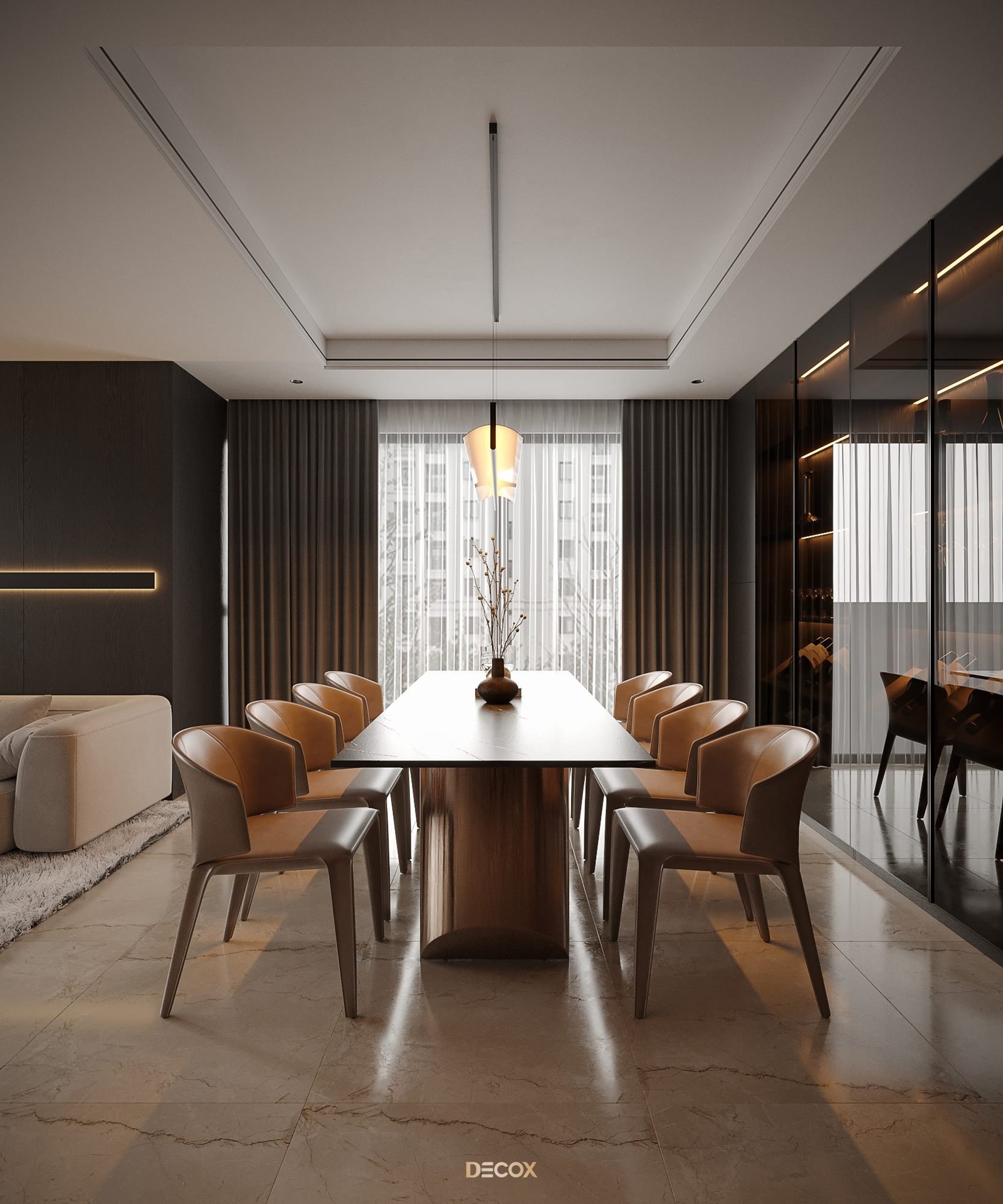 Bằng cách kết hợp vật liệu gỗ tối màu và những mảng tường, đá marble sáng màu, KTS Decox đã đem nghệ thuật tương phản vào thiết kế nội thất căn hộ cao cấp The Opera. Sự đối lập giữa sáng và tối, ấm và lạnh không chỉ tạo hiệu ứng mạnh mẽ về mặt thị giác mà còn đảm bảo sự cân bằng và sang trọng cho không gian.