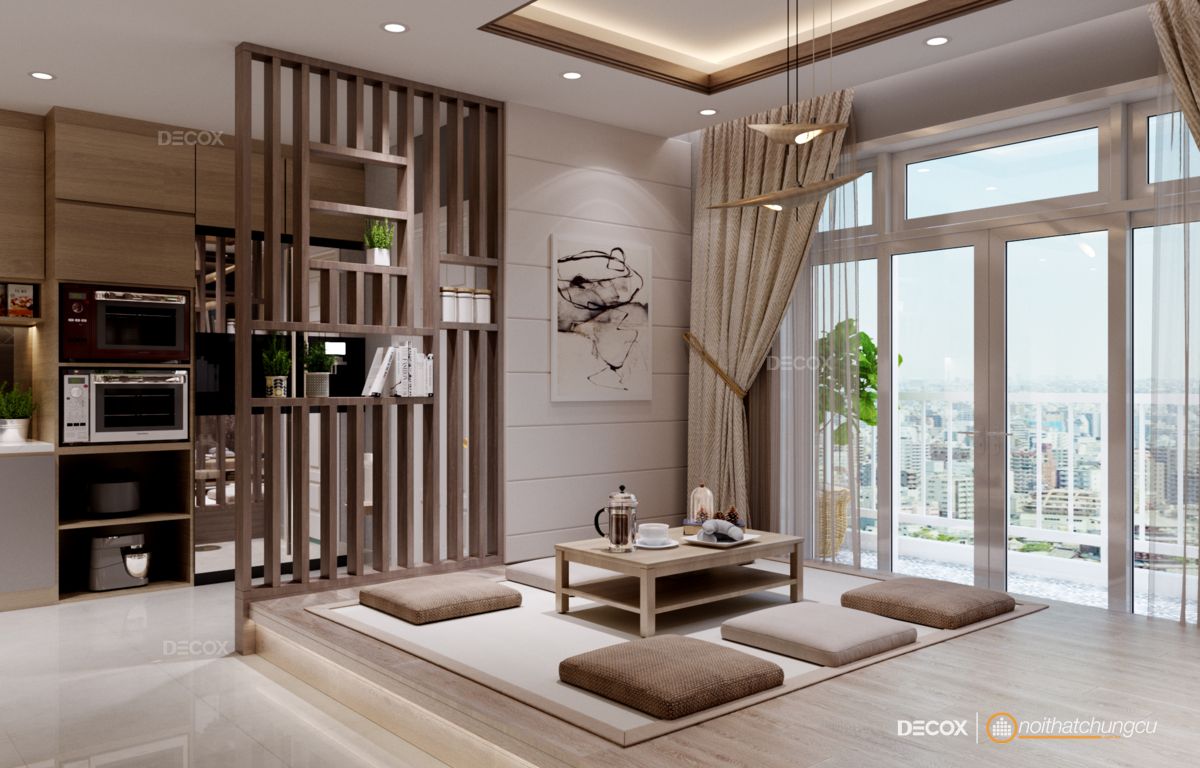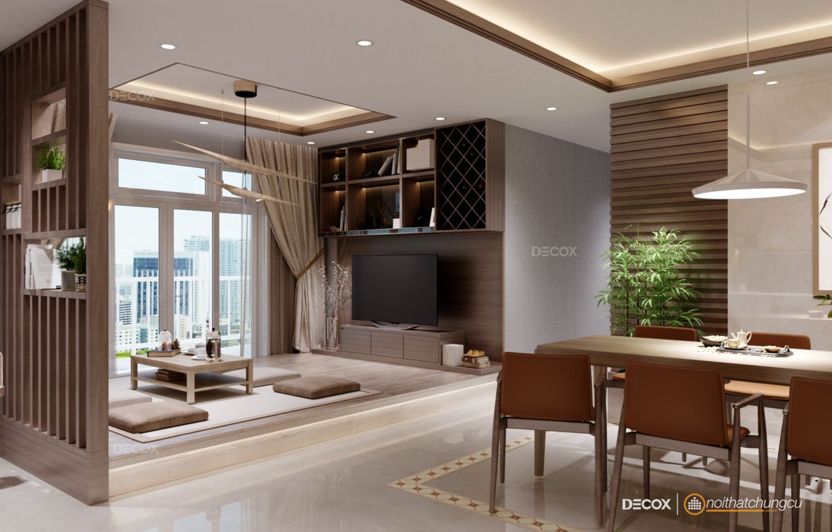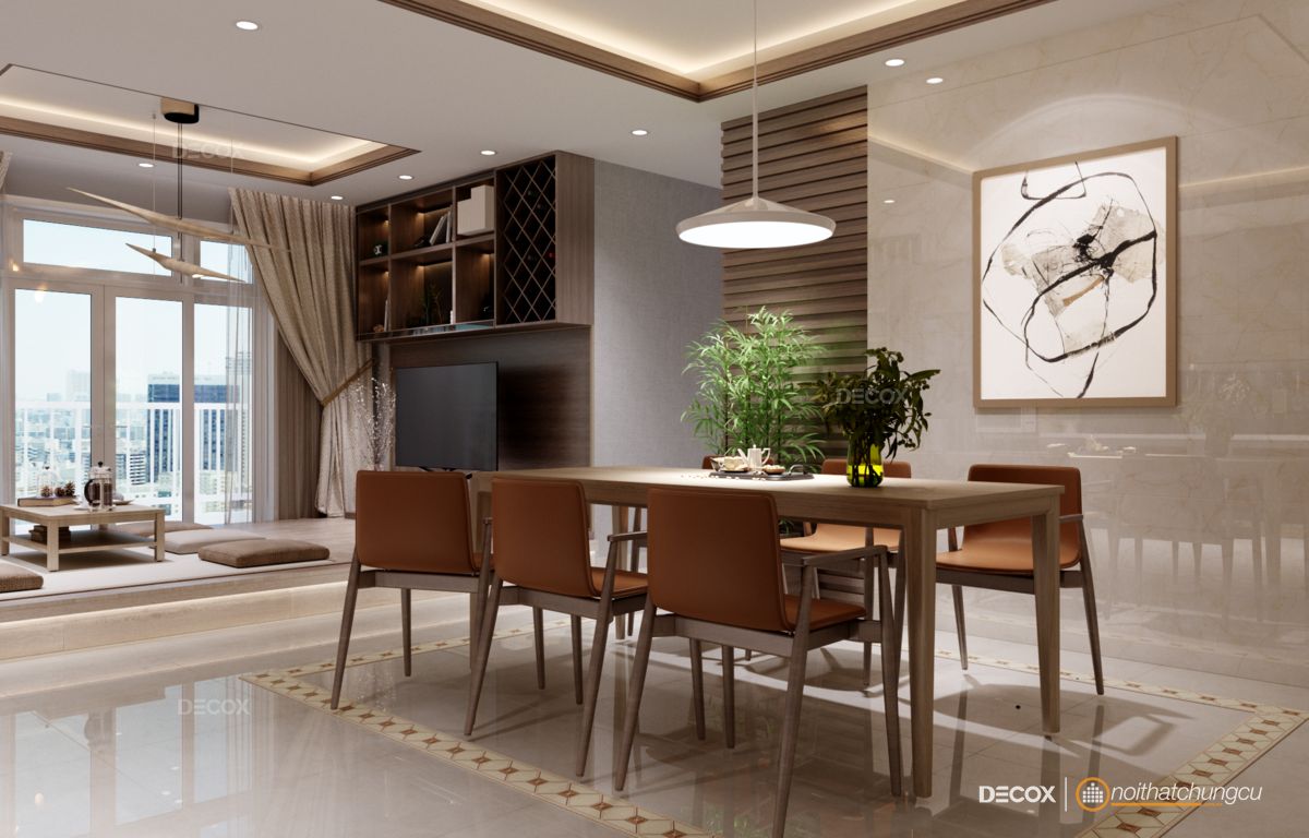 Điểm nhấn thú vị trong cách thiết kế nội thất chung cư Gold View 117m2 có lẽ nằm ở chiếc đèn trần hình ống tre lạ mắt, biến không gian phòng khách trở nên ấm áp lạ thường. Sở dĩ có nhiều đồ gỗ như vậy là do kiến trúc Nhật Bản là sự giao hòa giữa môi trường thiên nhiên với con người. Góc phòng cũng có một lọ cây cảnh để thể hiện sự hòa hợp, tôn trọng tự nhiên, đồng hành với thiên nhiên trong cuộc sống con người.