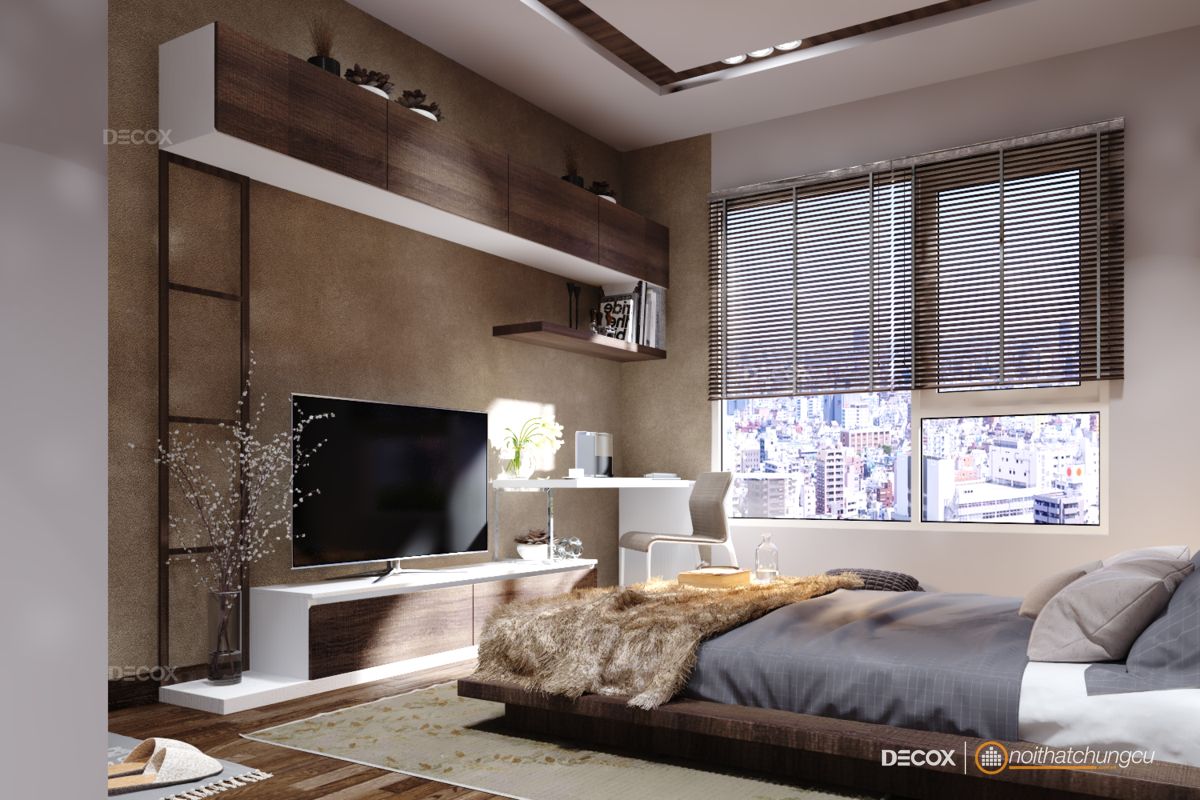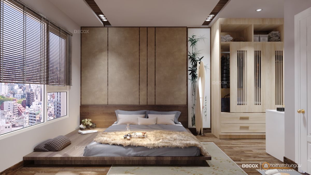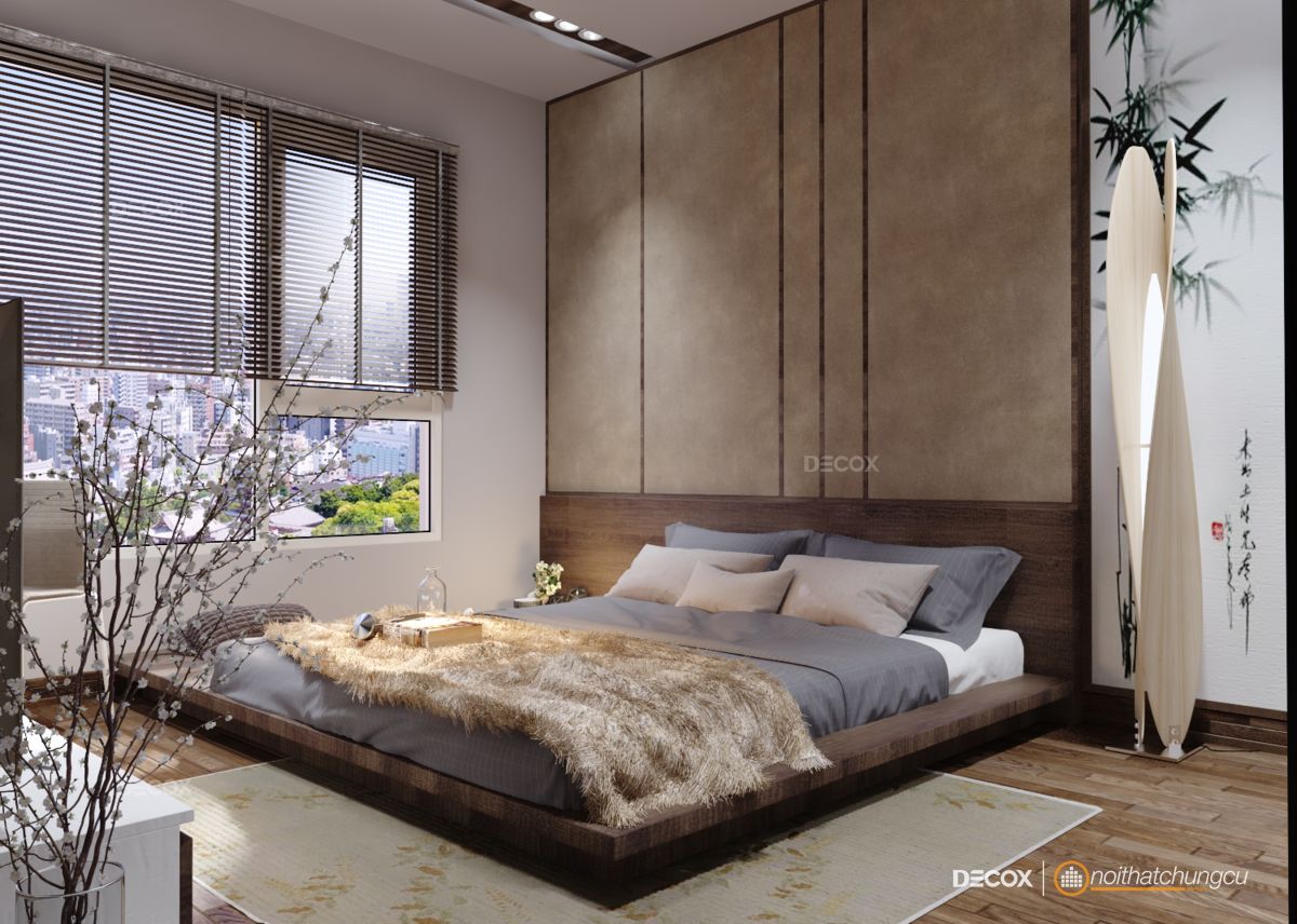 Thiết kế nội thất phòng ngủ sử dụng gam màu sáng cùng những mẫu nội thất gọn nhẹ và các mẫu trang trí tượng trưng, khi nhìn vào sẽ liên tưởng ngay đến đất nước Nhật Bản.