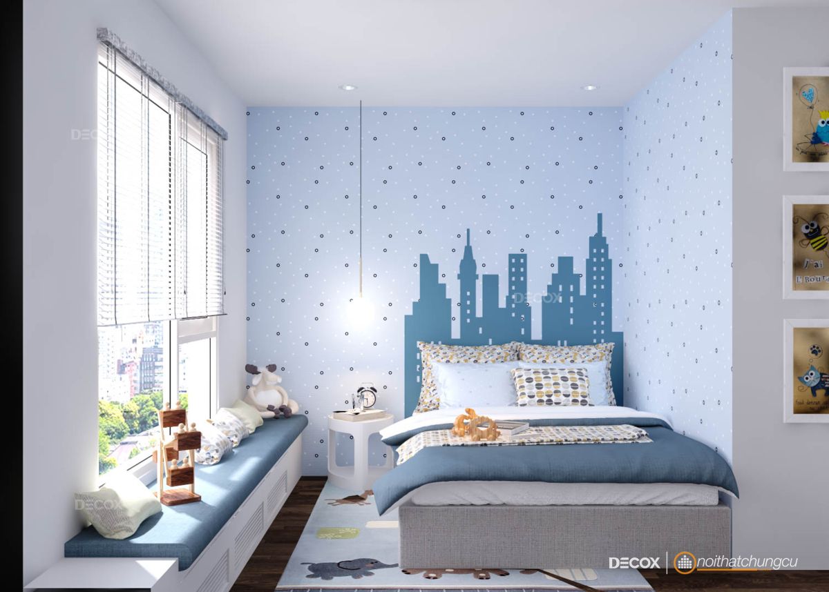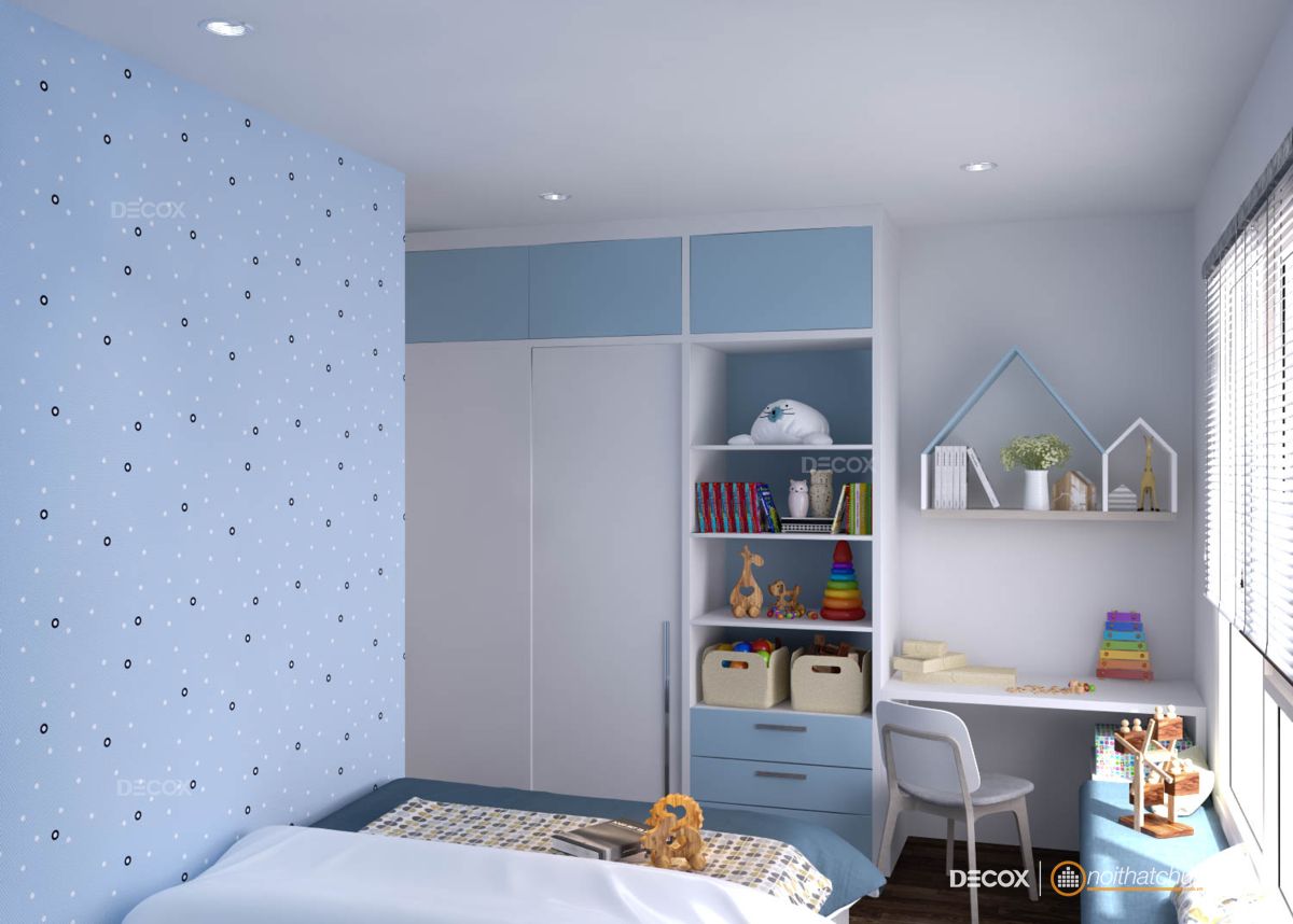 Phòng ngủ cho bé sử dụng tông màu xanh dương tươi sáng. Màu xanh dương mang đến một cảm giác yên bình mát dịu, rất tốt cho sự phát triển tư duy cũng như khả năng sáng tạo ở trẻ.