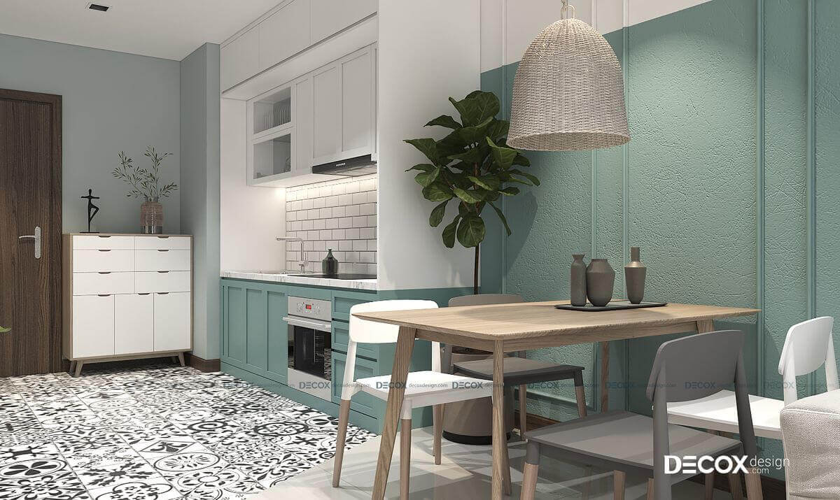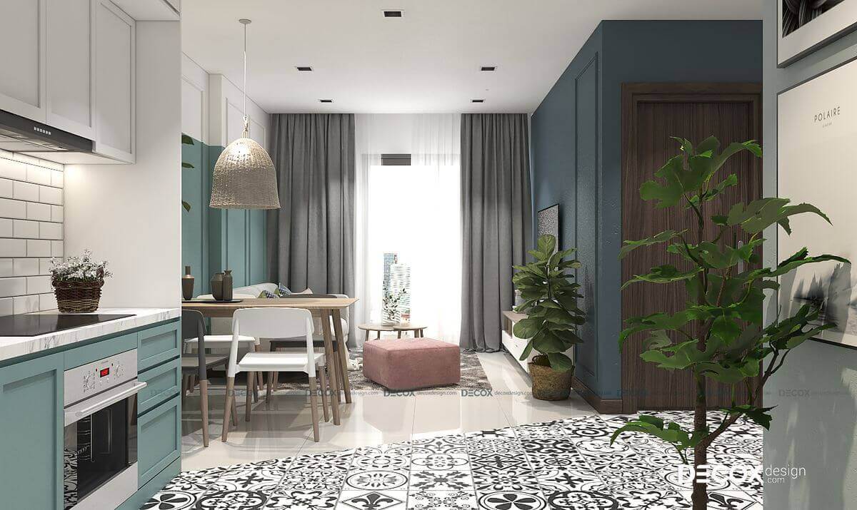 Để tạo nên không gian sống mát mẻ và thông thoáng cho căn hộ có diện tích nhỏ, Decox Design lựa chọn gam màu pastel trở thành màu chủ đạo trong thiết kế nội thất căn hộ Hado Centrosa này. Cây xanh cũng được bố trí ở nhiều vị trí trong căn hộ để mang đến không gian sống lành mạnh, hòa hợp với thiên nhiên cho gia chủ.