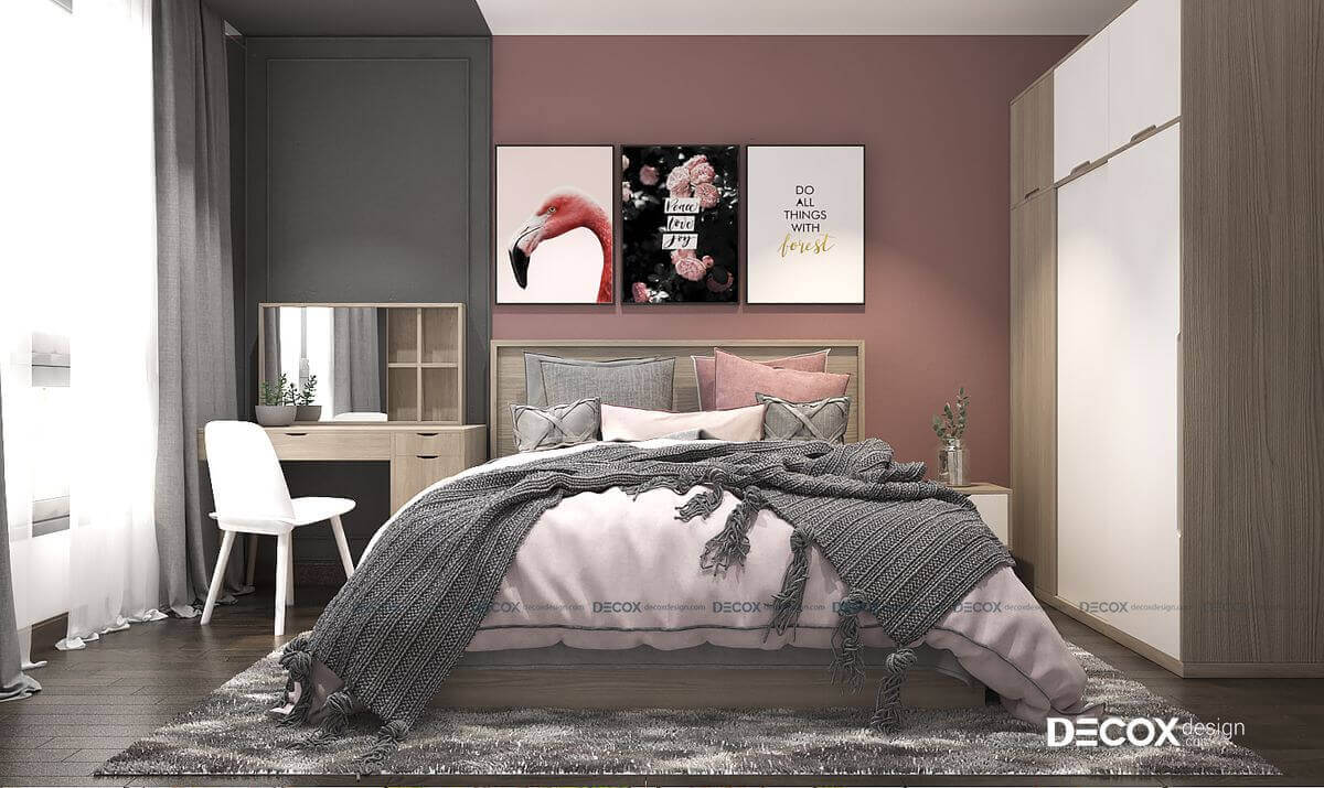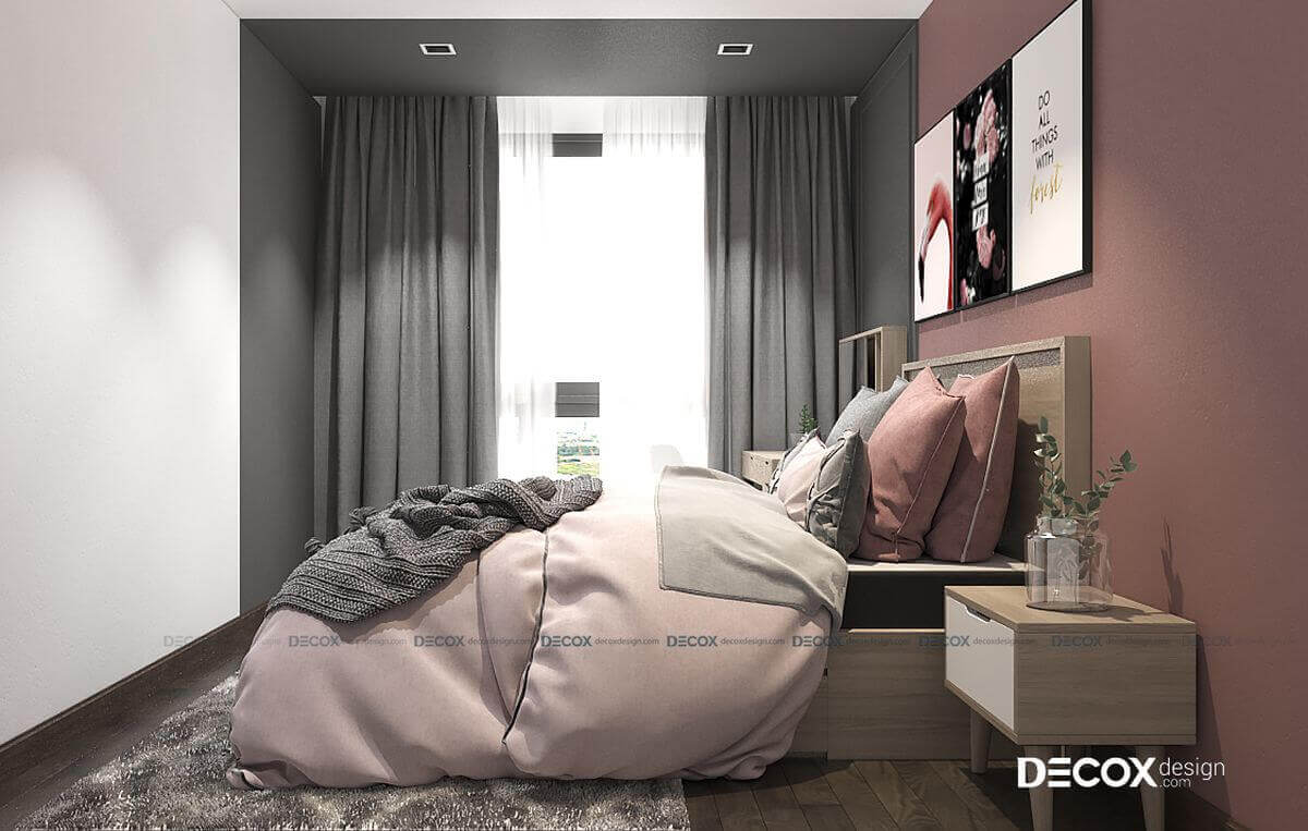 Màu hồng nữ tính được sử dụng làm gam màu chính trong thiết kế nội thất phòng ngủ. Ngoài ra, giường ngủ được thiết kế với phần hộc tủ dưới gầm để gia chủ có thể sắp xếp đồ đạc vào bên trong, vừa tối ưu diện tích sử dụng, vừa tăng tính thẩm mỹ cho nội thất phòng.