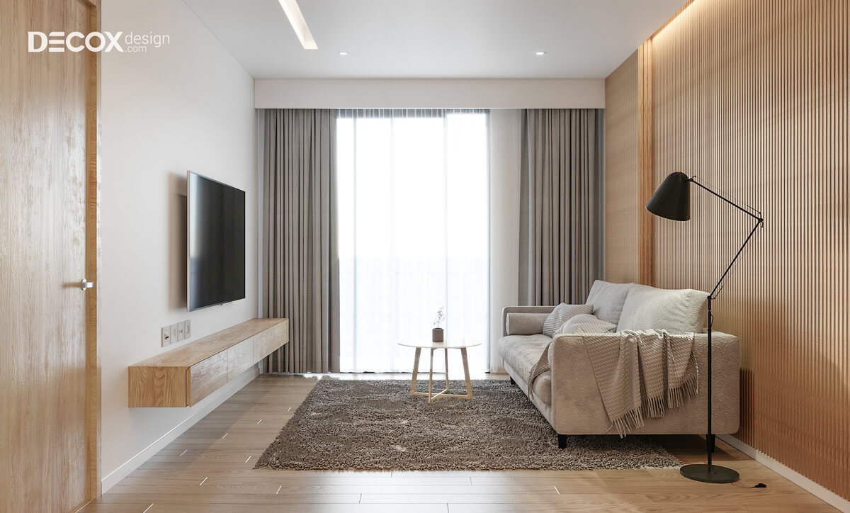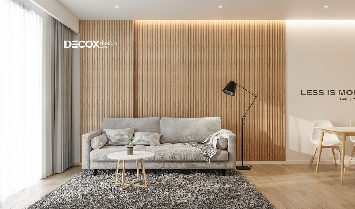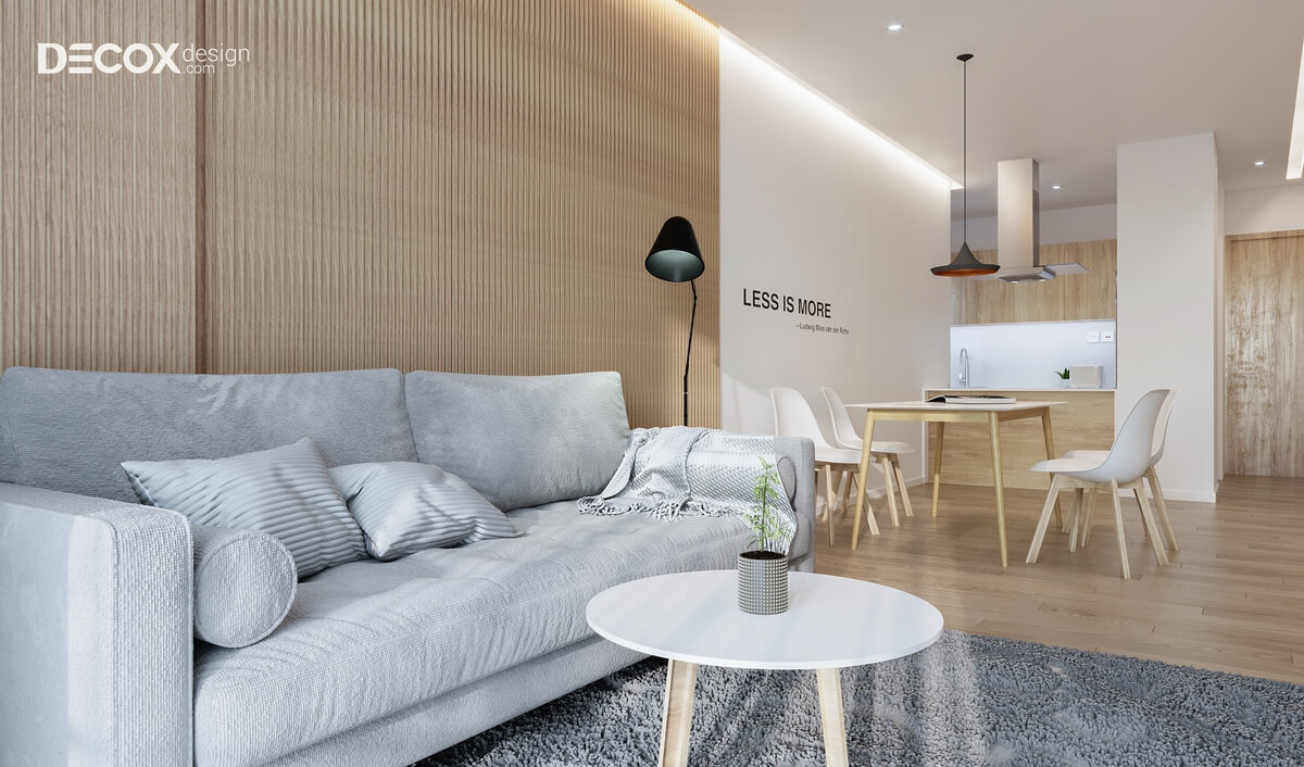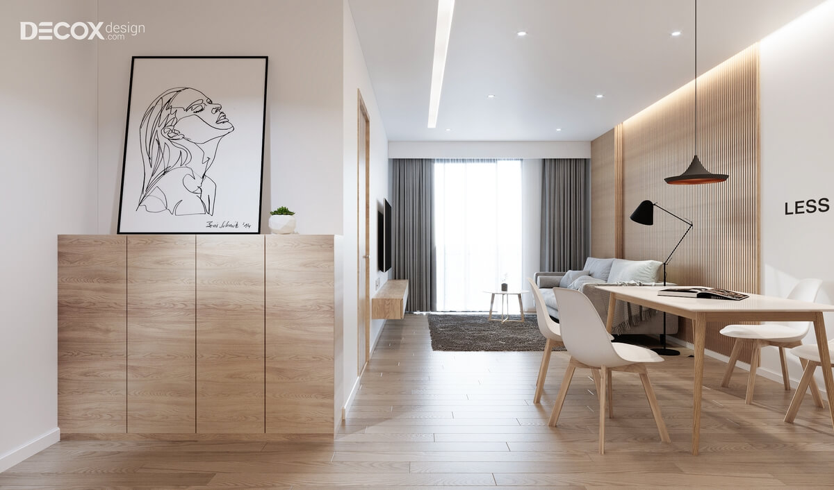 Thiết kế nội thất theo phong cách tối giản cùng sự kết hợp hài hòa giữa các tông màu trung tính đã gợi lên một không gian duyên dáng, trang nhã. Từng mét vuông trong căn hộ Hado Centrosa 76m2 được thiết kế tỉ mỉ và phù hợp với gu thẩm mỹ của chủ nhân. Các vật dụng bằng gỗ được sử dụng khéo léo và tạo nên những đường nét mới lạ trong thiết kế nội thất căn hộ chung cư.