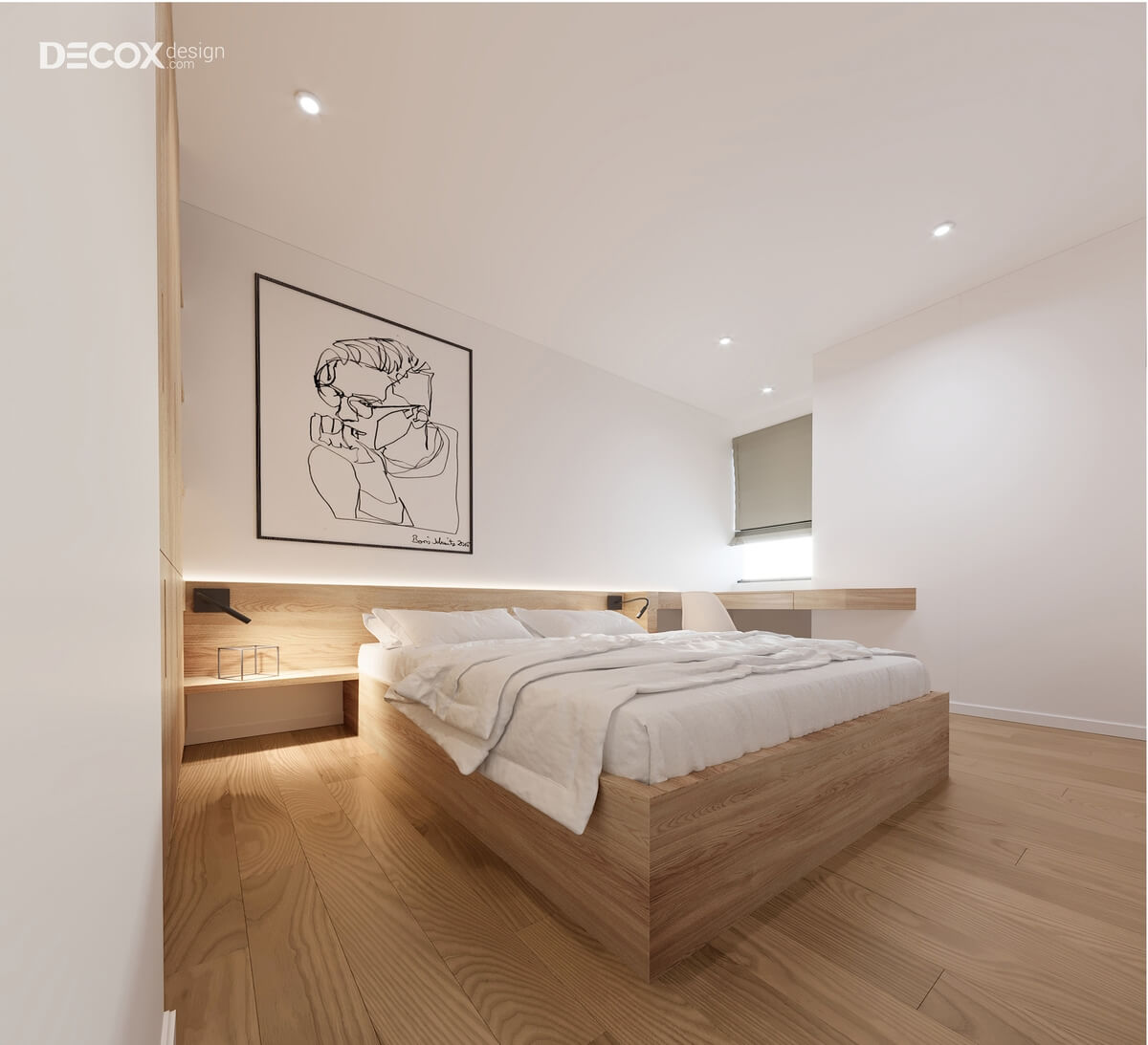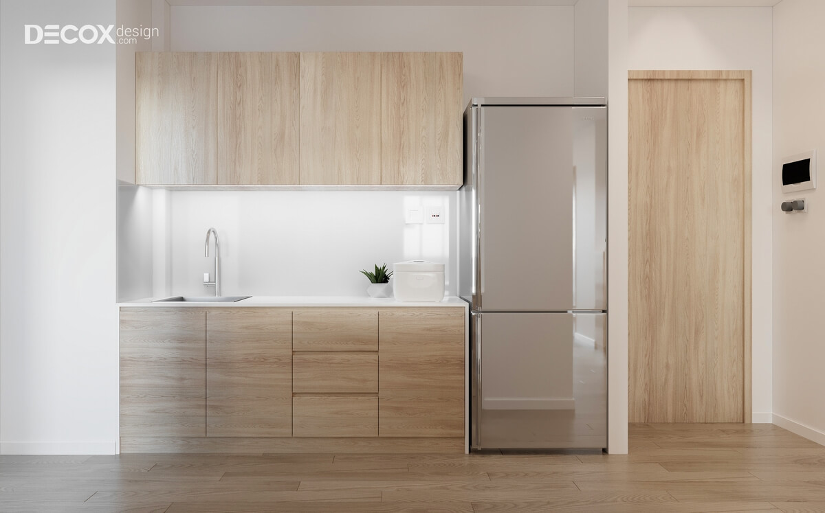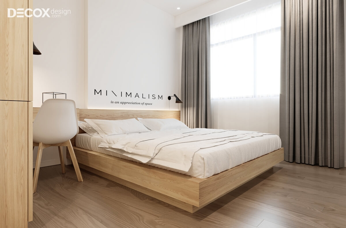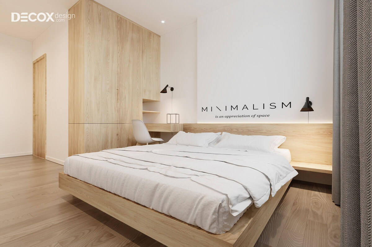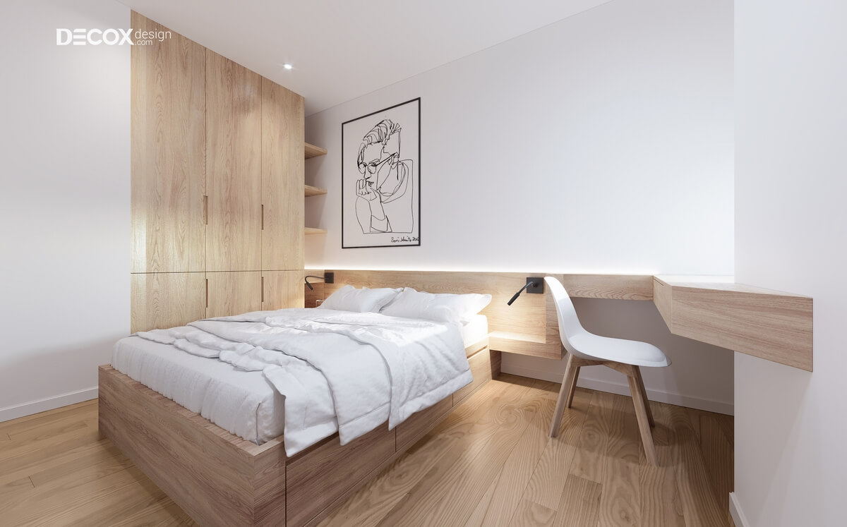 Điểm chấm phá độc đáo mà Decox Design đã tạo nên trong thiết kế nội thất phòng ngủ nhỏ đó là tủ đựng quần áo được thiết kế âm tường. Việc thiết kế tinh tế này đã giúp cho không gian phòng luôn rộng rãi, thông thoáng. Bên cạnh đó, với giường ngủ có ngăn kéo, chủ nhân sẽ có nhiều lựa chọn hơn trong việc lưu trữ.