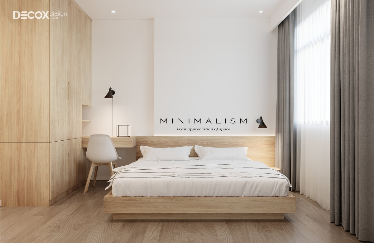 Thiết kế nội thất phòng ngủ với trần nhà màu trắng mang đến cảm giác dễ chịu, thoáng mát cho chủ nhân. Giường ngủ, bàn làm việc, tủ đựng quần áo với màu sắc ấm áp của gỗ đã làm toát lên một không gian thật thư thái. Ngoài ra, với cửa sổ rộng chủ nhân sẽ cảm thấy không gian phòng luôn tràn đầy năng lượng.