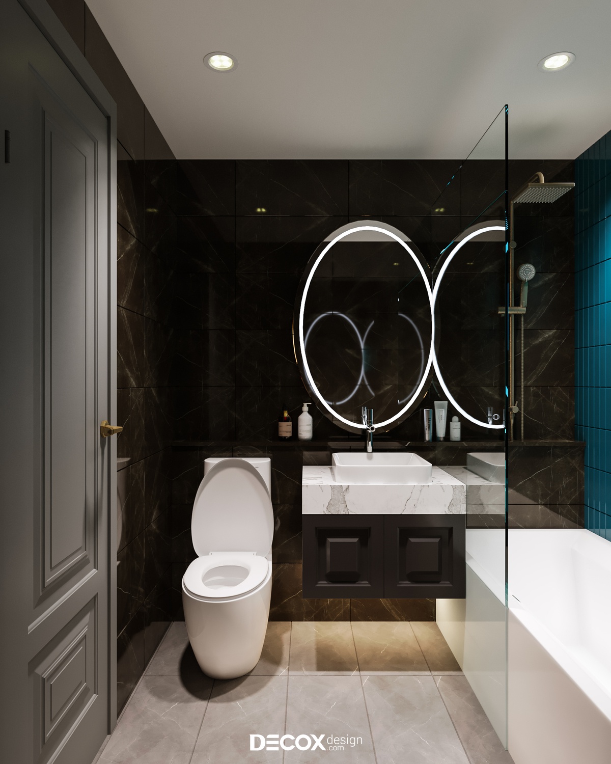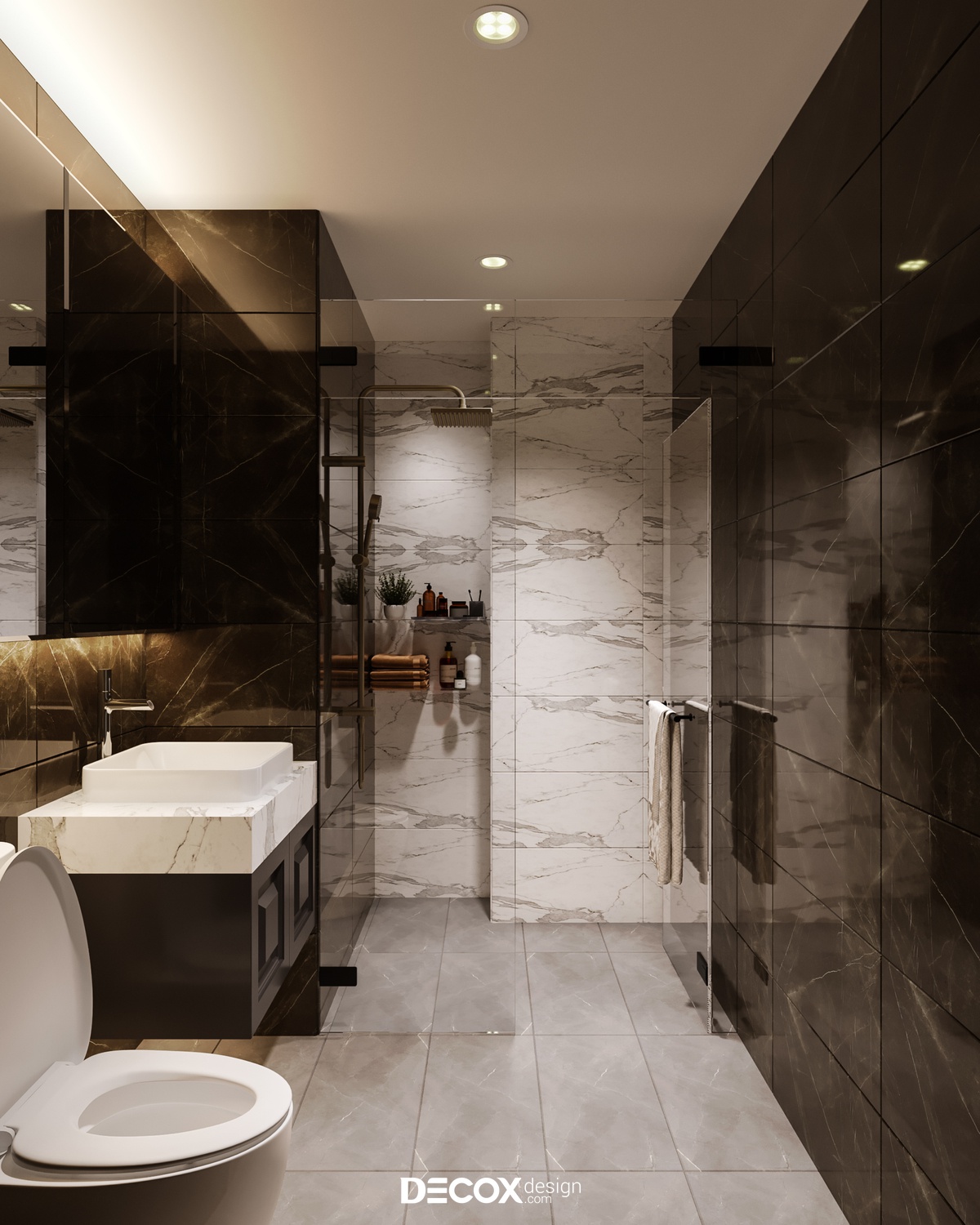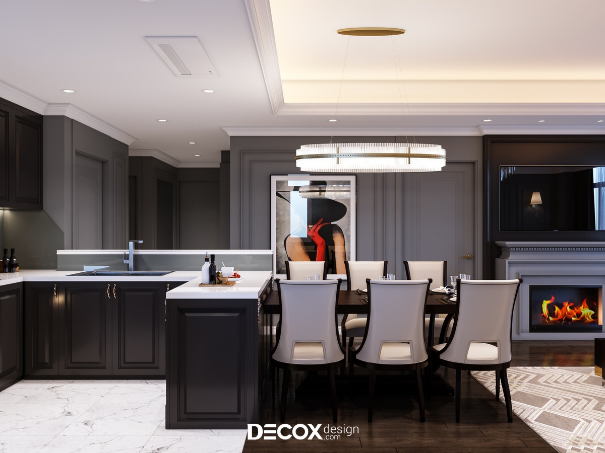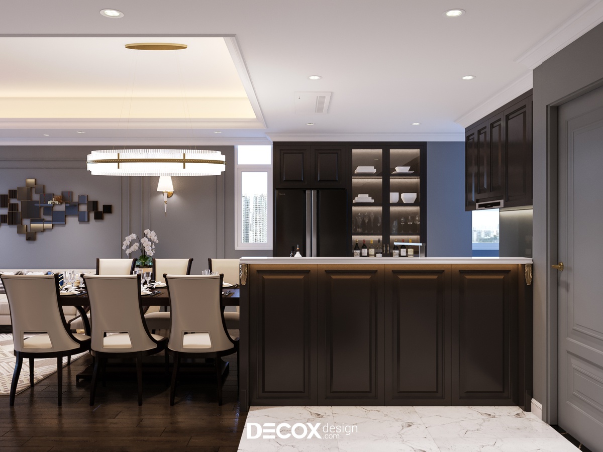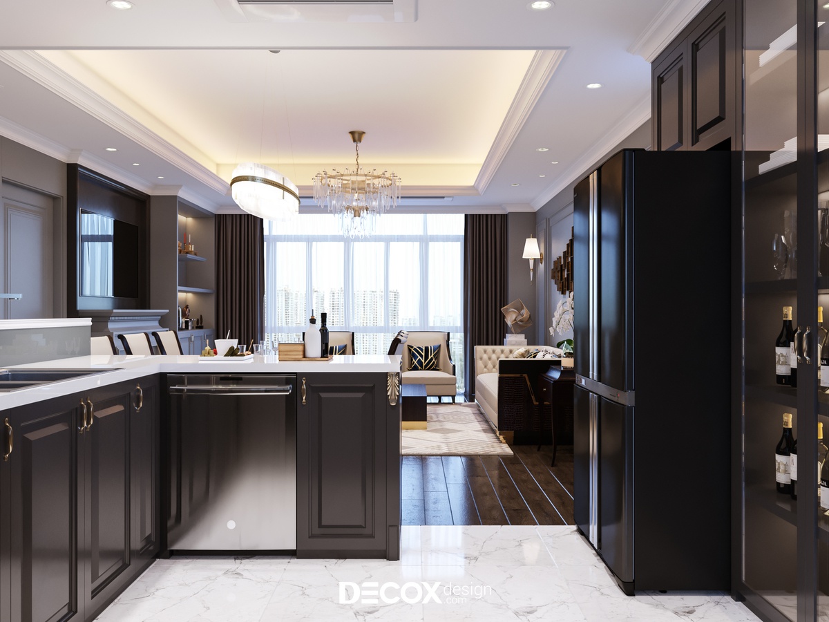 Khác với bố cục phân khu của những căn hộ khác, từ vị trí cửa ra vào để đến được phòng khách bạn phải đi qua phòng bếp trước. Do đó, khu vực bếp trong mẫu thiết kế này đóng vai trò rất quan trọng quyết định đến vẻ đẹp thẩm mỹ. Ở đây Decox Design chọn lựa thiết kế bếp theo dạng hình chữ U mềm mại che đi những khuyết điểm góc cạnh của tường. Hệ tủ bếp với tone đen thanh lịch, cá tính điểm xuyến thêm bề mặt đá trắng kết hợp cùng tủ rượu kính sang trọng hứa hẹn sẽ ghi điểm ấn tượng trong mắt khách đến thăm nhà.