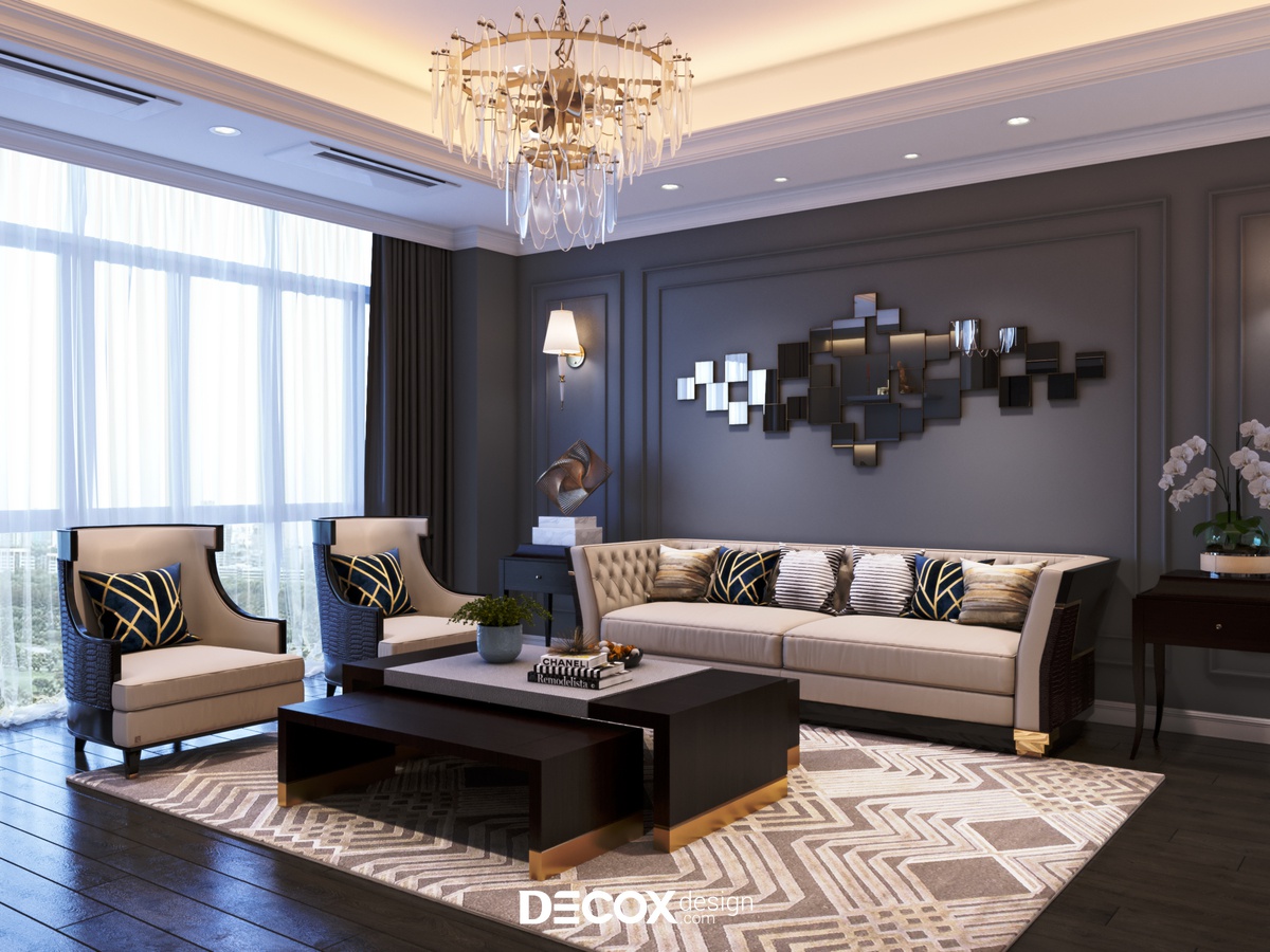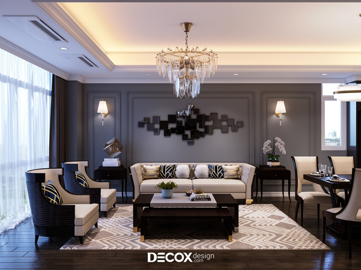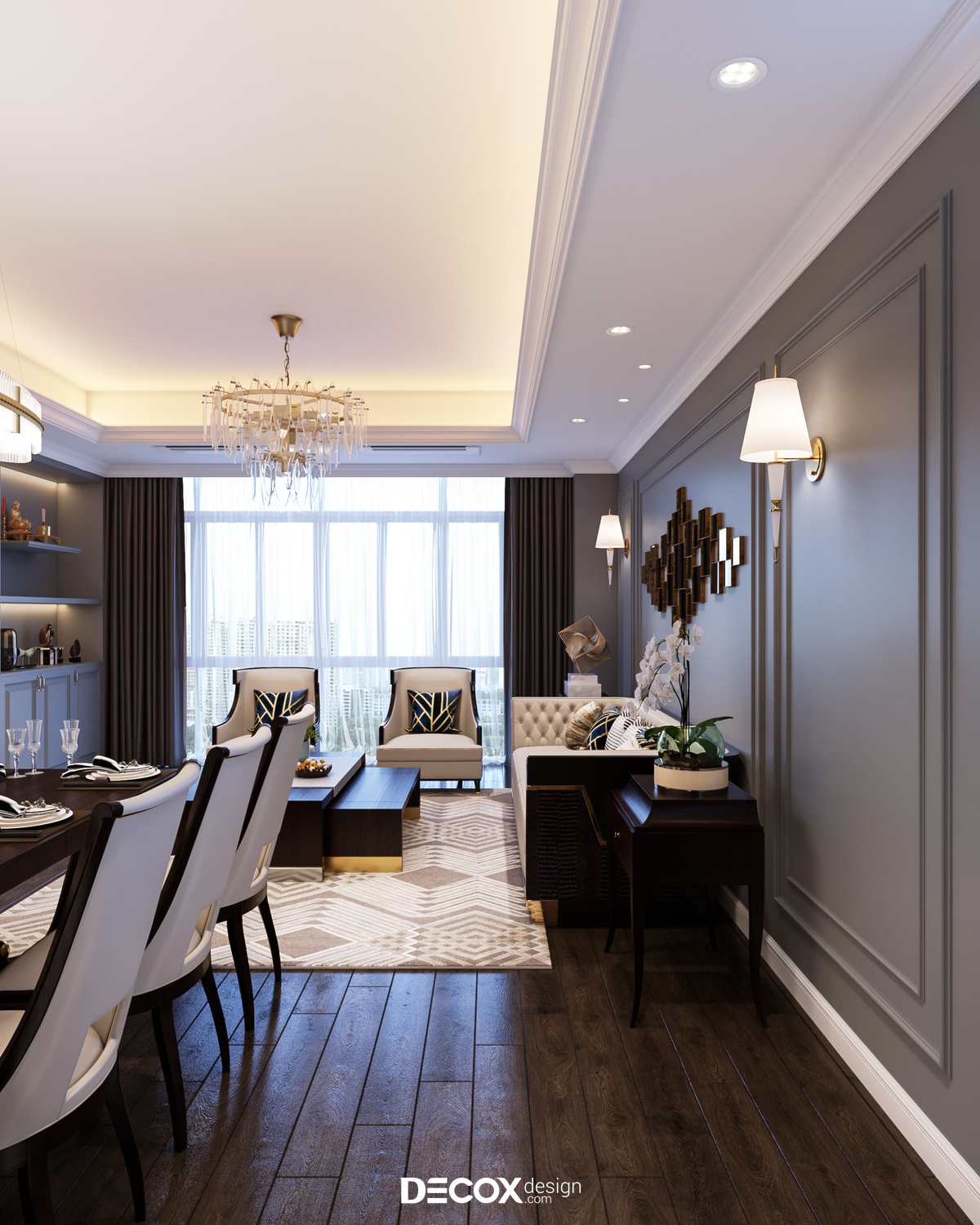 Phong cách bán cổ điển luôn được nhiều gia chủ yêu thích và chọn lựa khi thiết kế nội thất nhằm kiến tạo nên một không gian vừa tiện nghi, hiện đại mà vẫn có thể giữ được nét trang nhã và cổ cách trong đường nét thiết kế. Thế nên các KTS của Decox Design đã ứng dụng phong cách này vào căn hộ Imperia 107m2. Với tone nền trắng làm chủ đạo, sàn lát gỗ tự nhiên kết hợp cùng những đường phào chỉ đơn giản làm toát lên nét đẹp thanh thoát của căn hộ. Vật dụng nội thất cũng ưu tiên sử dụng các loại có kiểu dáng hoài cổ nhã nhặn, chất liệu da và gỗ cho tổ ấm thêm phần sang trọng, cuốn hút.